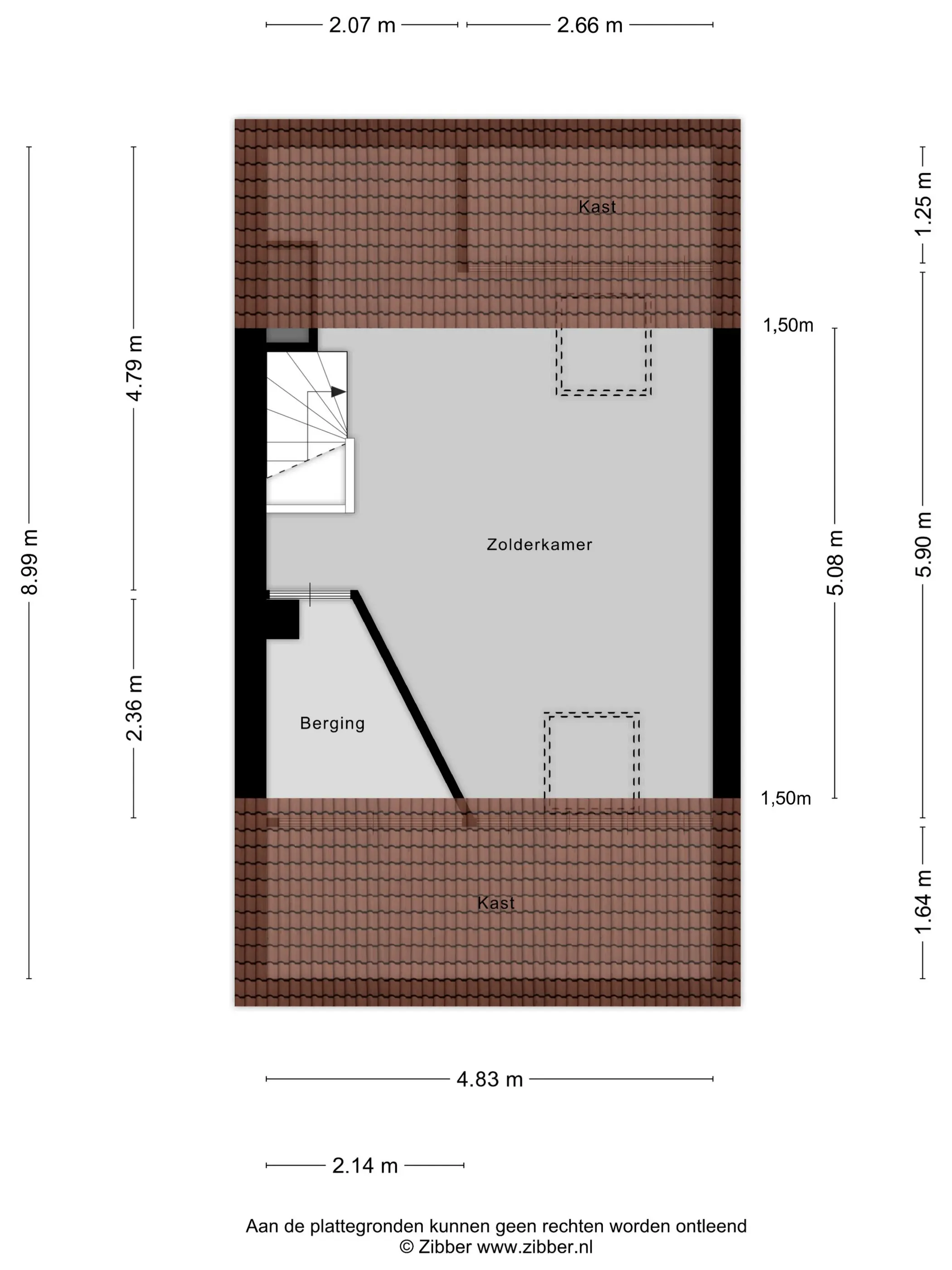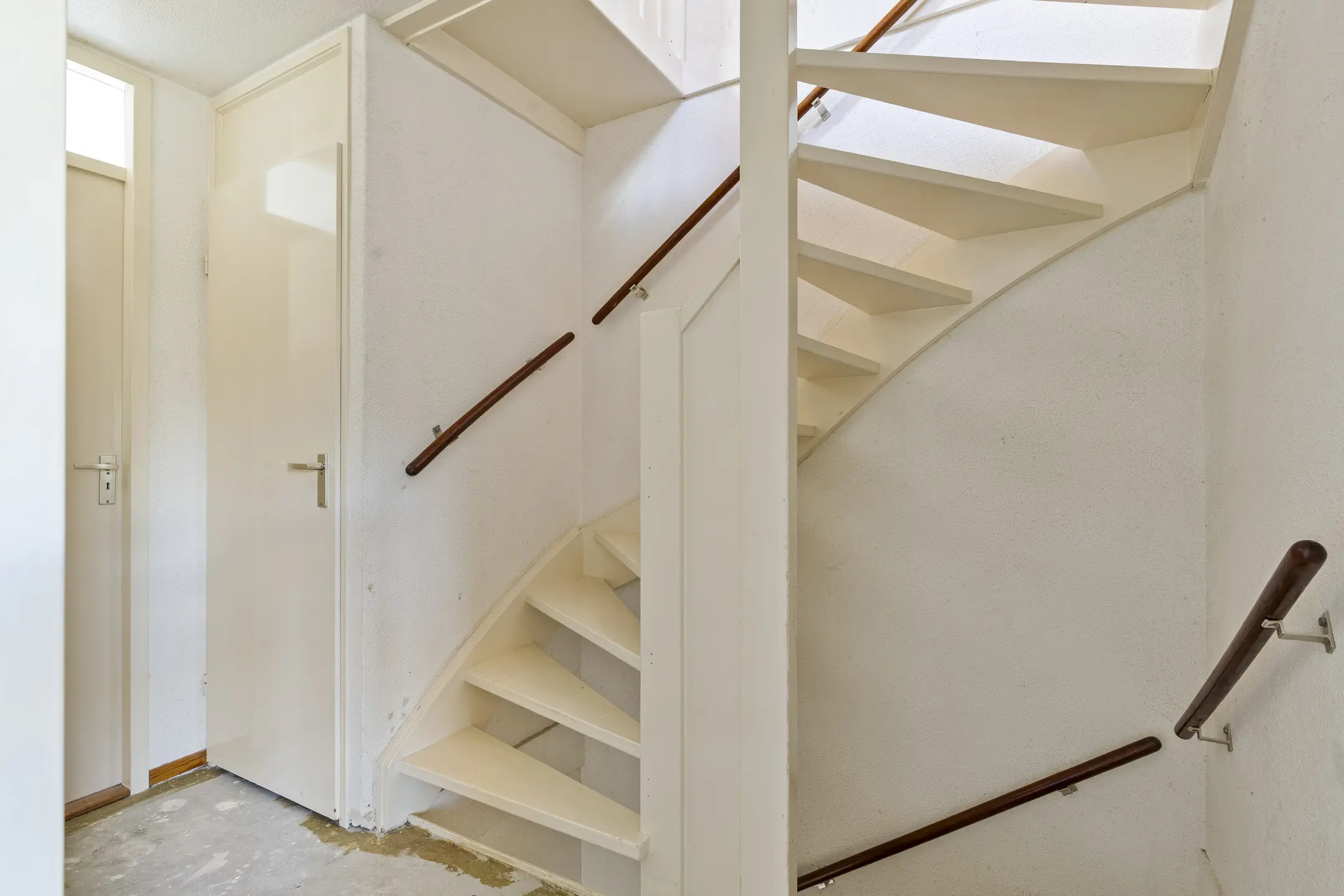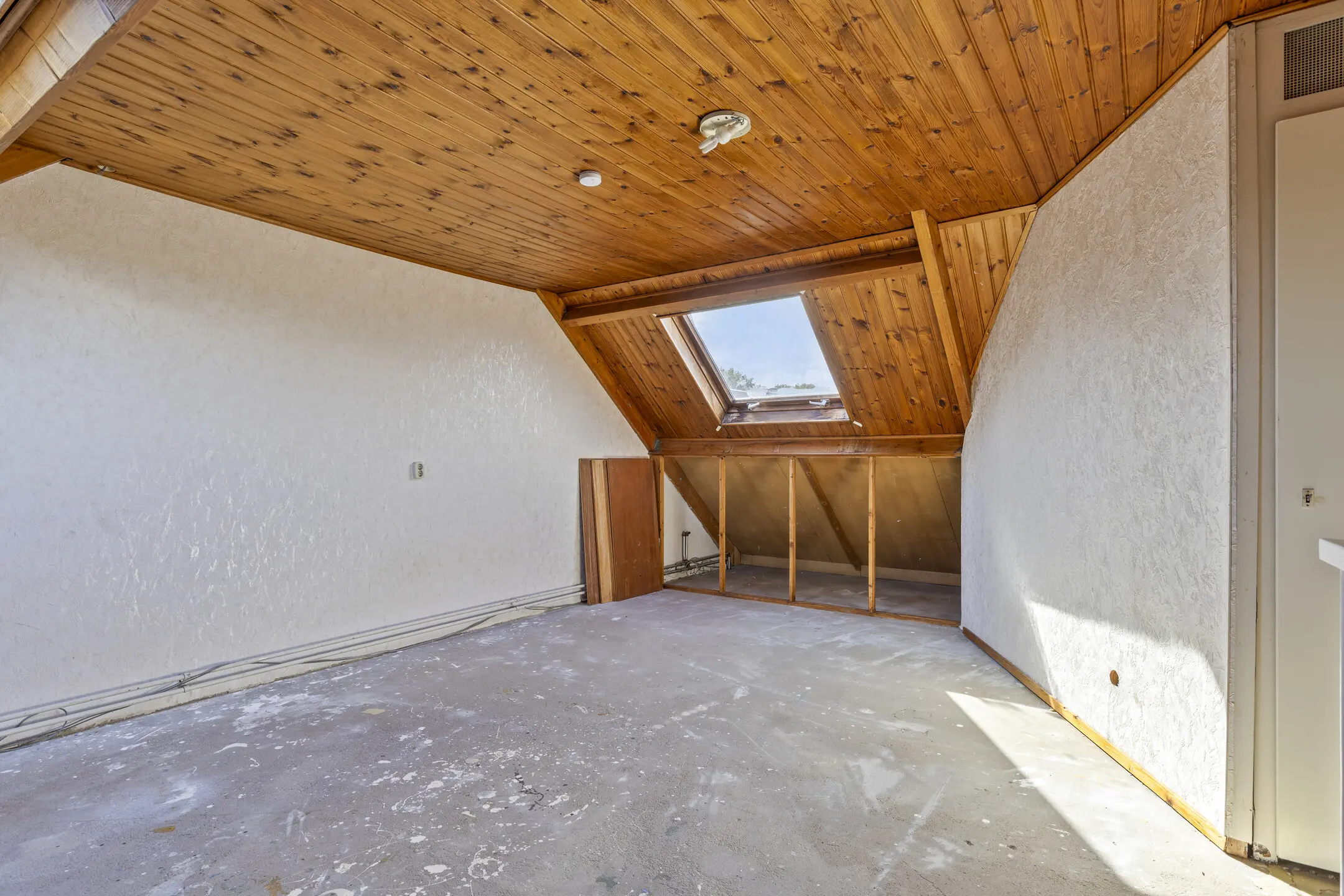 Middels vaste trap bereikbare open zolderruimte met aan beide zijden een groot dakraam en veel bergruimte achter de knieschotten. Het is mogelijk hier één of twee slaapkamers te realiseren.