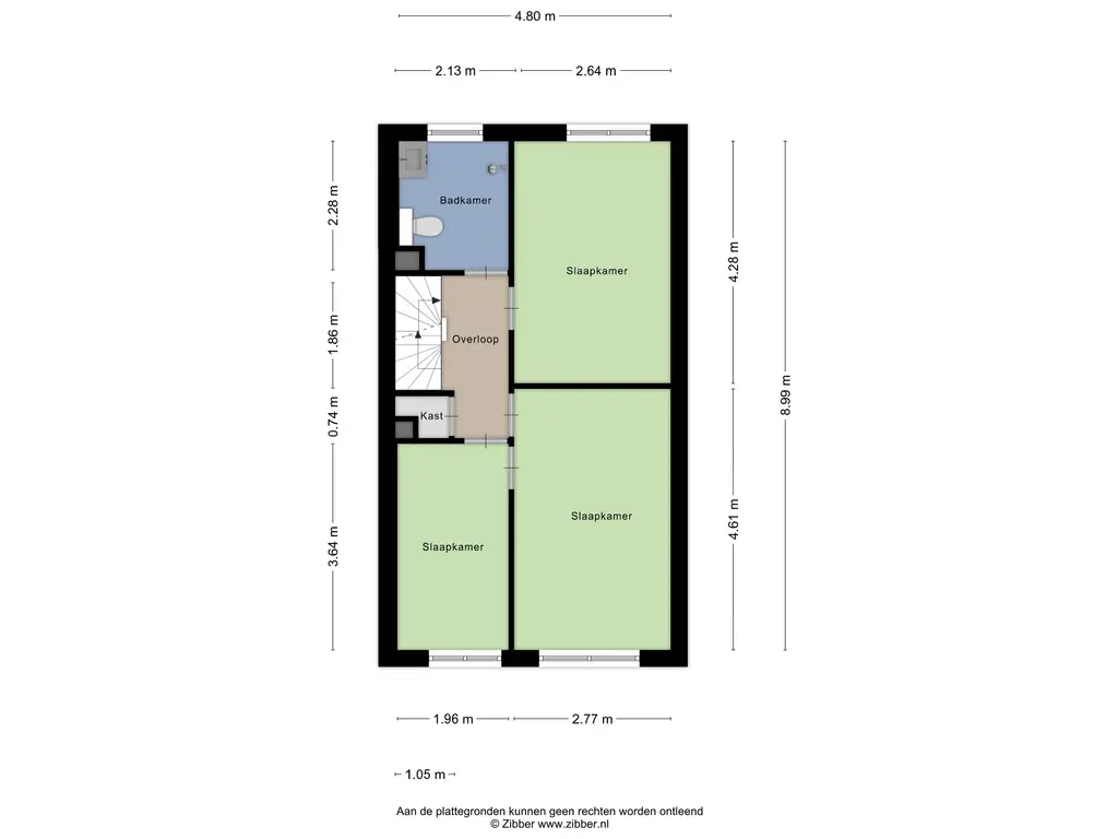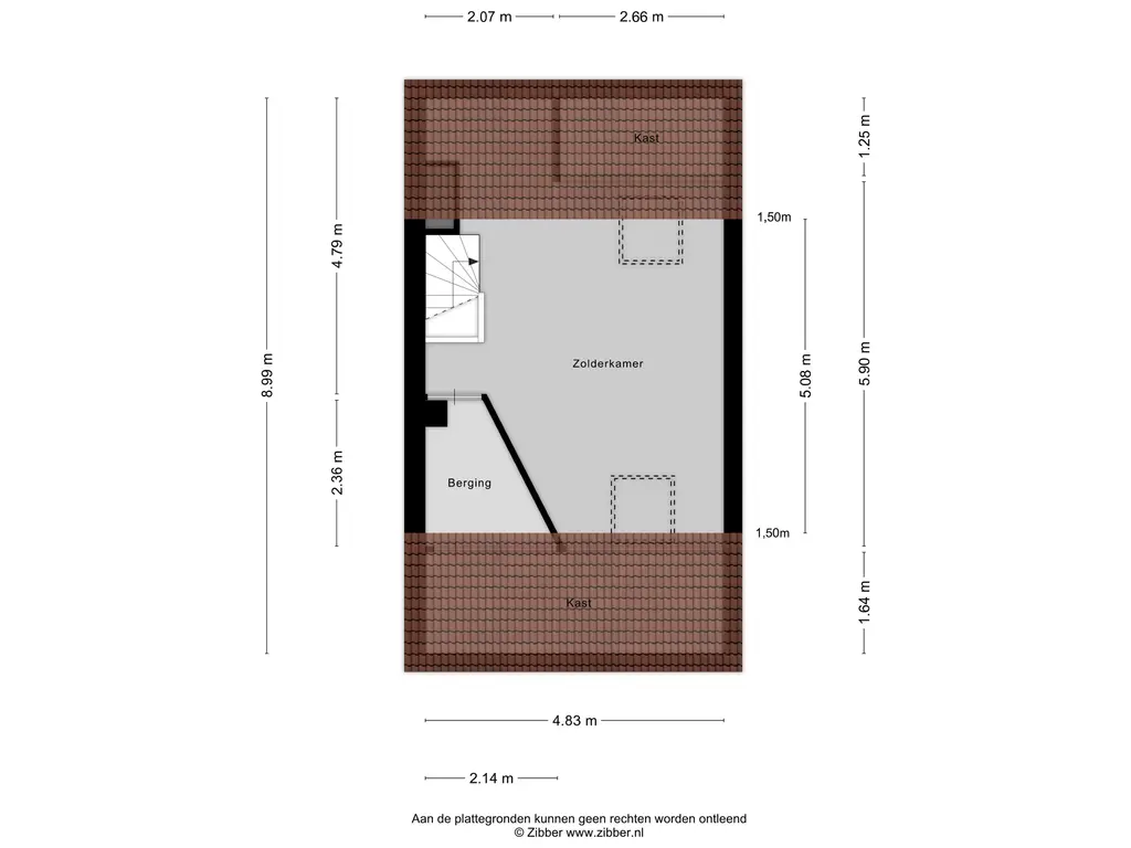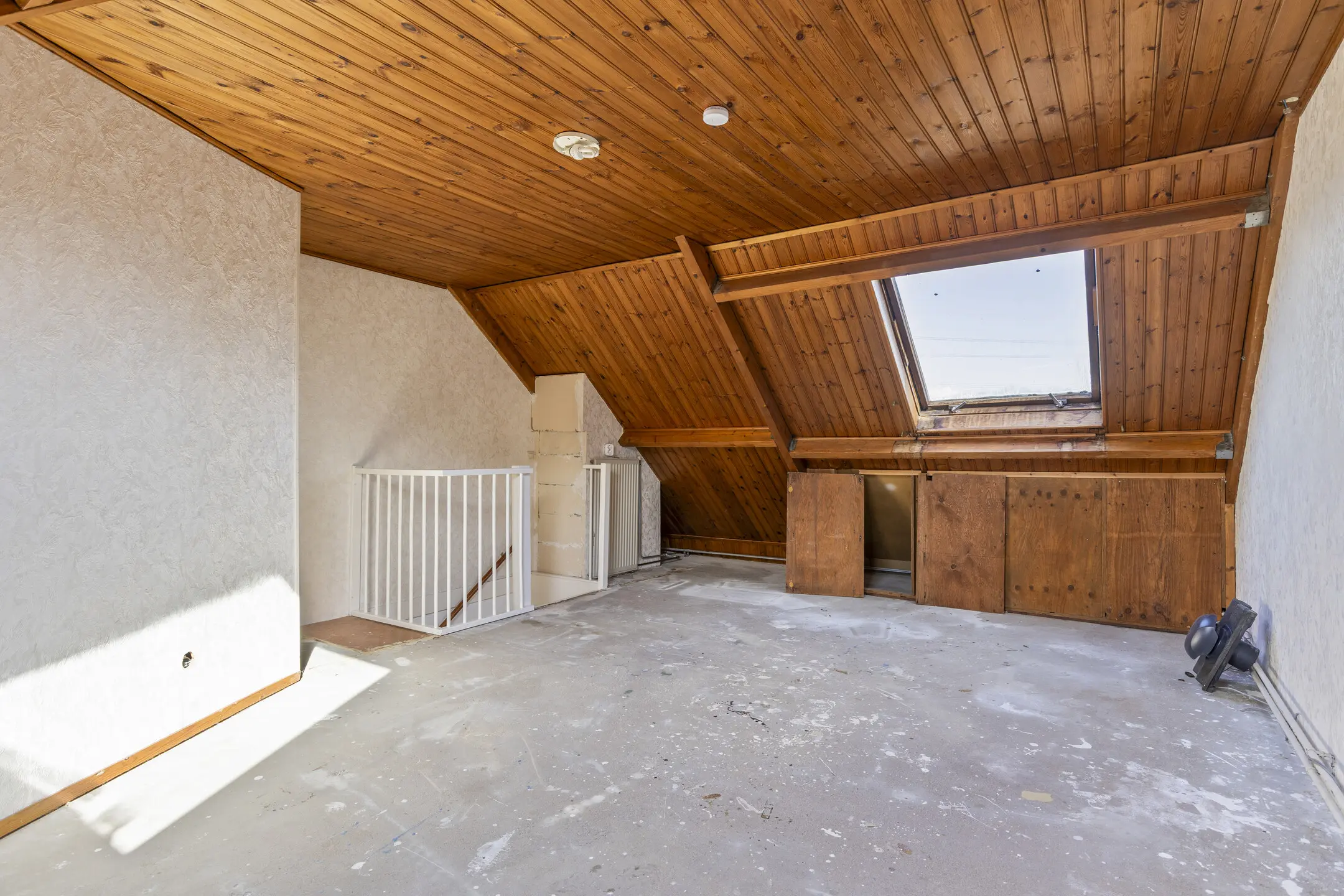 Middels vaste trap bereikbare open zolderruimte met aan beide zijden een groot dakraam en veel bergruimte achter de knieschotten. Het is mogelijk hier één of twee slaapkamers te realiseren.