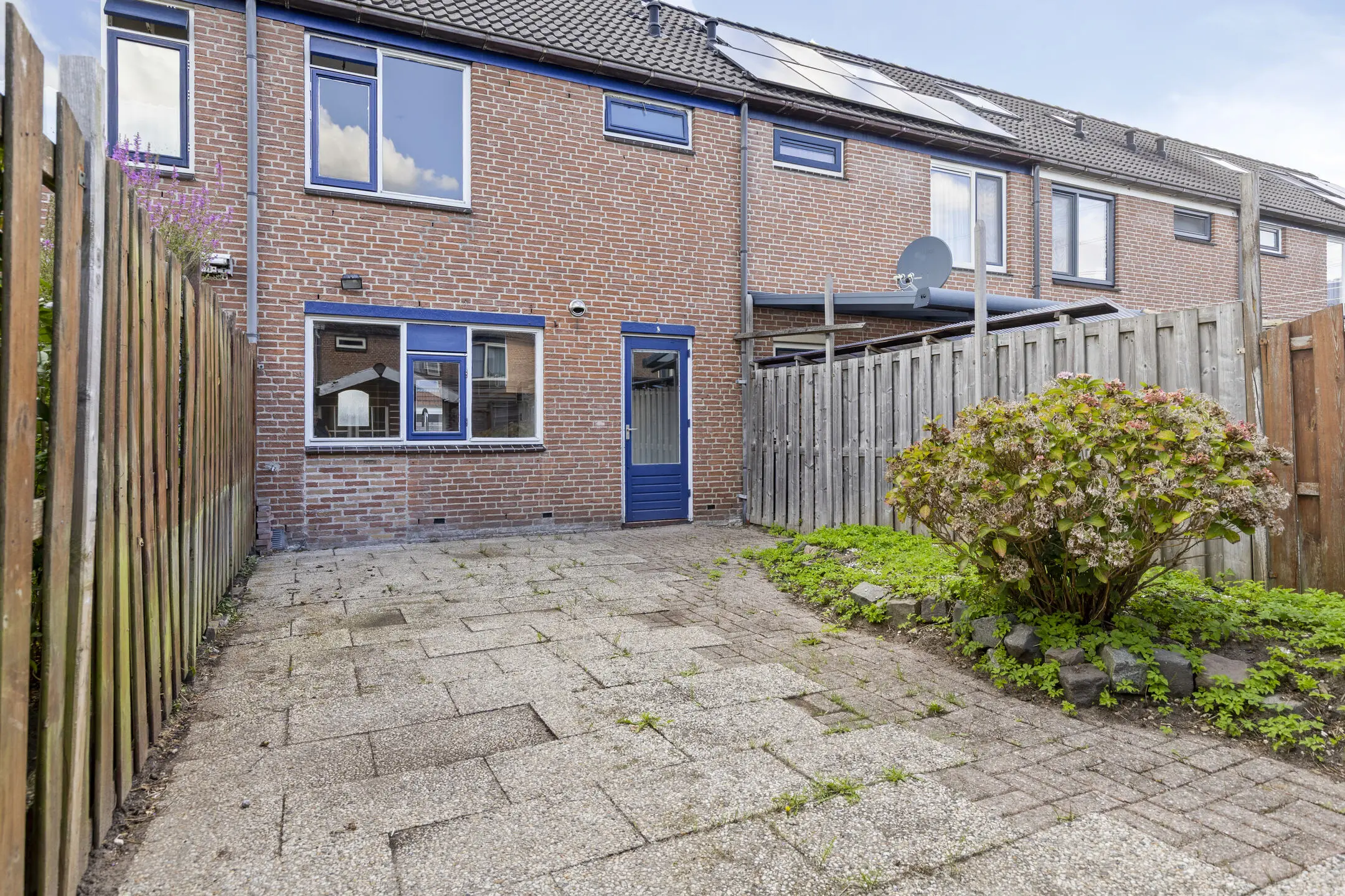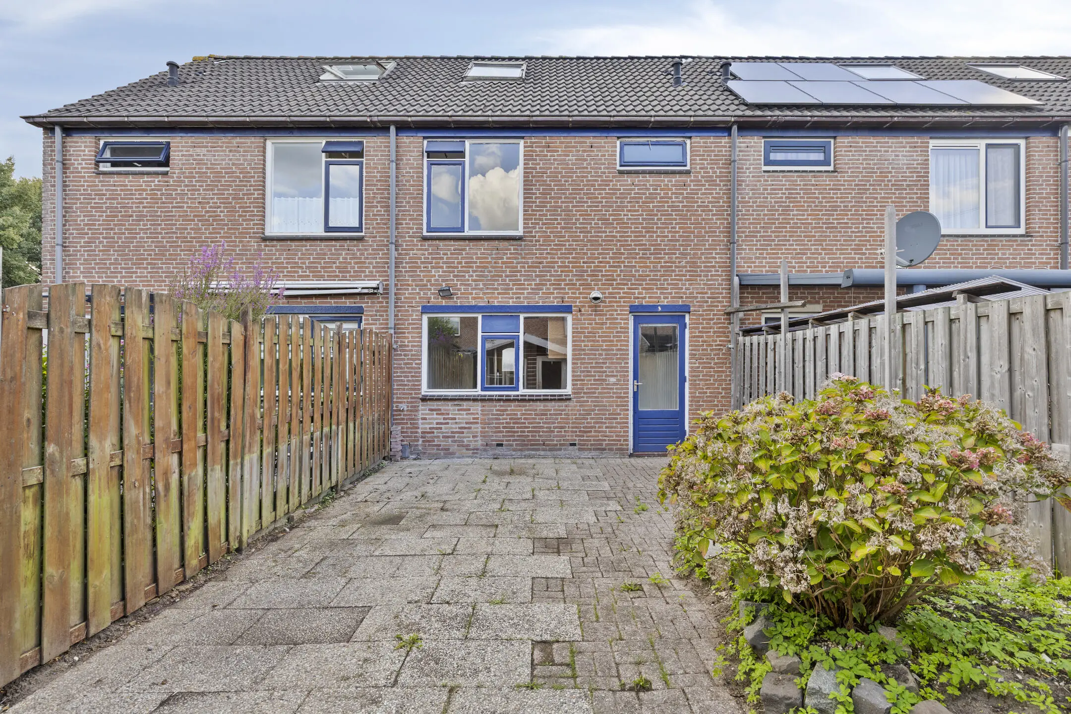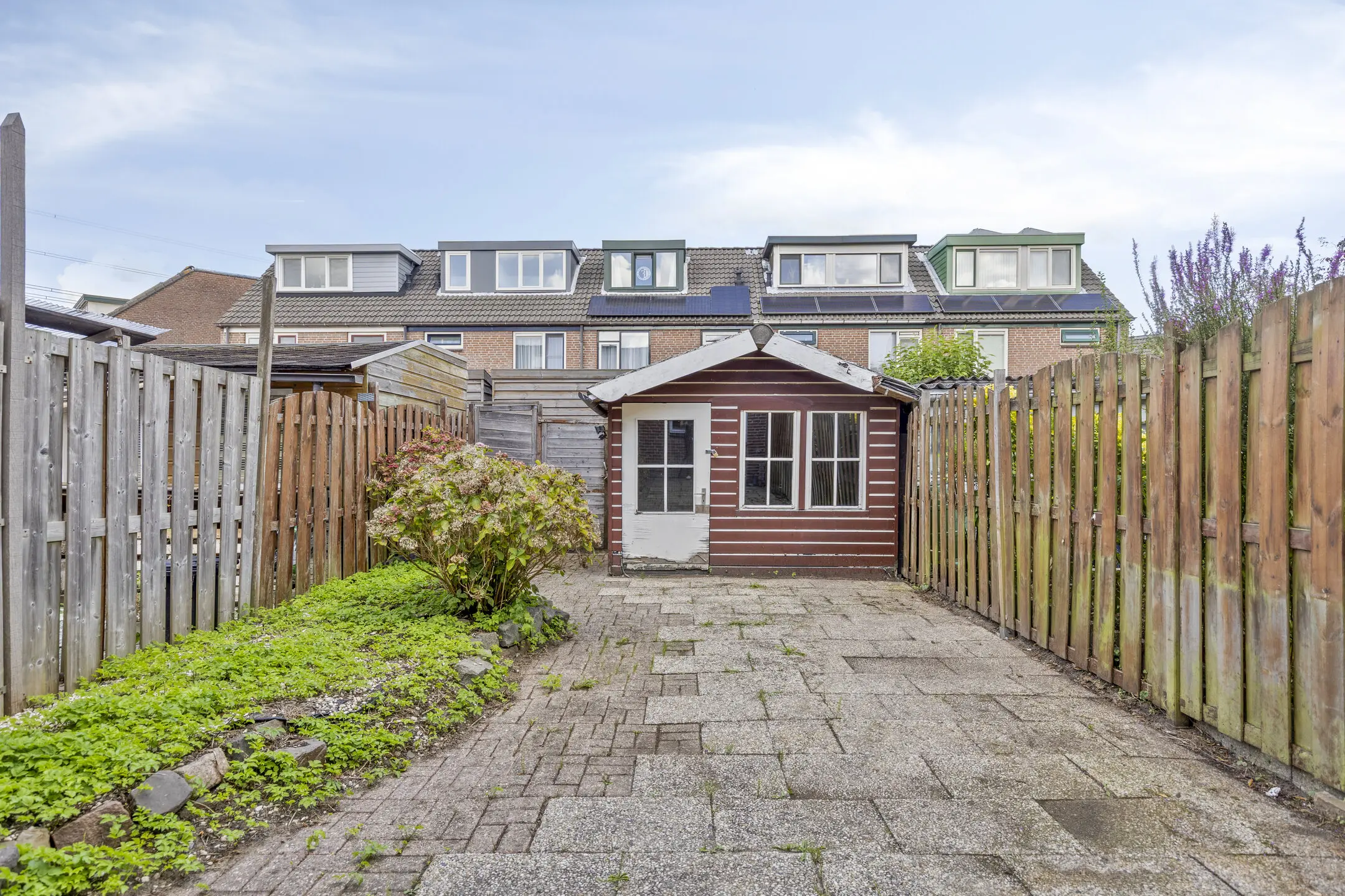 Op het oosten gelegen achtertuin met poort en stenen berging met elektra. De voortuin ligt op het westen.