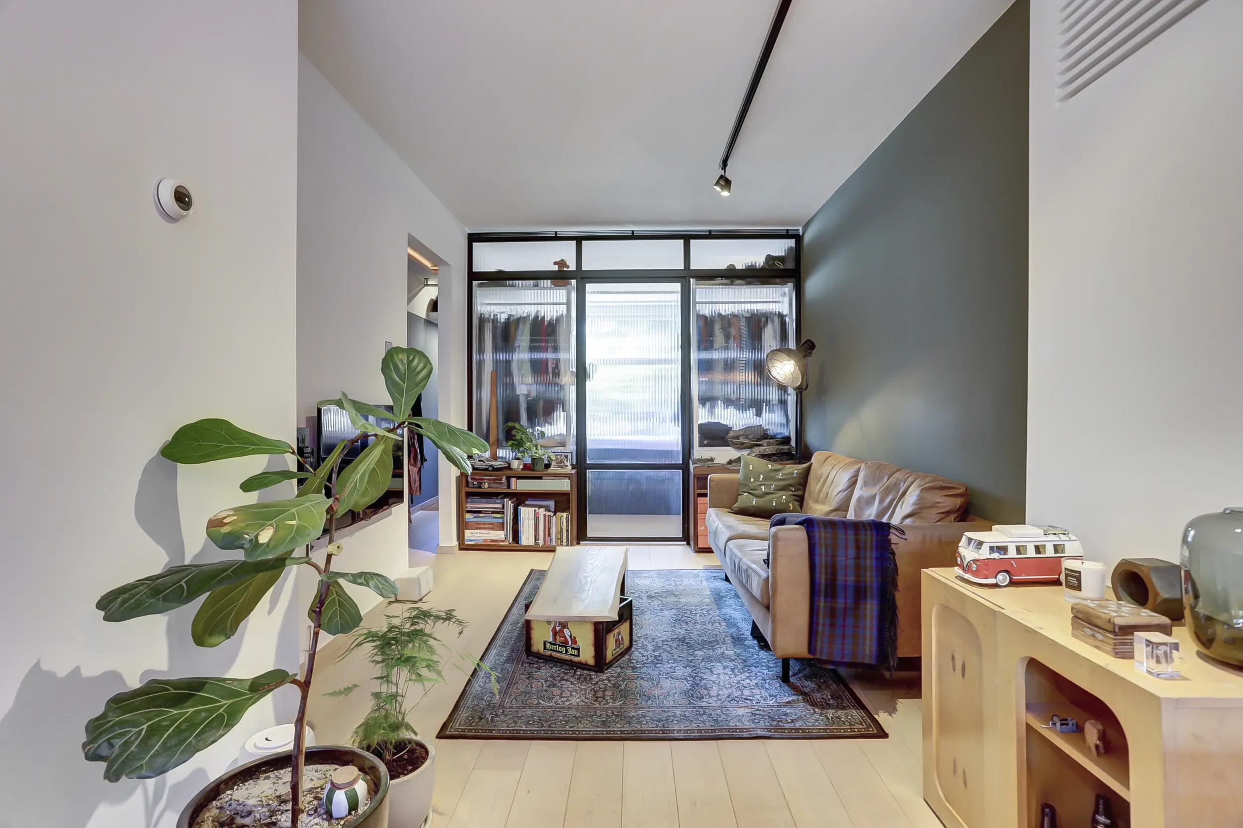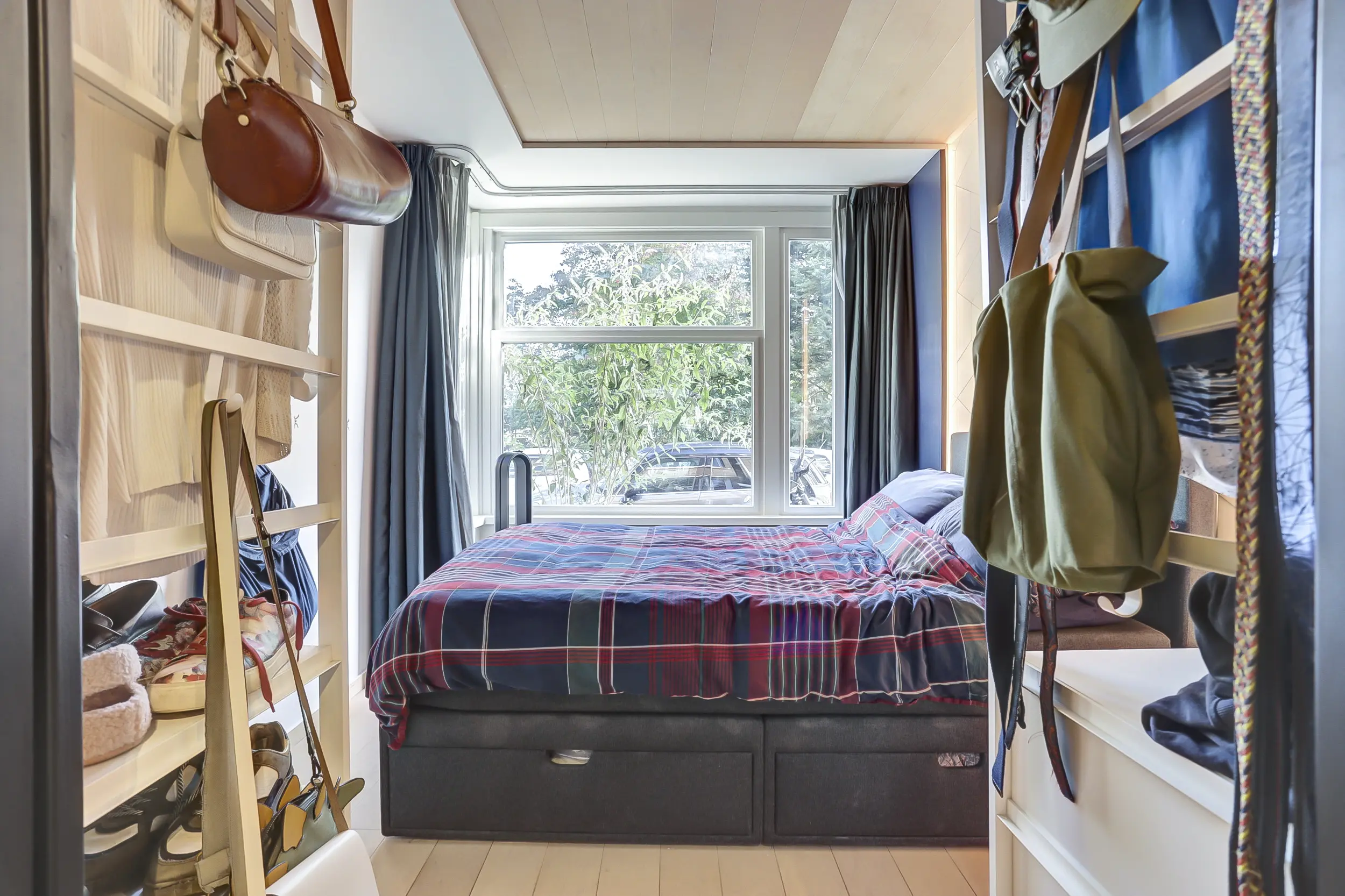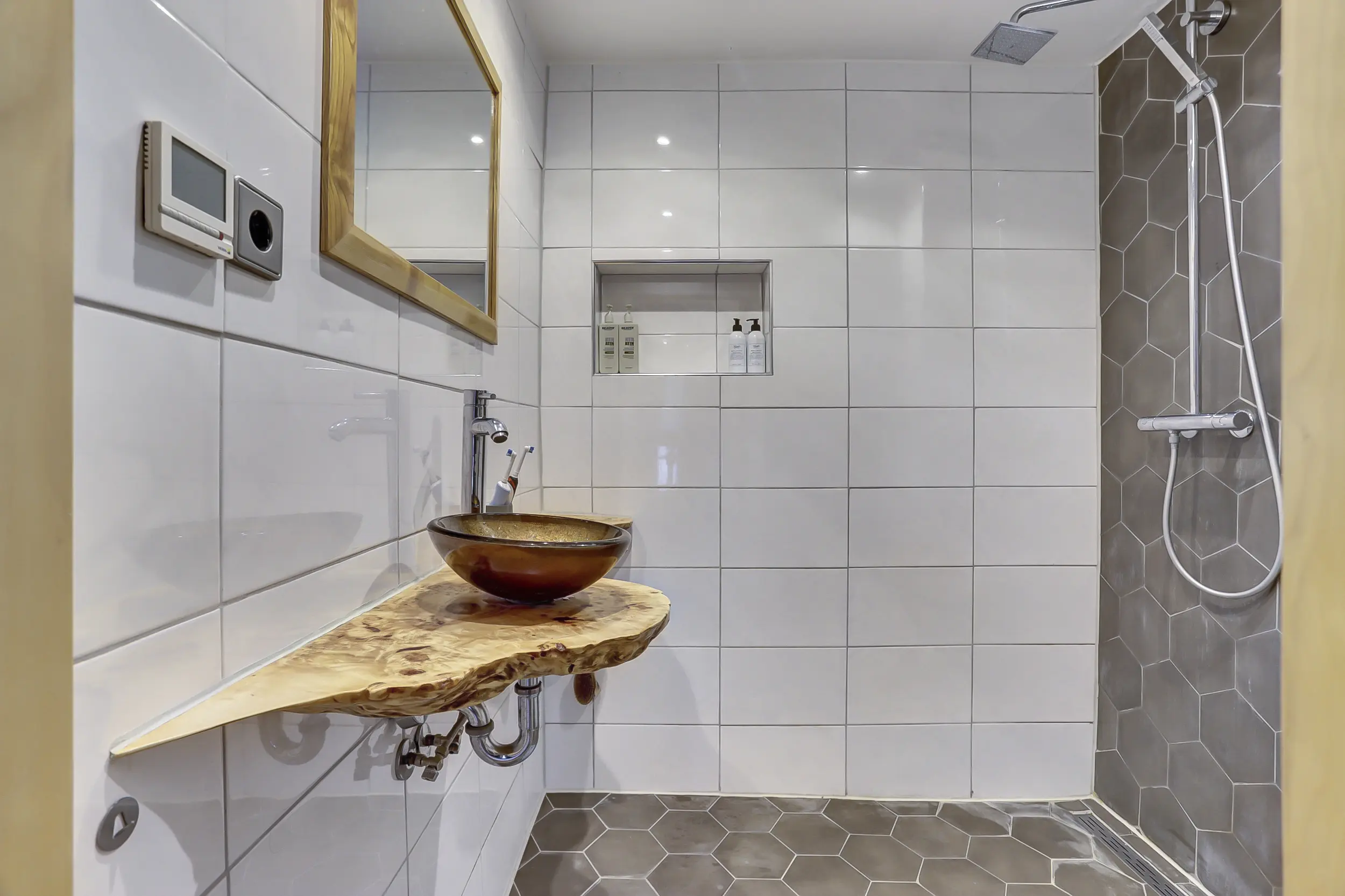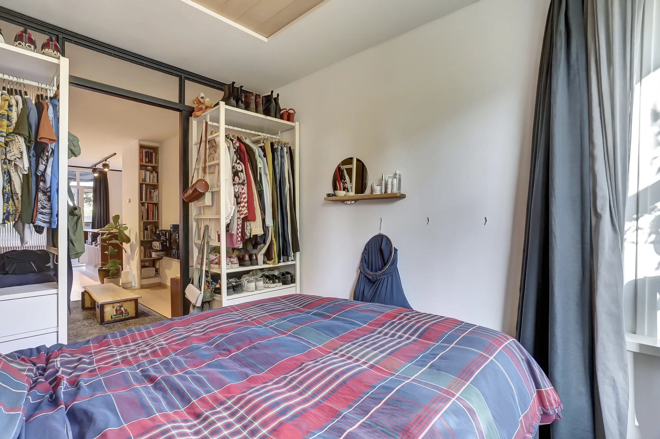 Aan de voorzijde vind je een sfeervolle slaapkamer, terwijl de moderne badkamer is voorzien van een inloopdouche, stijlvol wastafelmeubel, toilet en vloerverwarming voor extra comfort. De gehele woning ademt een eigentijdse, instapklare sfeer met strakke afwerking, en is bovendien uitgerust met airconditioning in de woonkamer en slaapkamer.