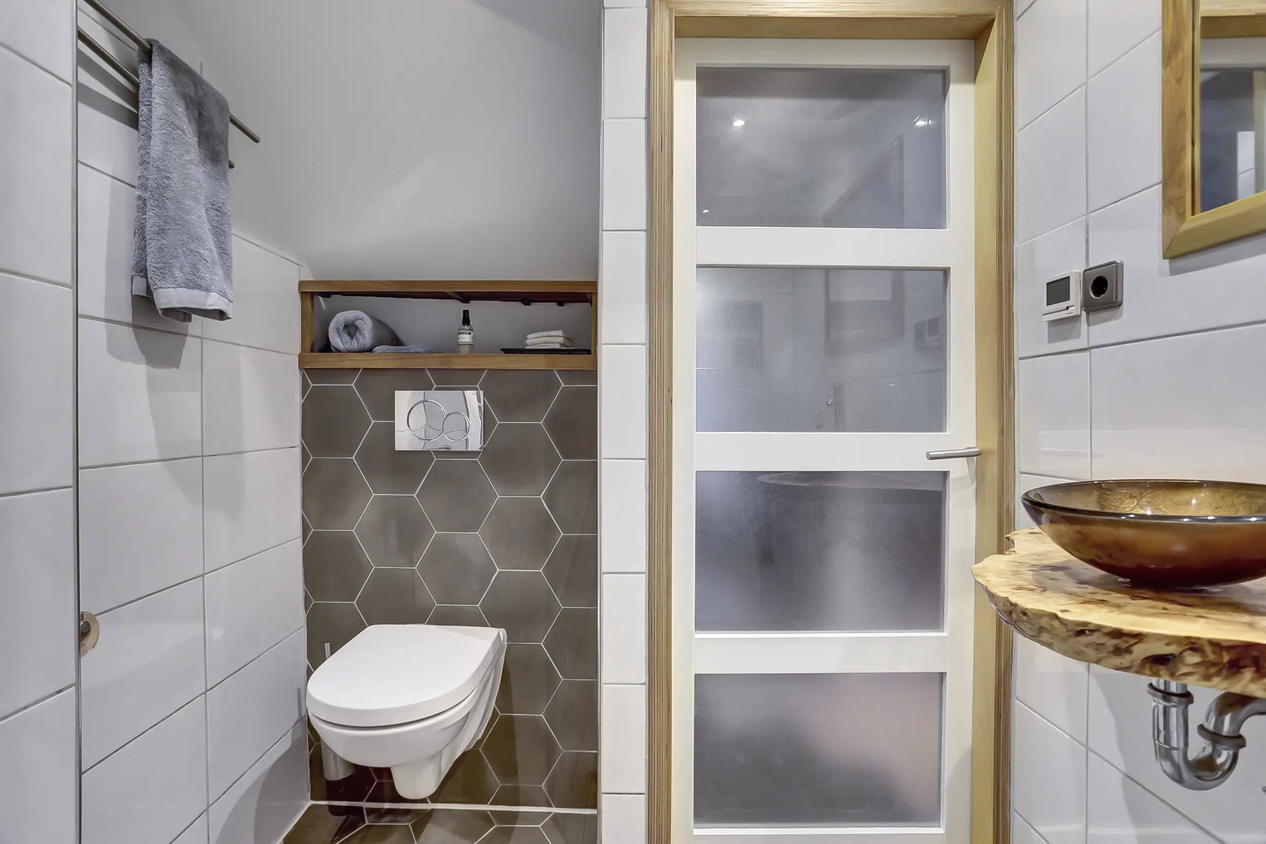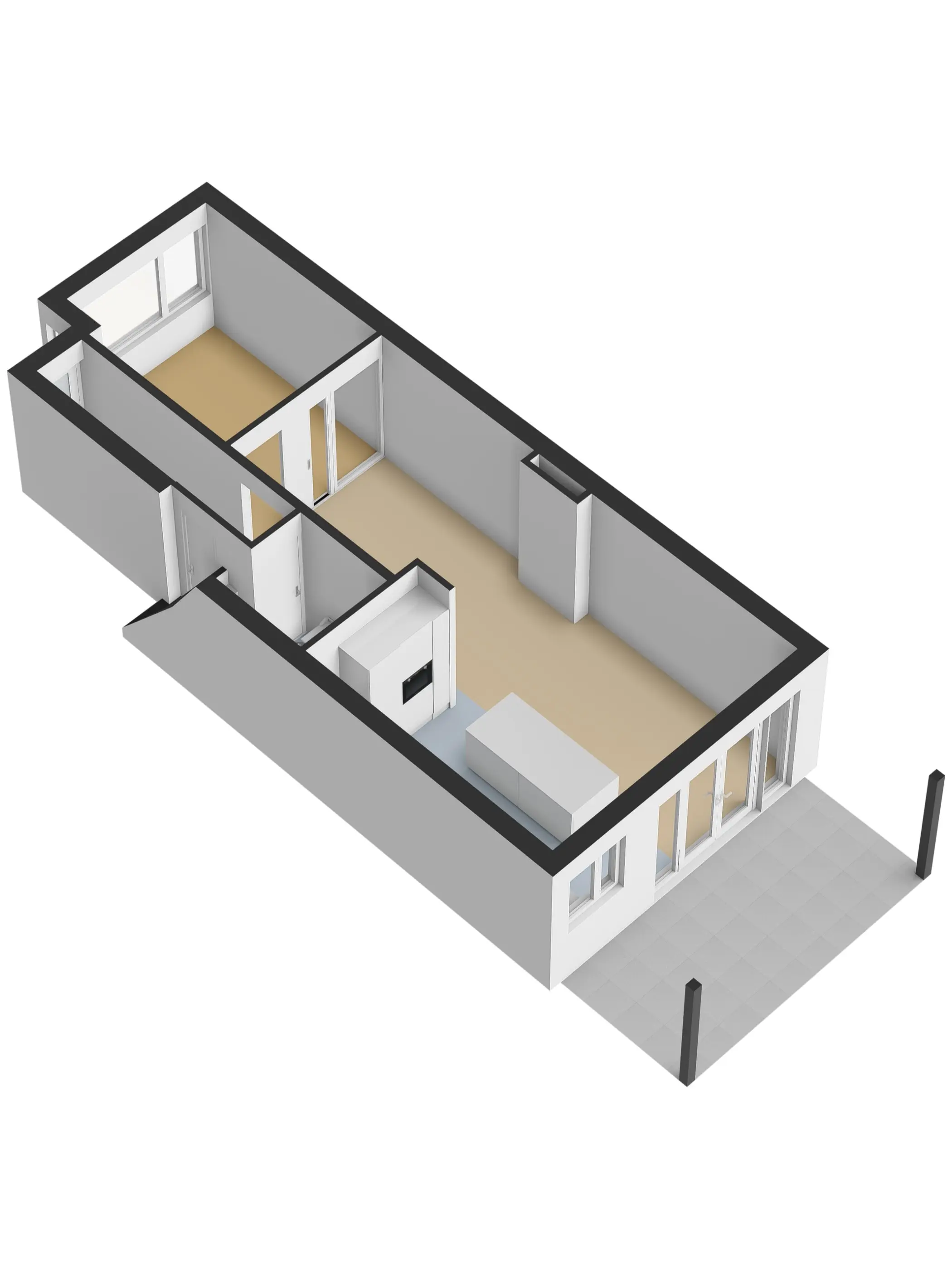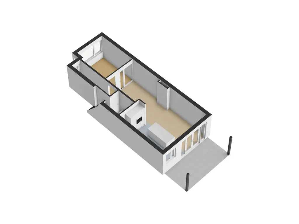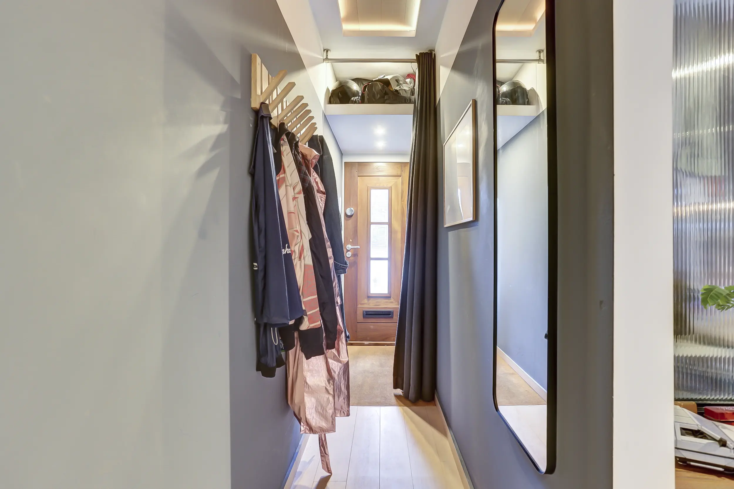 Aan de voorzijde vind je een sfeervolle slaapkamer, terwijl de moderne badkamer is voorzien van een inloopdouche, stijlvol wastafelmeubel, toilet en vloerverwarming voor extra comfort. De gehele woning ademt een eigentijdse, instapklare sfeer met strakke afwerking, en is bovendien uitgerust met airconditioning in de woonkamer en slaapkamer.