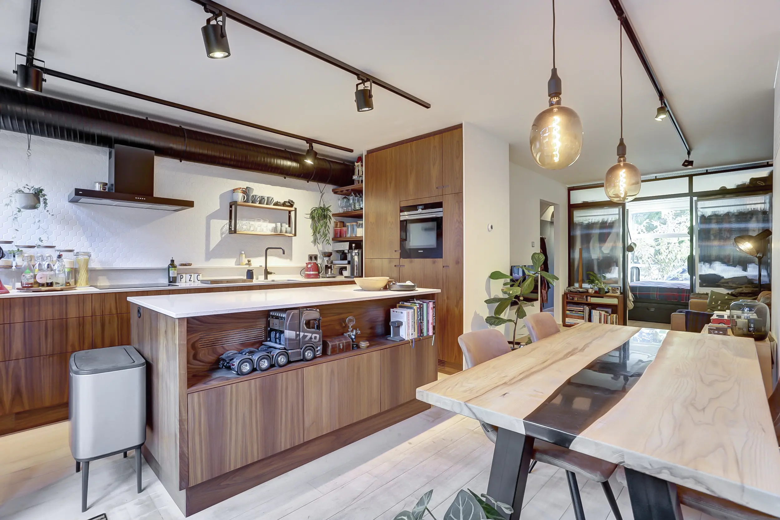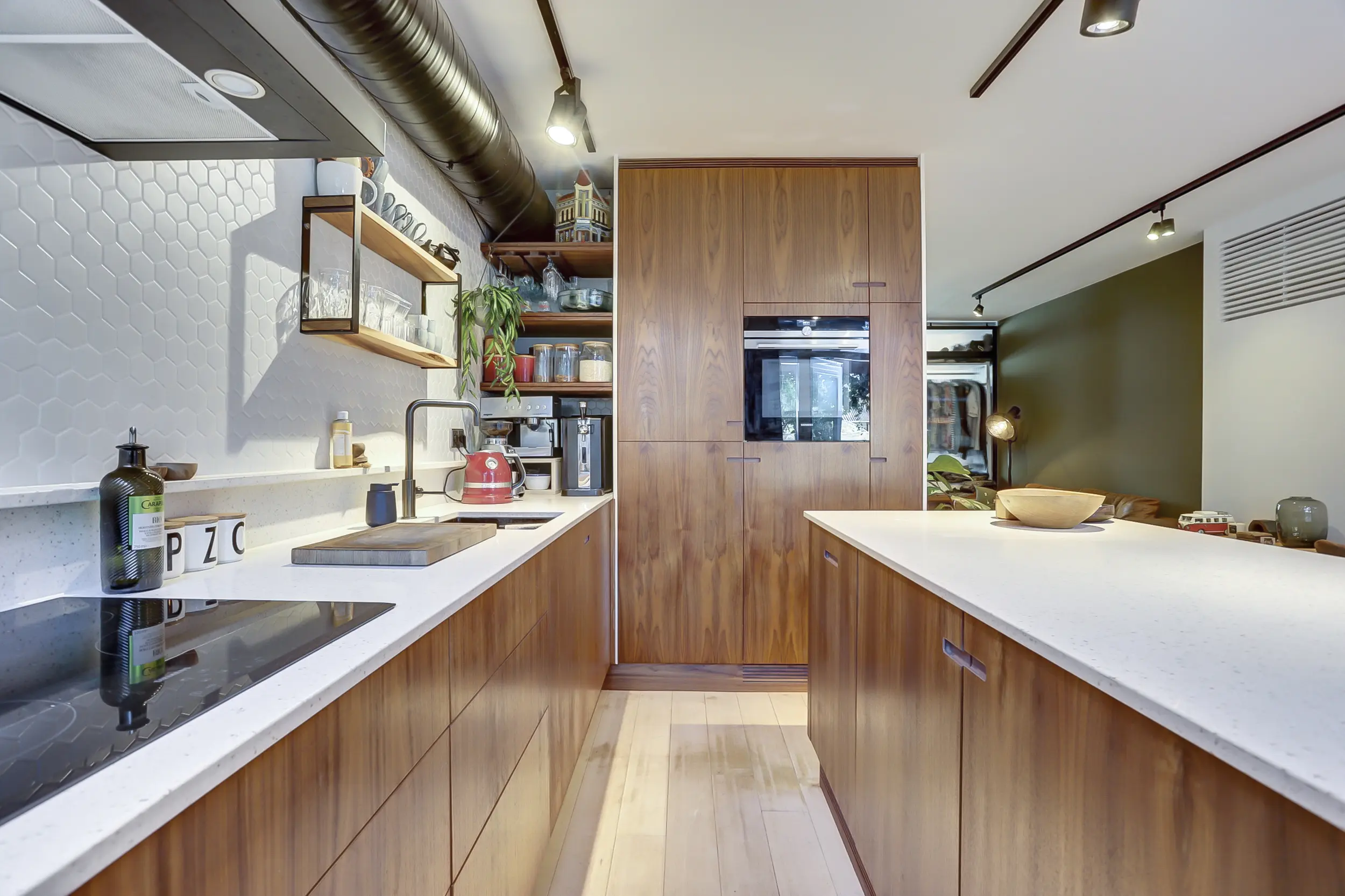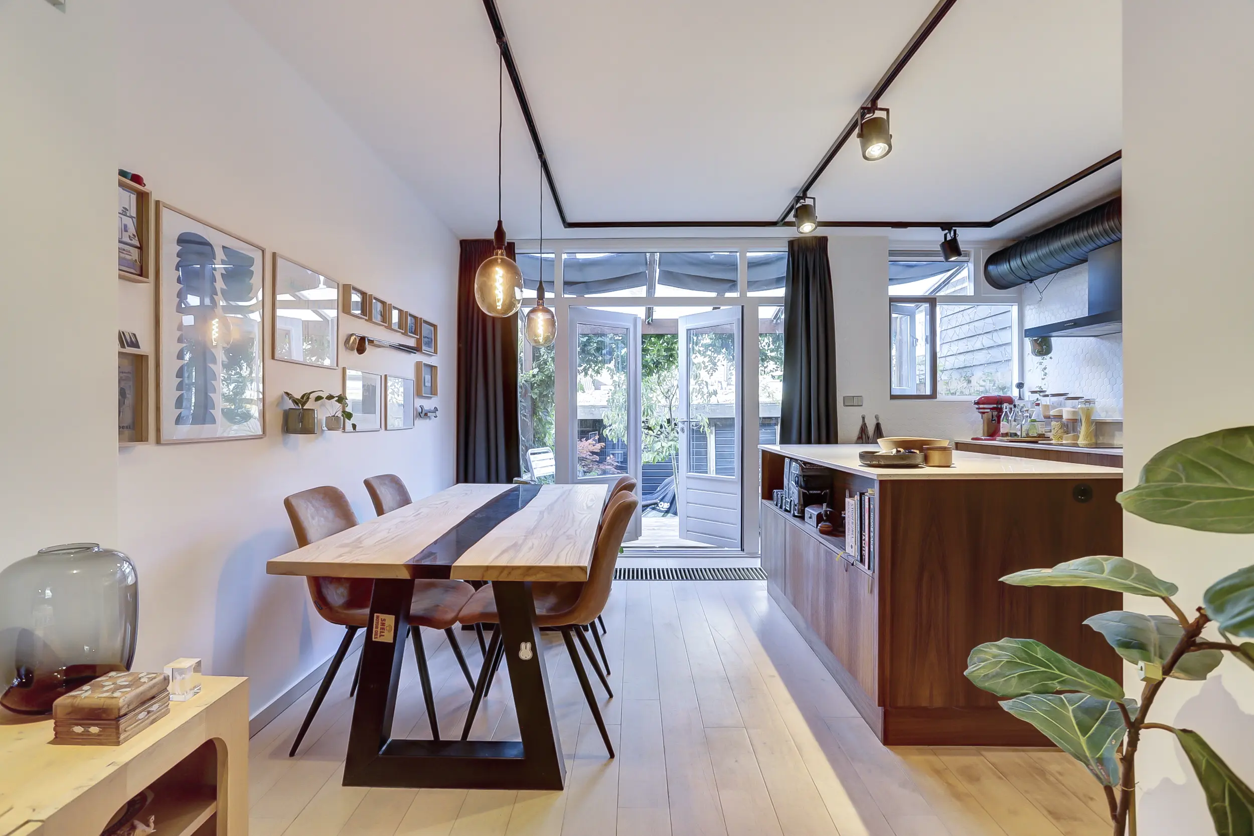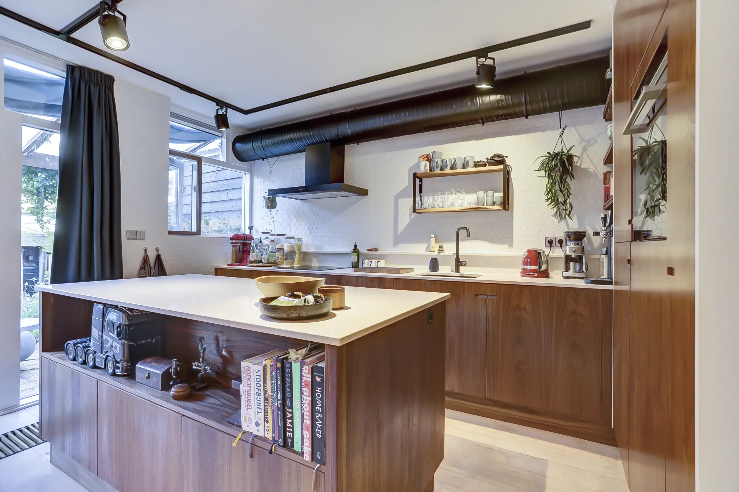 De woonkamer straalt warmte en modern wooncomfort uit en loopt door naar de maatwerkkeuken in houttinten, volledig uitgerust met alle benodigde inbouwapparatuur. Slim ontworpen, want ook de wasmachine en droger zijn netjes in de keuken verwerkt.