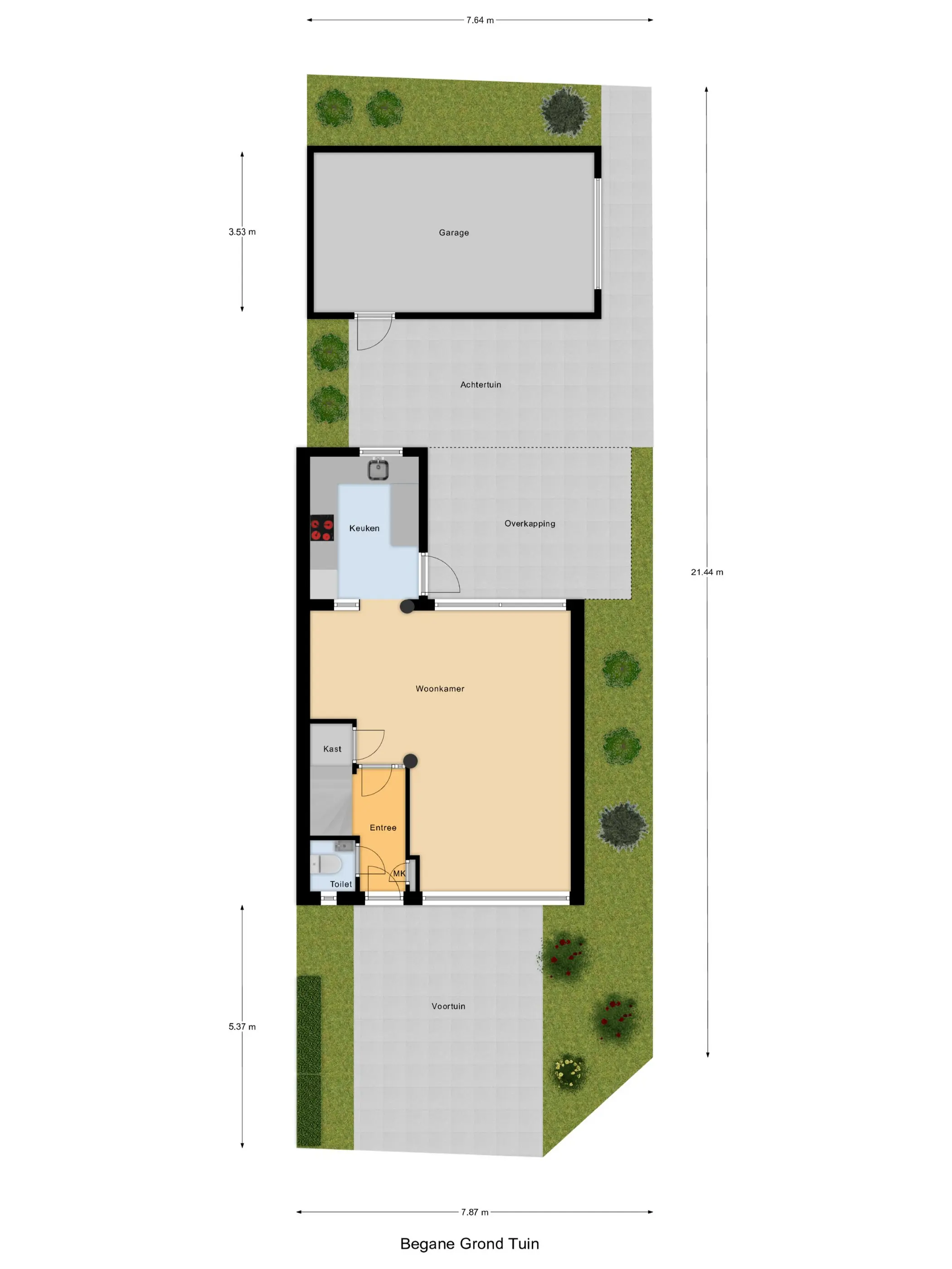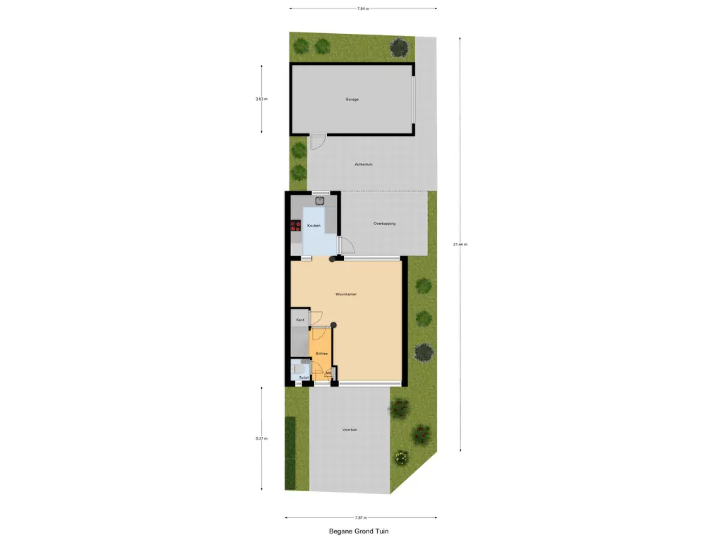 - Hoekwoning met voor-, zij-, en achtertuin.