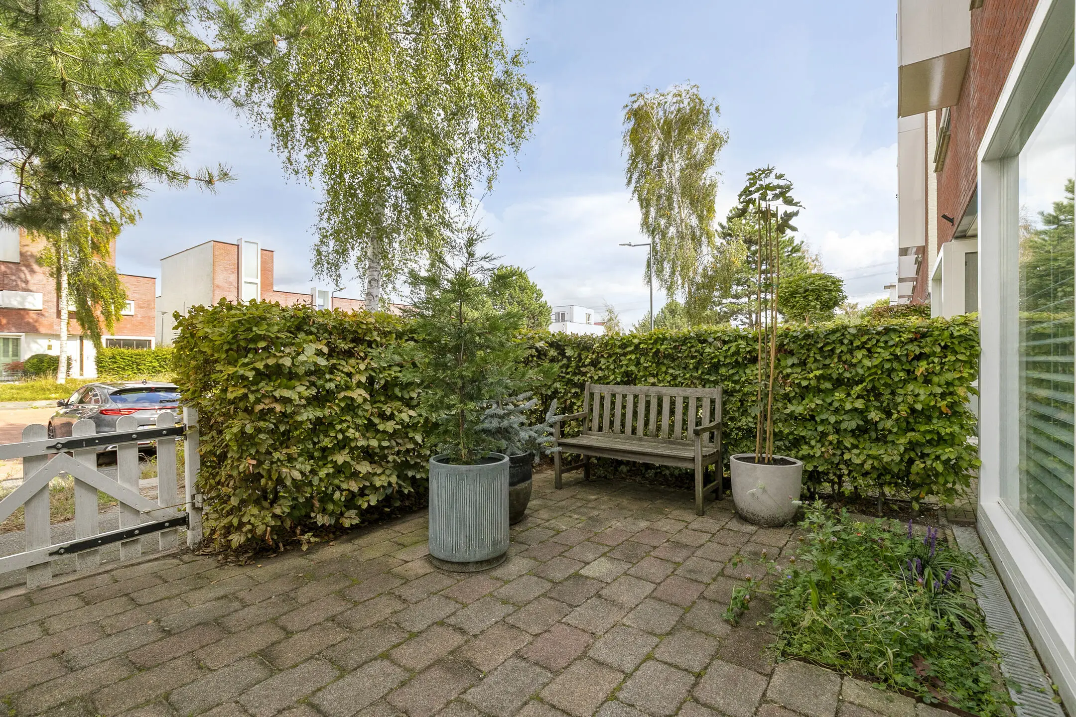 Nette onderhoudsvriendelijke voortuin gelegen op het noorden met beukenhaag en een hekje.