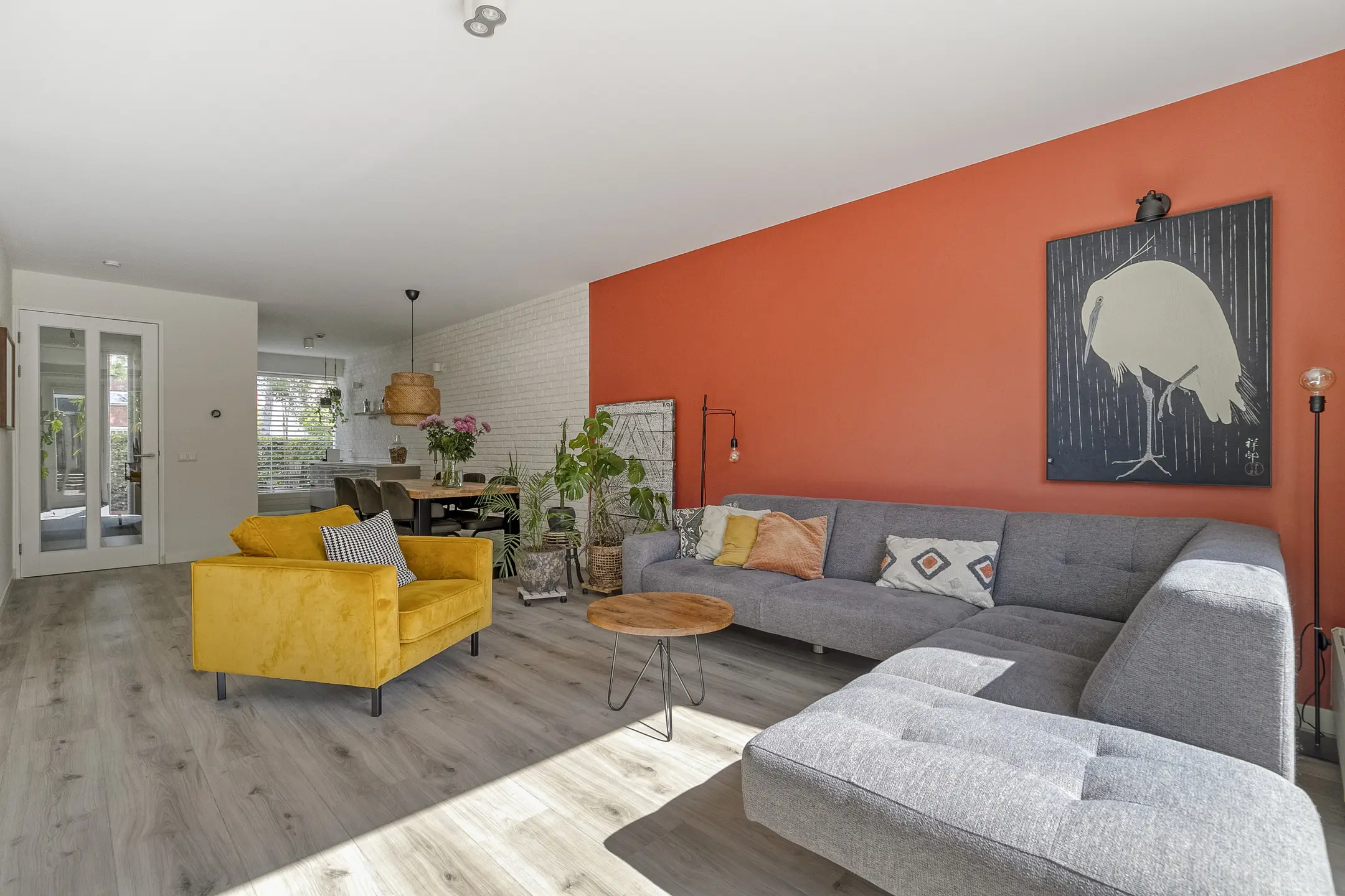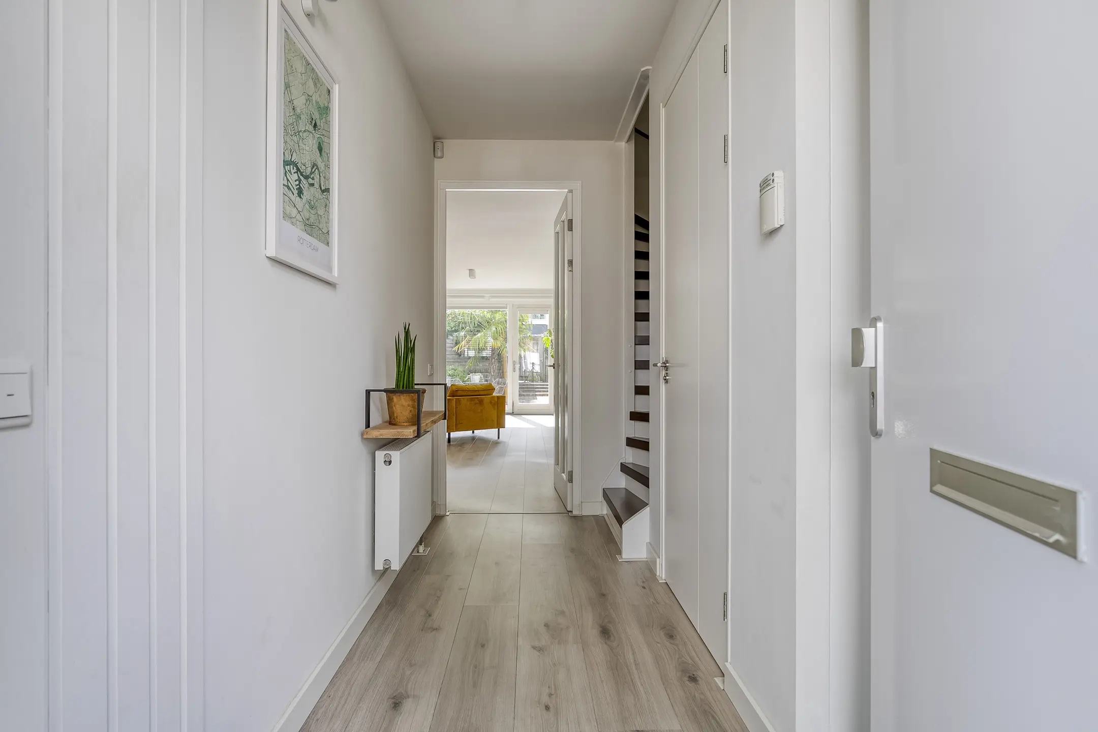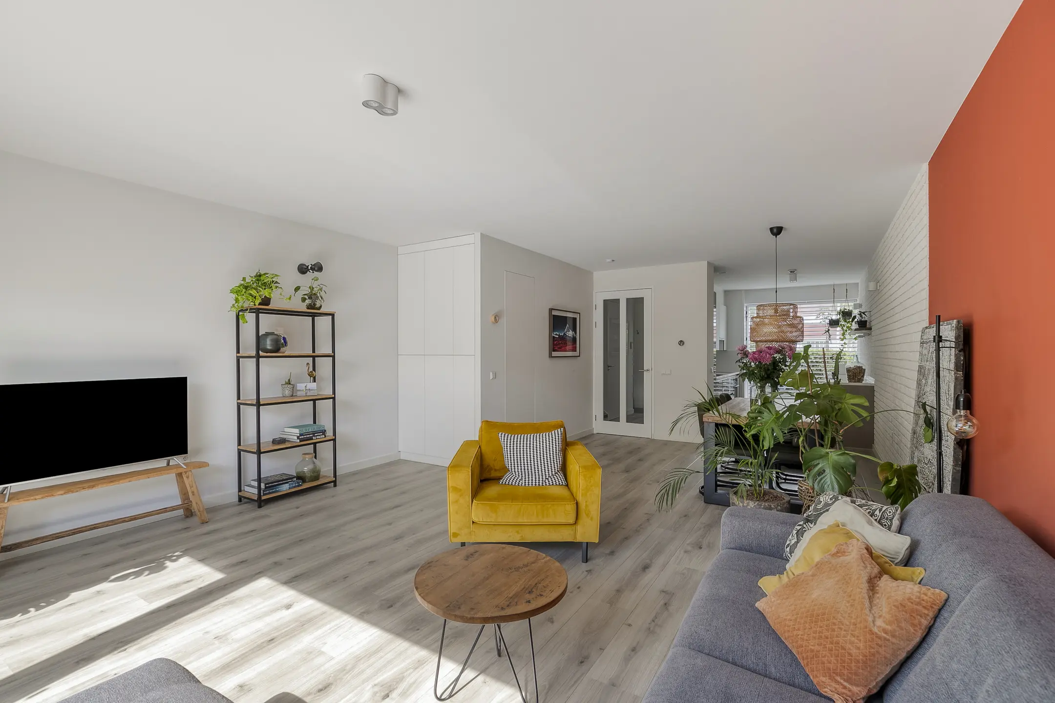 Entree, hal met meterkast, trapopgang en garderobekast. Mooi betegelde toiletruimte (2016) met een wandcloset en fonteintje met een kastje. Deur met glas inzet naar de royale living bestaande uit een open keuken aan de voorzijde en een tuingerichte met 2,5 meter uitgebouwde woonkamer met grote raampartij met schuifpui naar de tuin en een praktische vergrootte vaste inbouwkast. De aan 2 zijden recht opgestelde keuken is in 2016 geplaatst en is compleet uitgerust met een inductiekookplaat, afzuigkap, vaatwasmachine, oven, grote koelkast, vriezer en mooie erker welke voor extra daglicht zorgt. Op de begane grond liggen fraaie brede laminaatplanken.