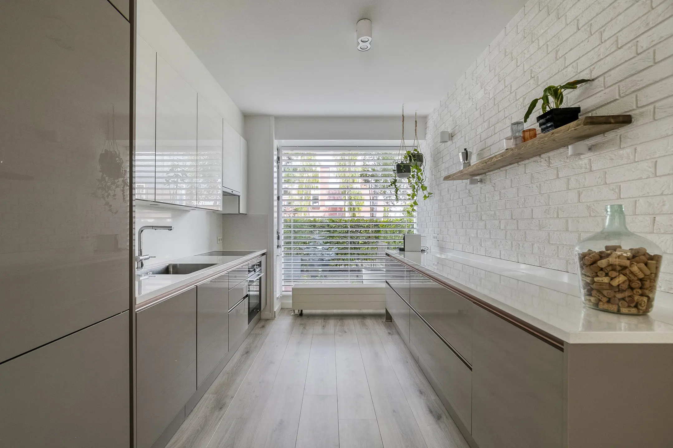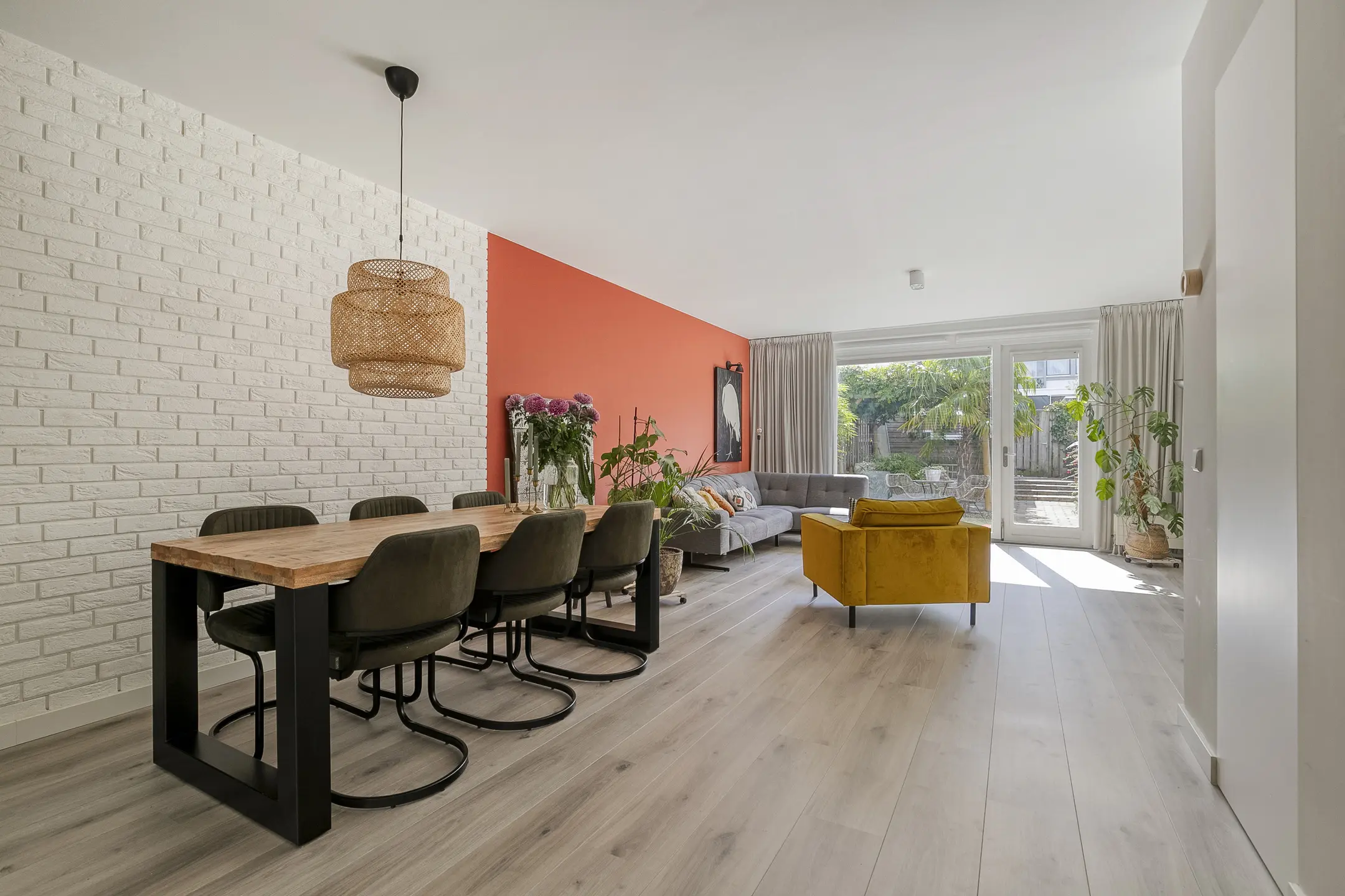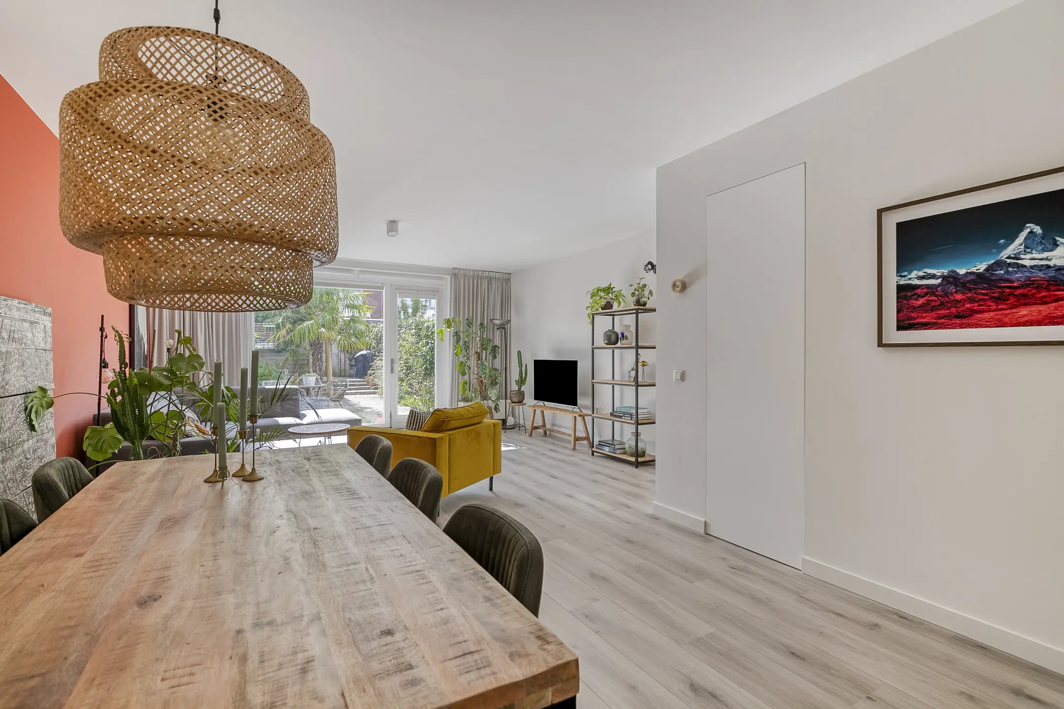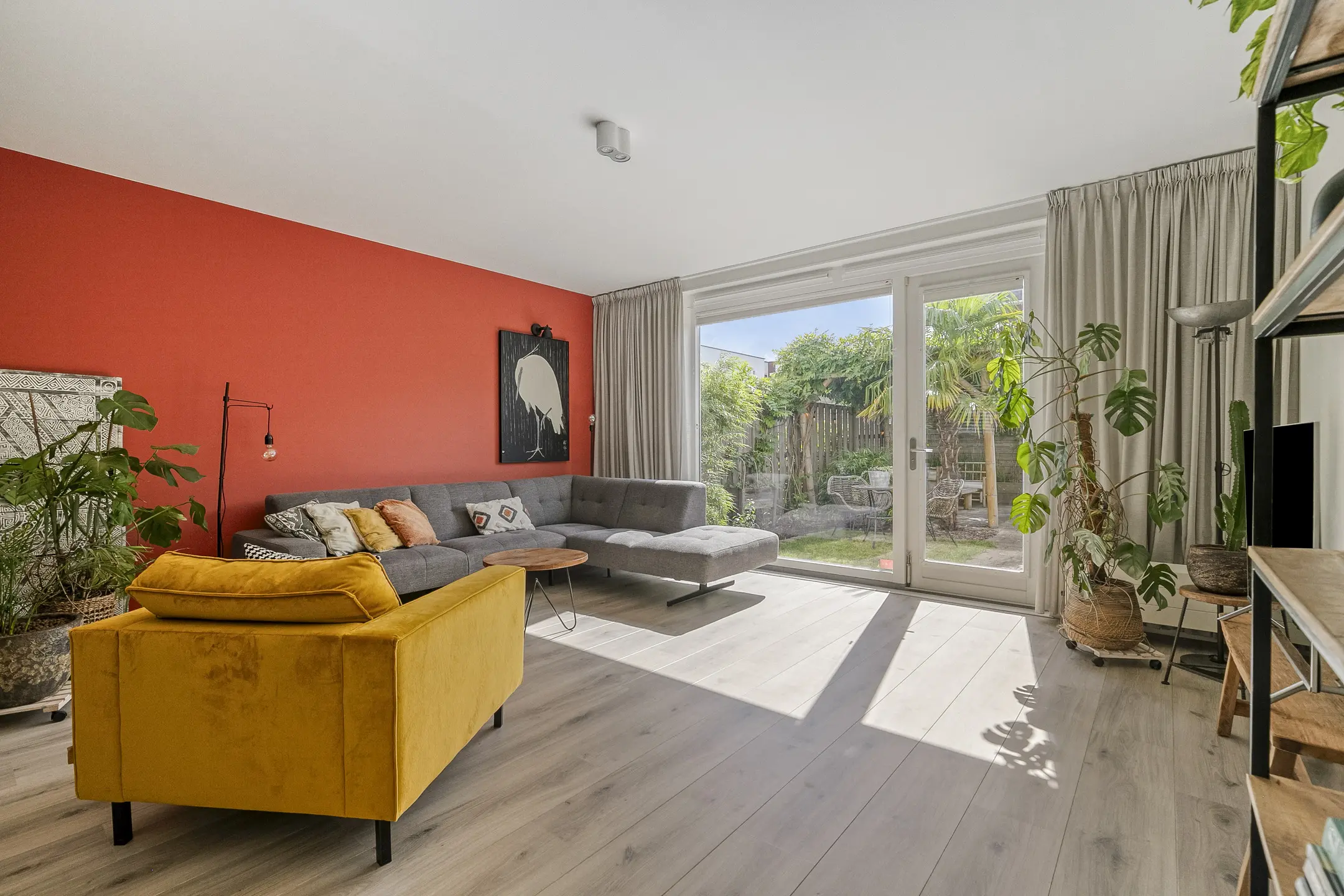 Entree, hal met meterkast, trapopgang en garderobekast. Mooi betegelde toiletruimte (2016) met een wandcloset en fonteintje met een kastje. Deur met glas inzet naar de royale living bestaande uit een open keuken aan de voorzijde en een tuingerichte met 2,5 meter uitgebouwde woonkamer met grote raampartij met schuifpui naar de tuin en een praktische vergrootte vaste inbouwkast. De aan 2 zijden recht opgestelde keuken is in 2016 geplaatst en is compleet uitgerust met een inductiekookplaat, afzuigkap, vaatwasmachine, oven, grote koelkast, vriezer en mooie erker welke voor extra daglicht zorgt. Op de begane grond liggen fraaie brede laminaatplanken.