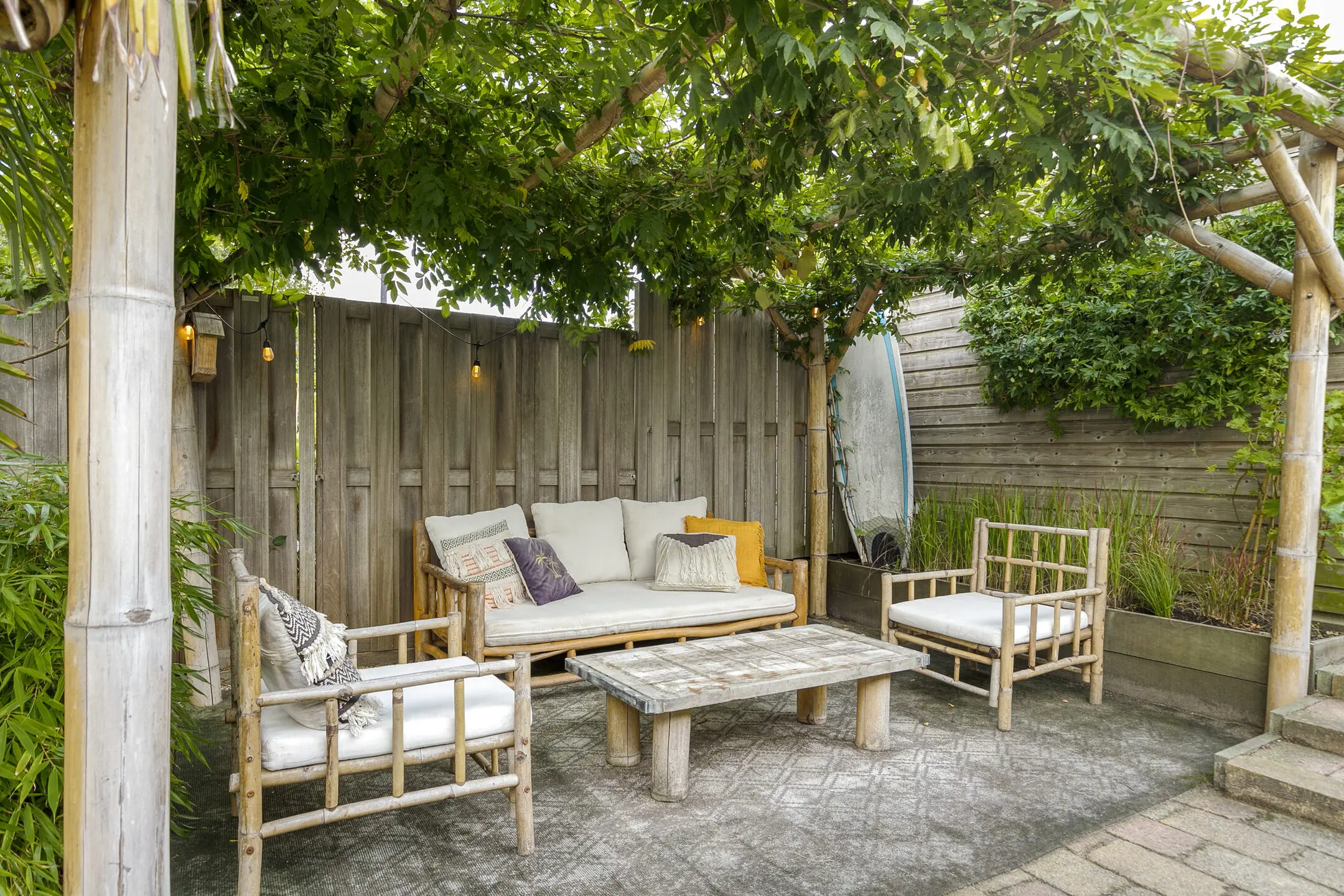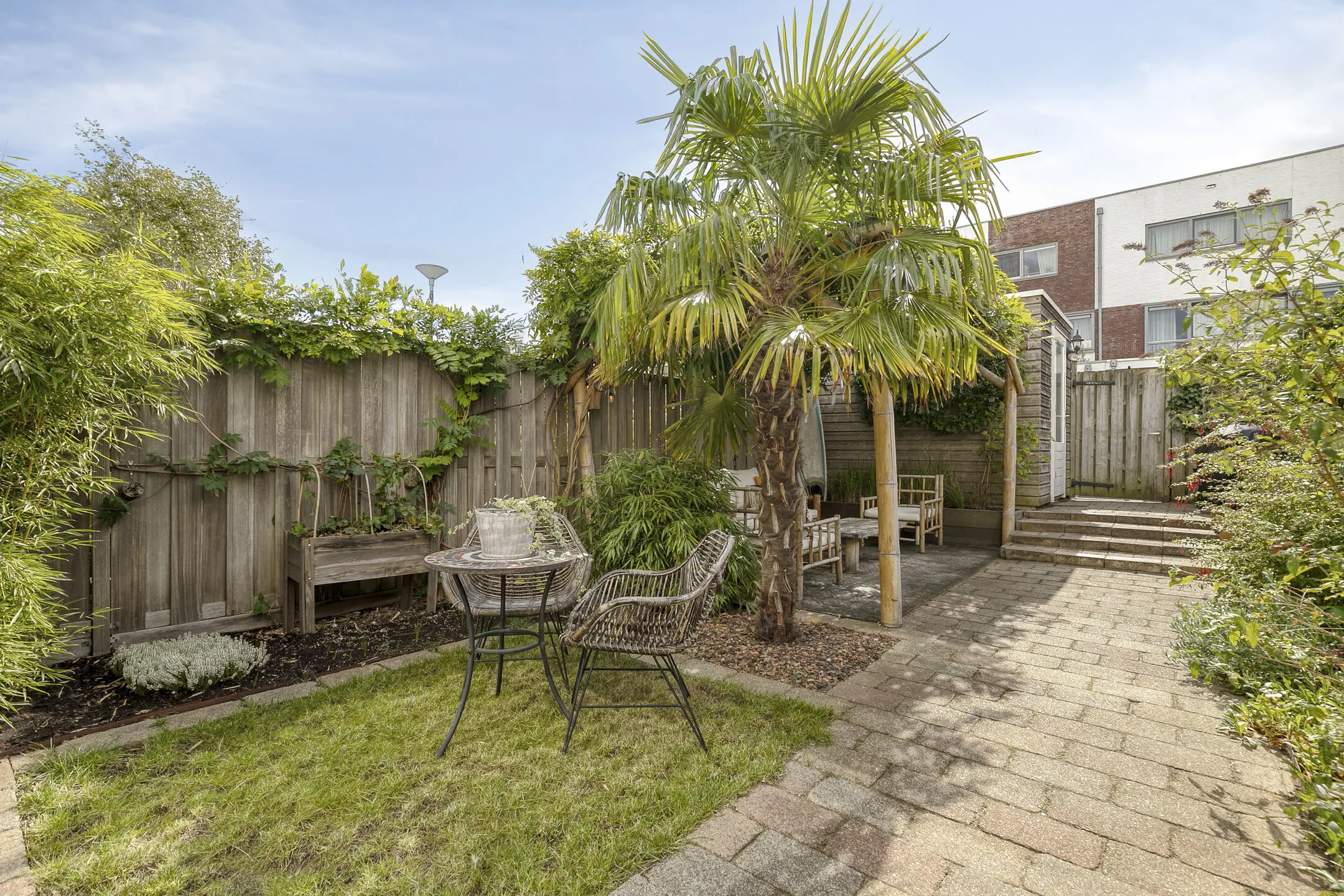De zonnige achtertuin ligt gunstig op het zuiden, hier staat een grote palm en de bamboe pergola is een heerlijke plek om onder te zitten. Er is een buitenkraan aanwezig en een houten berging met elektra. Het elektrisch bedienbare zonnescherm met grijs/wit gestreept doek houdt de zon uit de woonkamer.