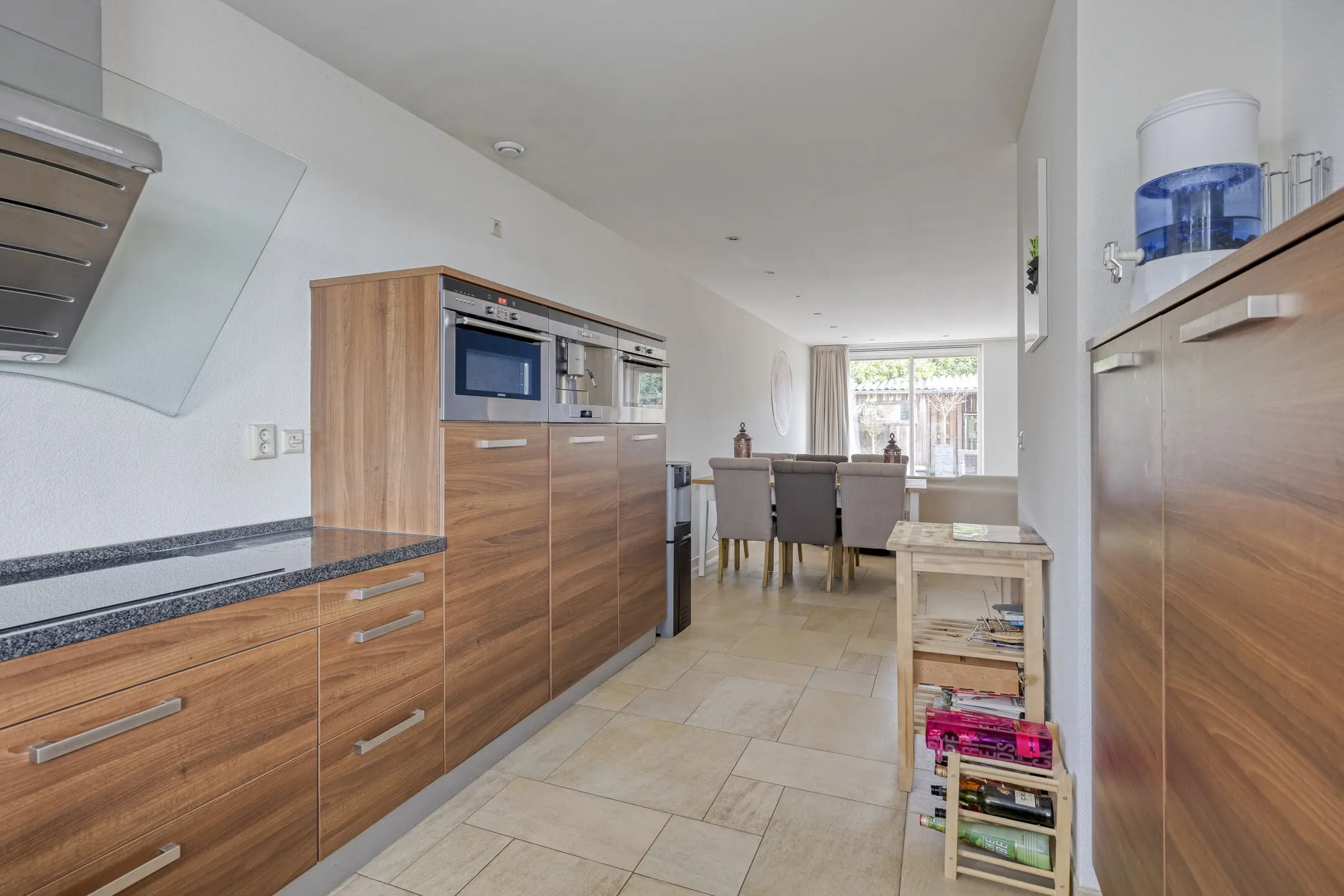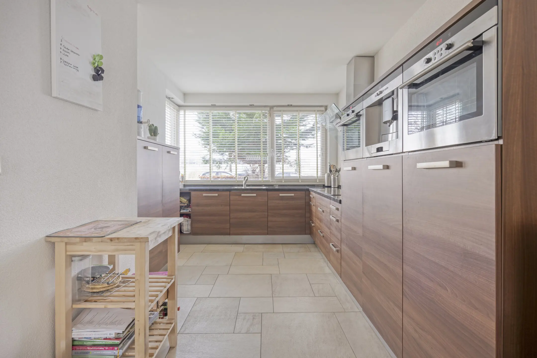 De keuken is van alle gemakken voorzien: een koel/vrieskast, maar liefst twee combi oven/magnetron, vaatwasser en een inductiekookplaat met afzuigkap.