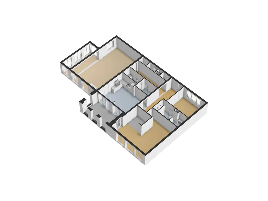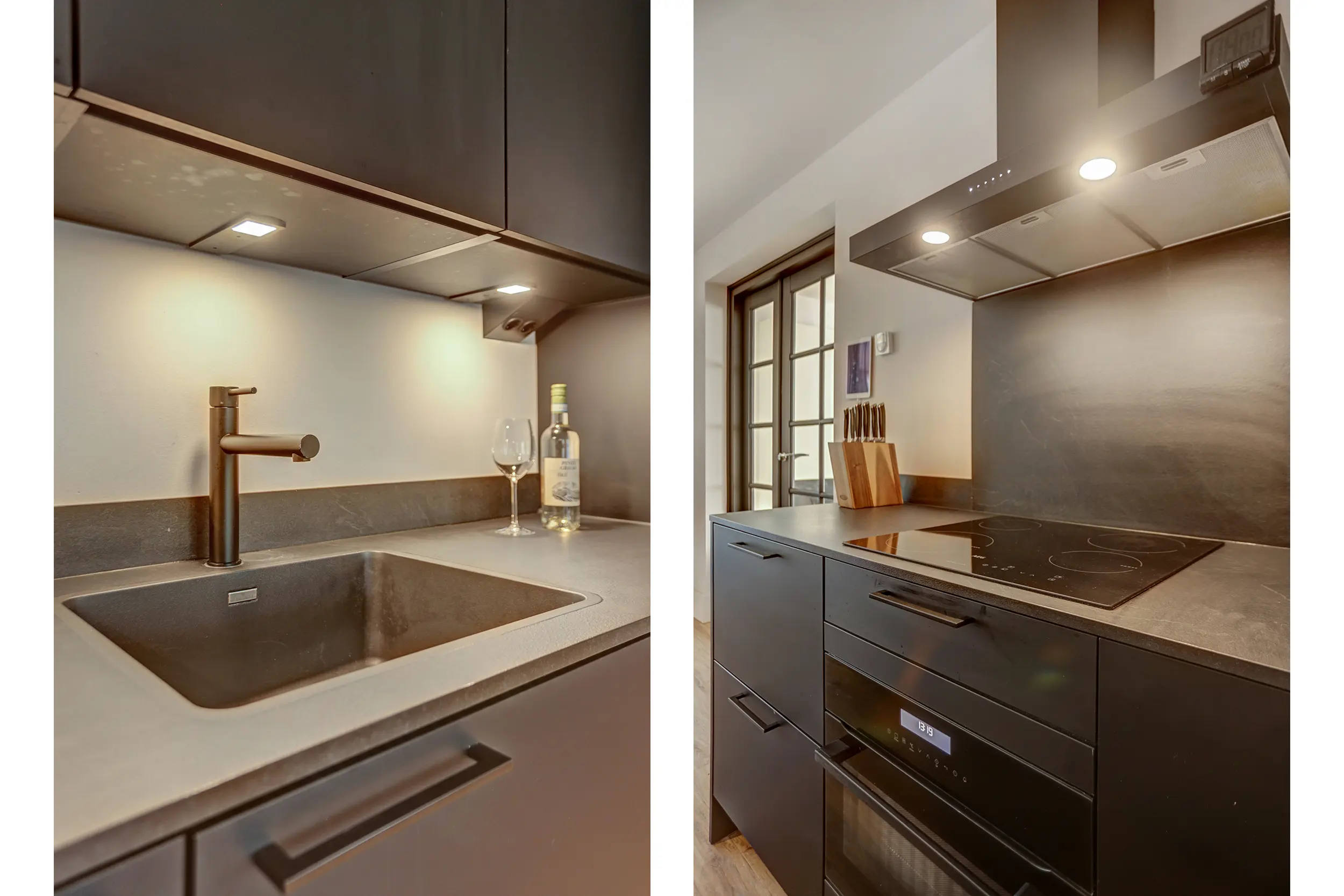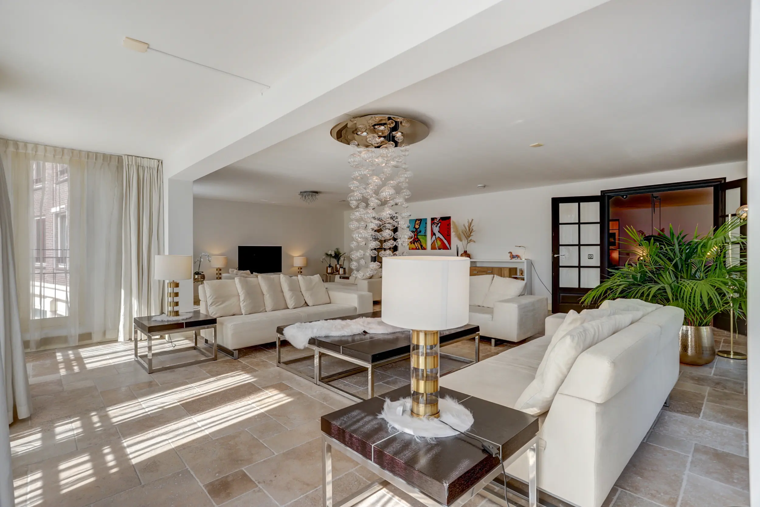 Via de entree kom je binnen in een ruime hal die toegang biedt tot alle vertrekken van het appartement. Aan de voorzijde bevindt zich de royale woonkamer, die dankzij de vele ramen over de volle breedte heerlijk licht is. Het natuurstenen vloeroppervlak en de strak gestuukte wanden en plafonds geven de ruimte een moderne en stijlvolle uitstraling. Vanuit de woonkamer leiden openslaande deuren naar de afgesloten keuken. De strakke, zwarte inrichting met hoogwaardige inbouwapparatuur geeft de keuken een luxe en eigentijdse sfeer.