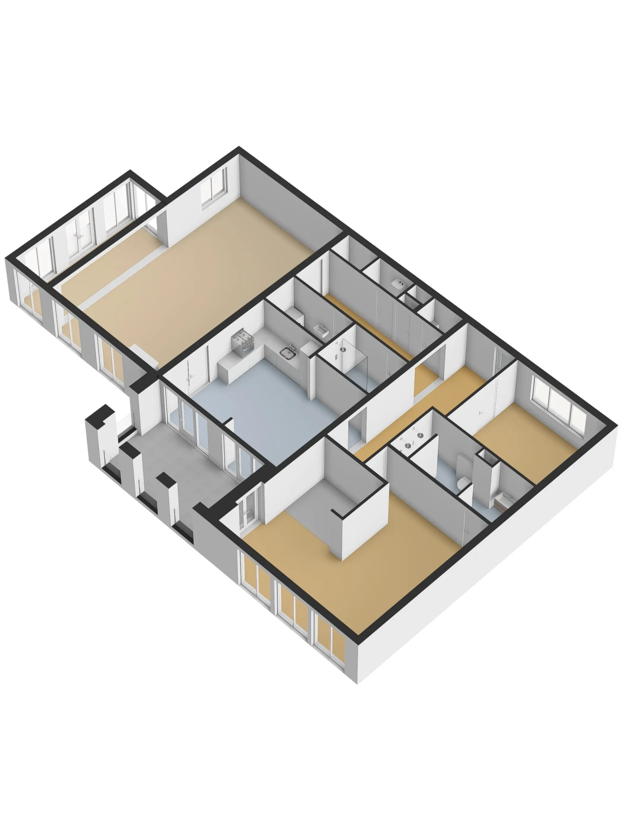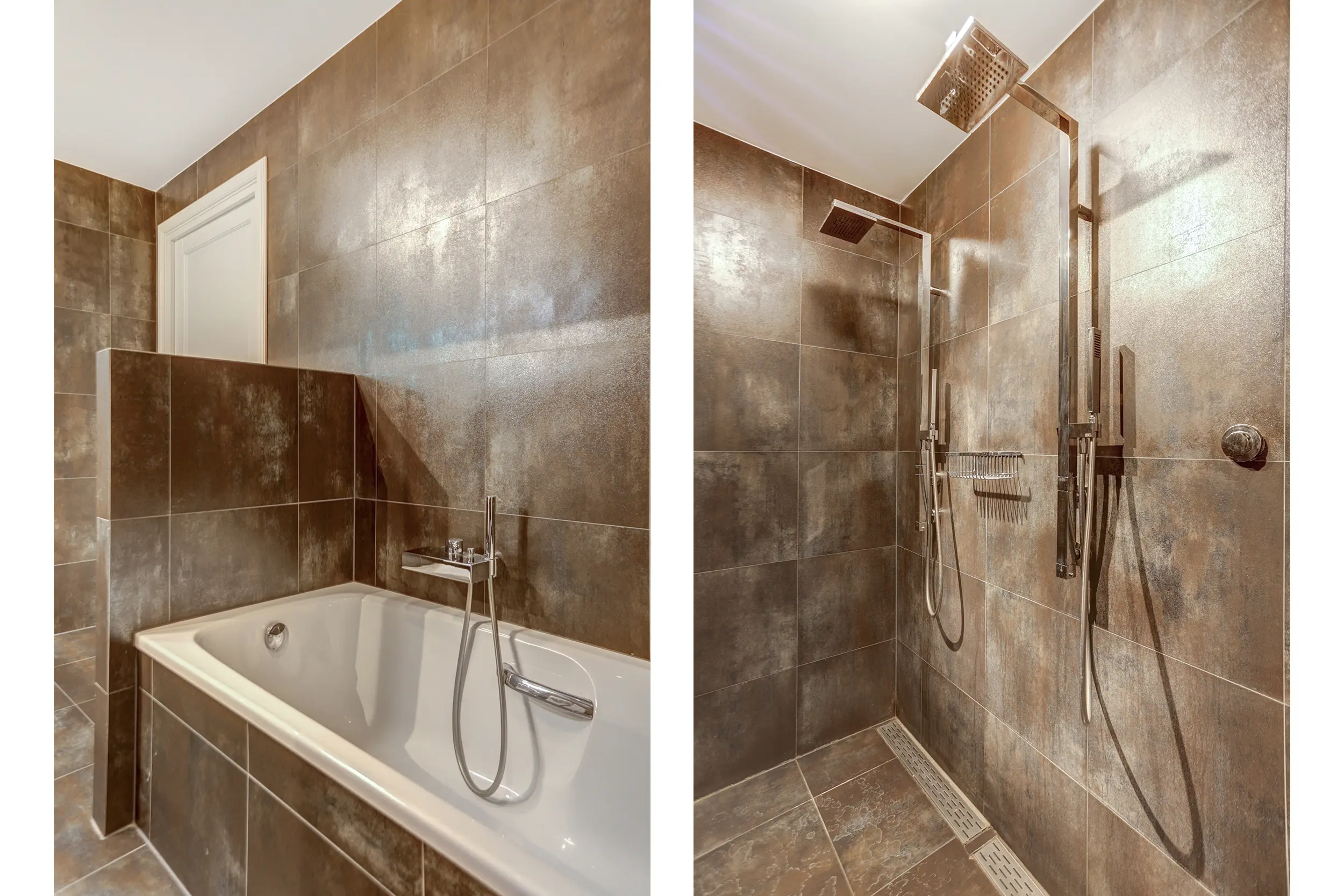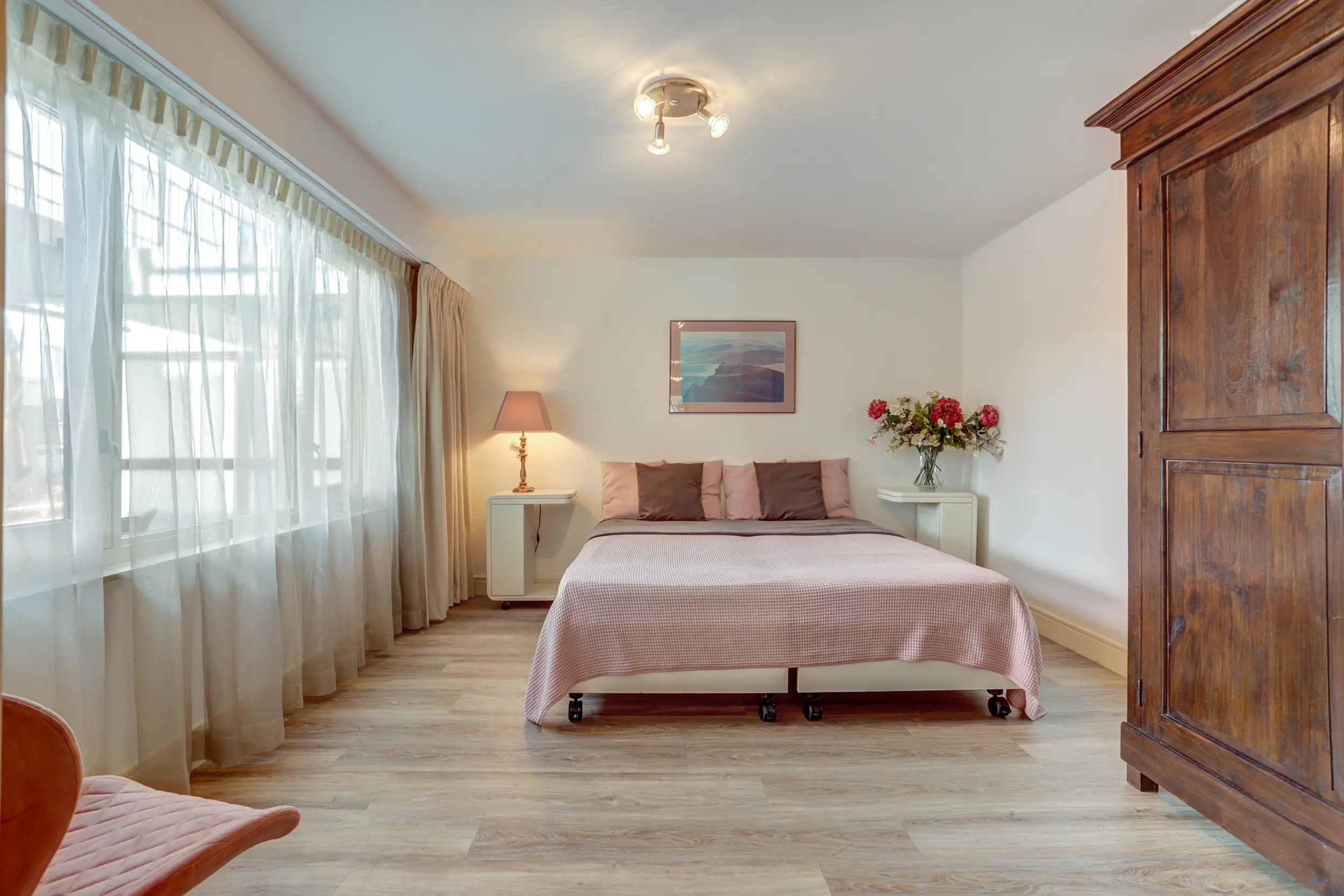 Het appartement beschikt over twee comfortabele slaapkamers, beide afgewerkt met een PVC vloer en glad gestuukte wanden. De hoofdslaapkamer is voorzien van een eigen badkamer met inloopdouche, ligbad, toilet en wastafel. De tweede slaapkamer maakt gebruik van de tweede badkamer, die eveneens modern is uitgevoerd met een inloopdouche en wastafel.