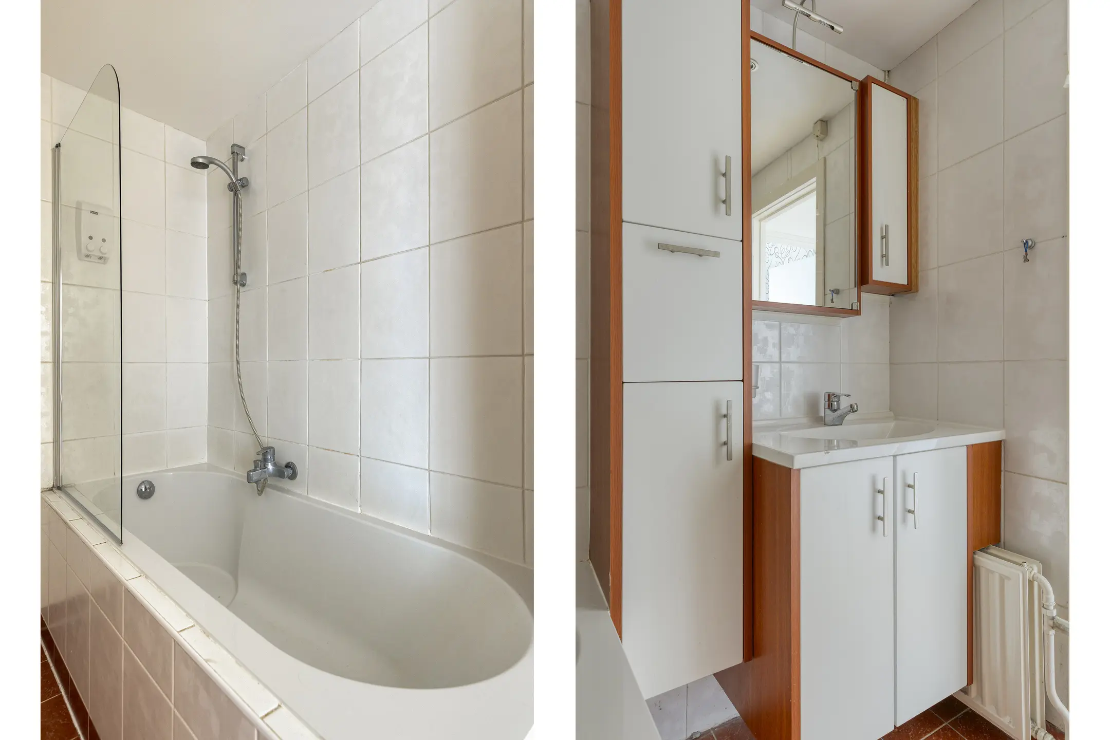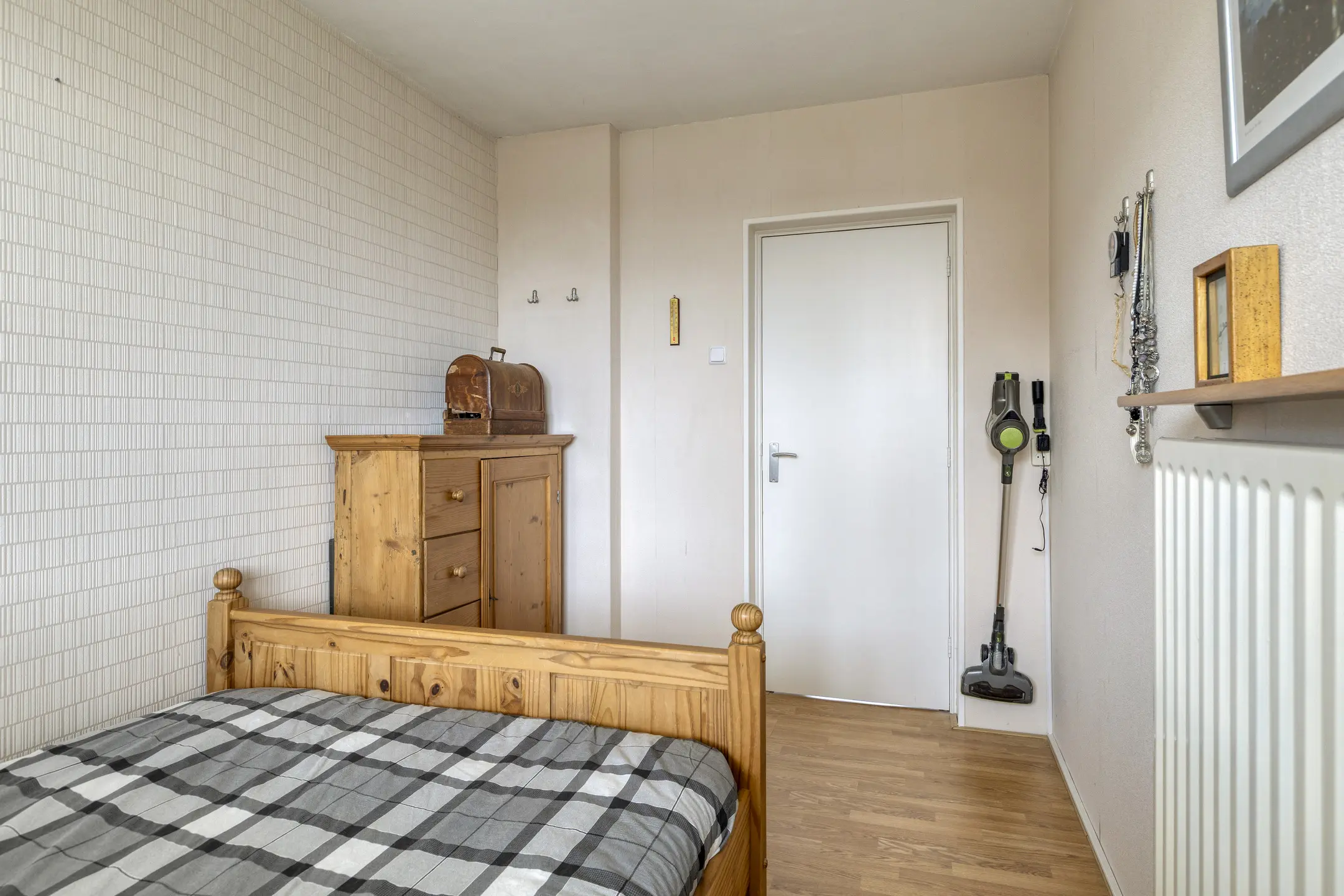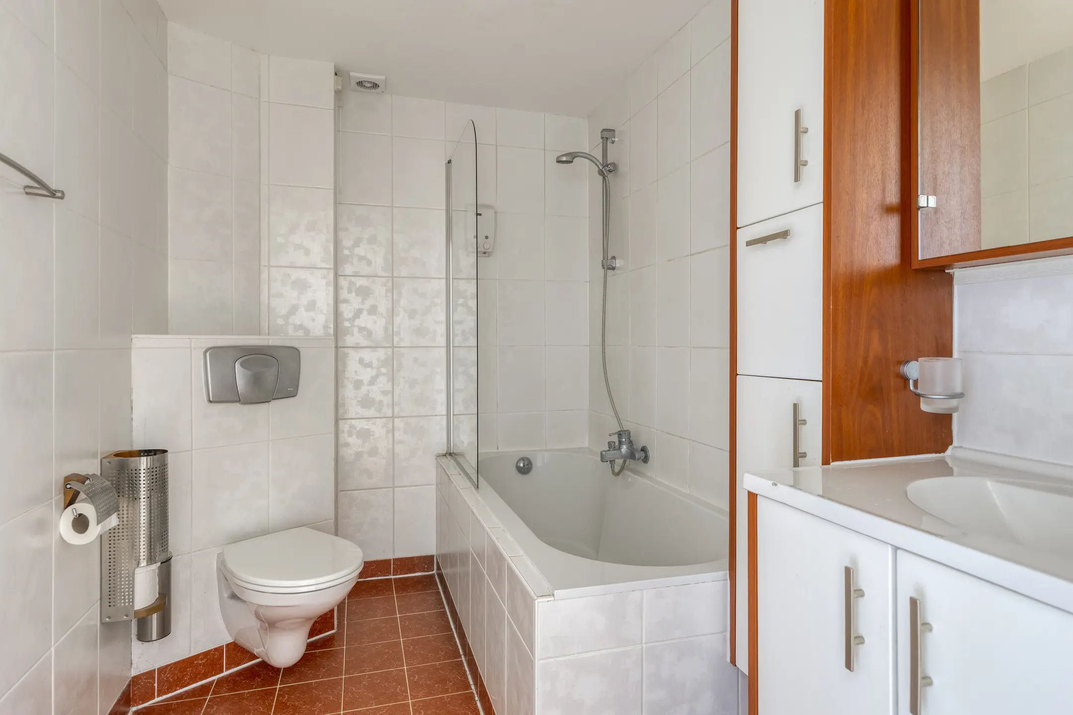 Ruime overloop met toegang tot alle vertrekken; twee slaapkamers aan de voorzijde en twee slaapkamers aan de achterzijde van de woning. Dit zijn allen kamers van goed formaat. Eén van de kamers is momenteel in gebruik als kastenkamer met een mooie witte op maat gemaakte kast in hoekopstelling. Op de overloop en in de kamers ligt een laminaatvloer welke drempelloos is doorgelegd. In de geheel betegelde badkamer zijn een ligbad met douchescherm, wandcloset, radiator, wastafelmeubel en spiegelkast aanwezig.