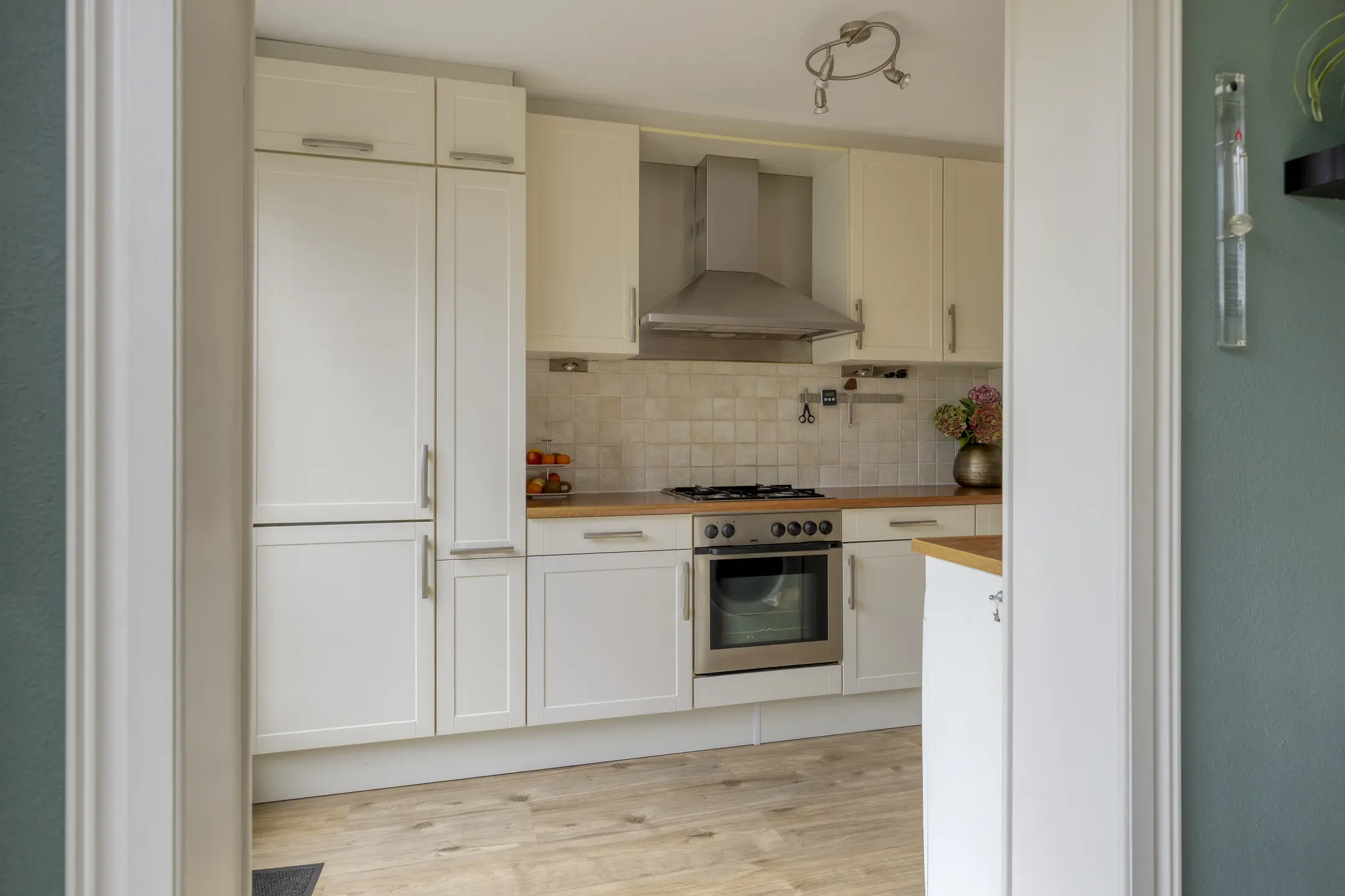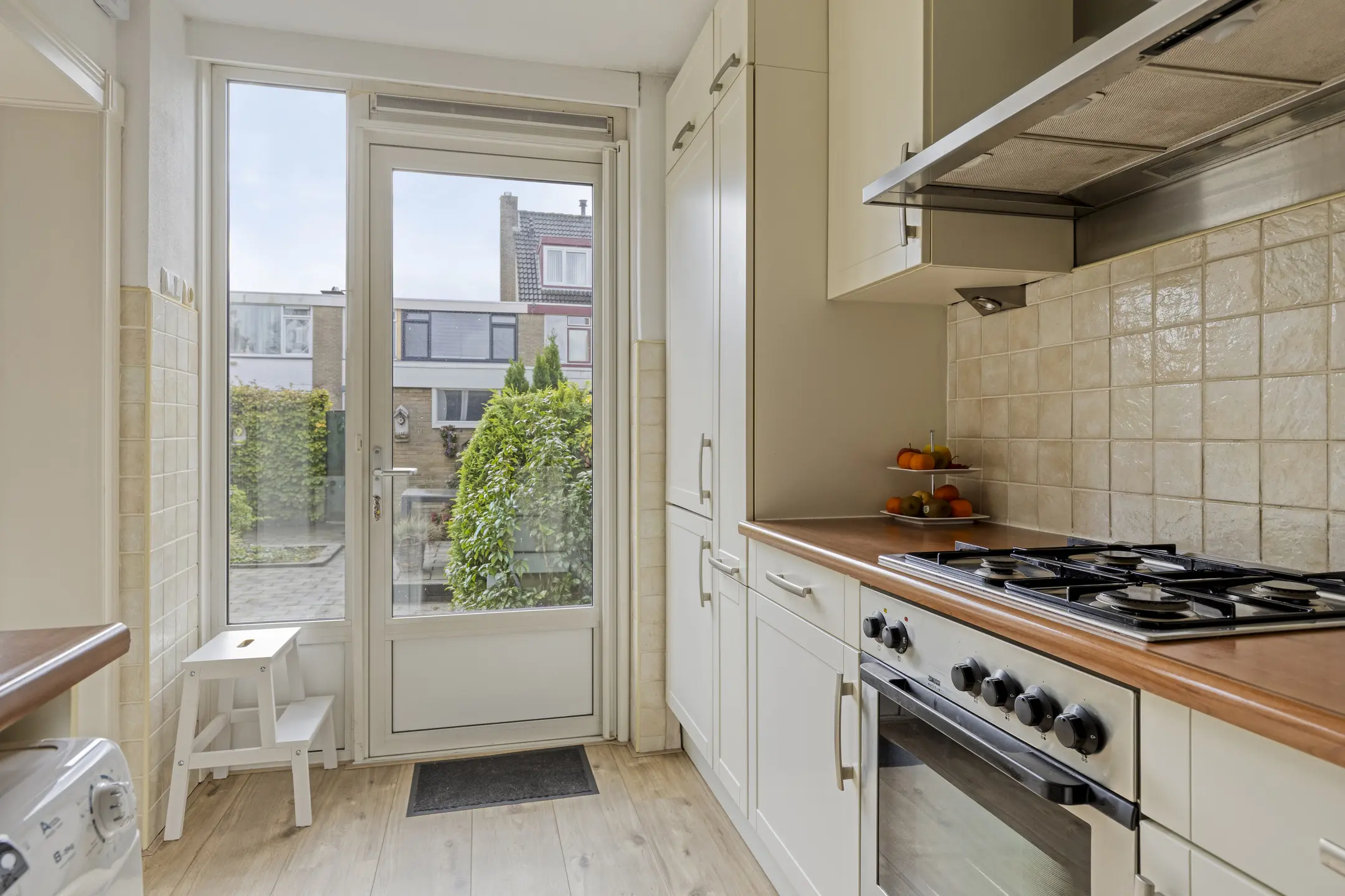 De toiletruimte is geheel betegeld en er is een fonteintje aanwezig. Vanuit de hal is er via een deur met glas toegang naar de ruime doorzon woonkamer. De woonkamer is riant van formaat en prettig licht door de grote schuifpui aan de achterzijde. Vanuit de woonkamer is er een doorgang naar de keuken, deze is geplaatst in U-opstelling en is uitgerust met een gasfornuis, afzuigkap, oven, koel-/vriescombinatie, apothekerskast en losse vaatwasmachine. Er is een kastje aanwezig met daarin de C.V.-combiketel en de aansluiting van de wasmachine is eveneens in de keuken. In de keuken is een deur naar de achtertuin. Op de begane grond ligt een mooie laminaatvloer met brede planken welke in 2022 is gelegd.