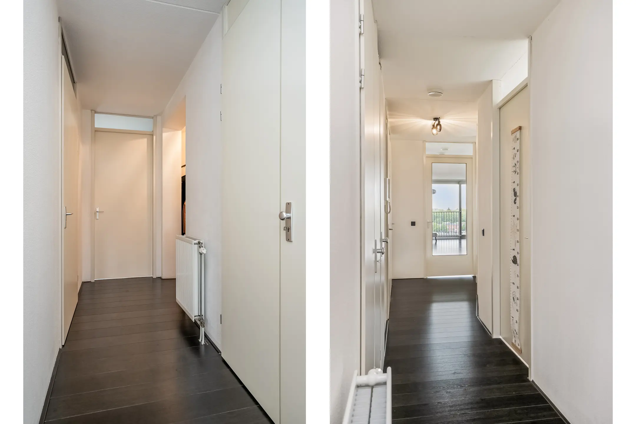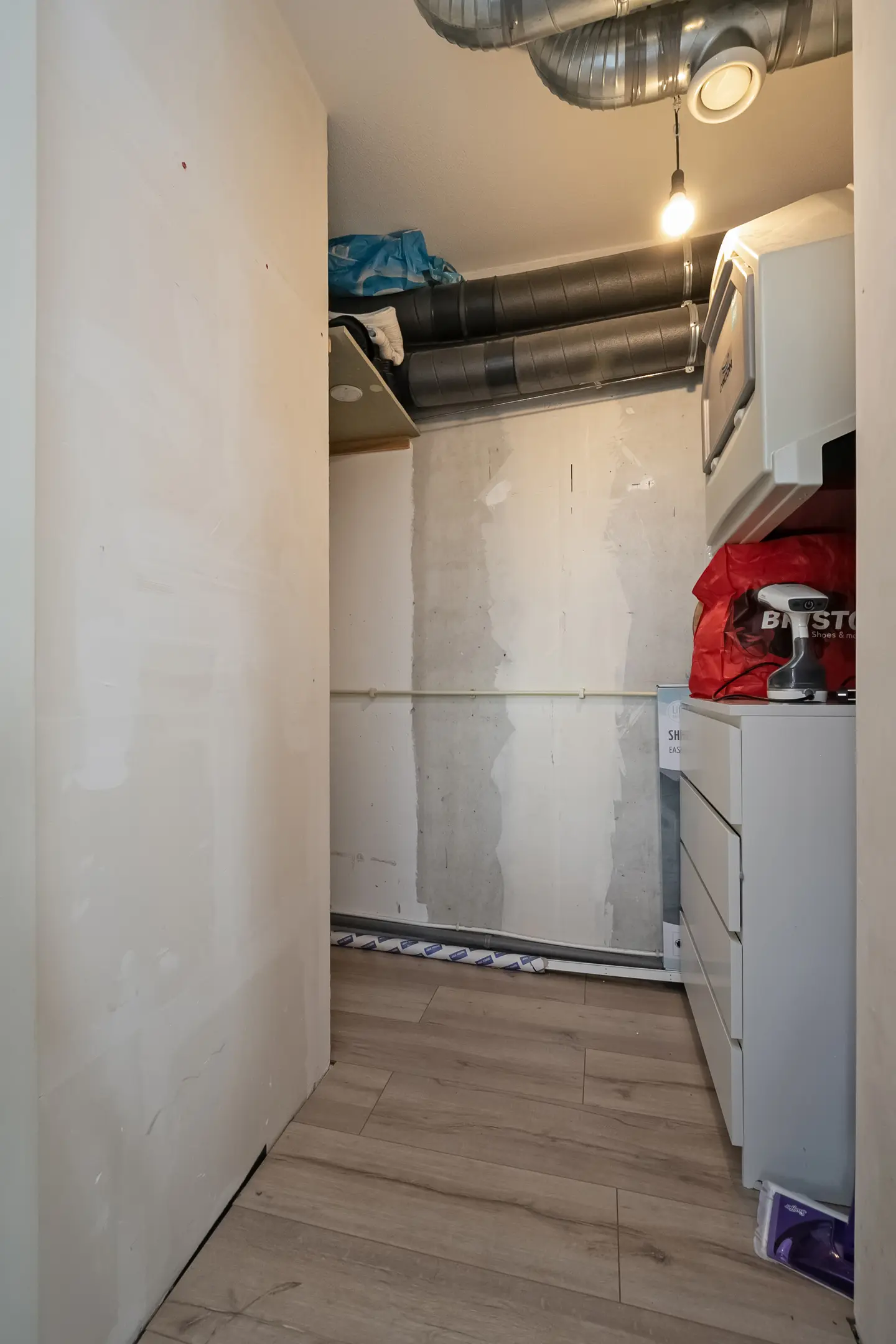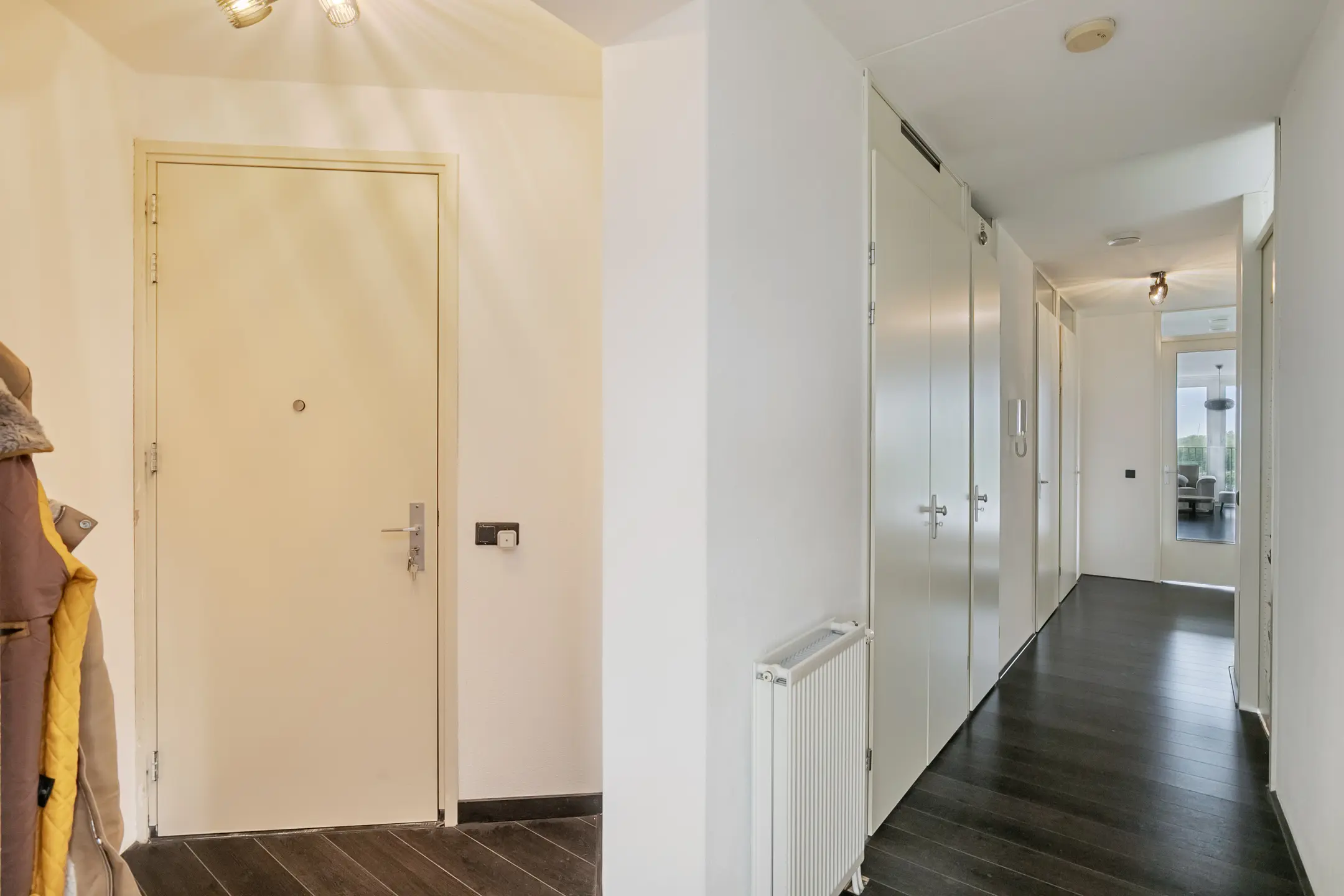 Entree/hal met aan de rechterkant de eerste grote slaapkamer, gevolgd door de tweede en derde slaapkamer. De badkamer is voorzien van een ligbad en een wastafel. Aan de linkerzijde bevinden zich de meterkast, een toilet met fonteintje en een separate bergruimte met onder andere de warmte-terugwin-installatie, wasmachine- en wasdroogaansluiting en de stadsverwarmingsunit.