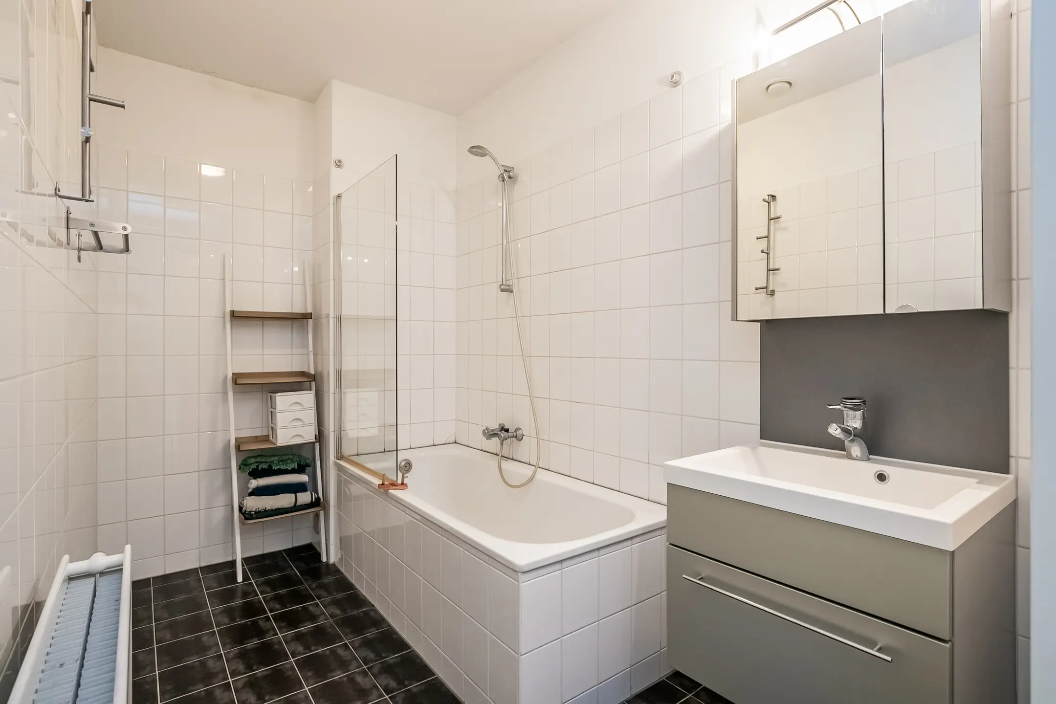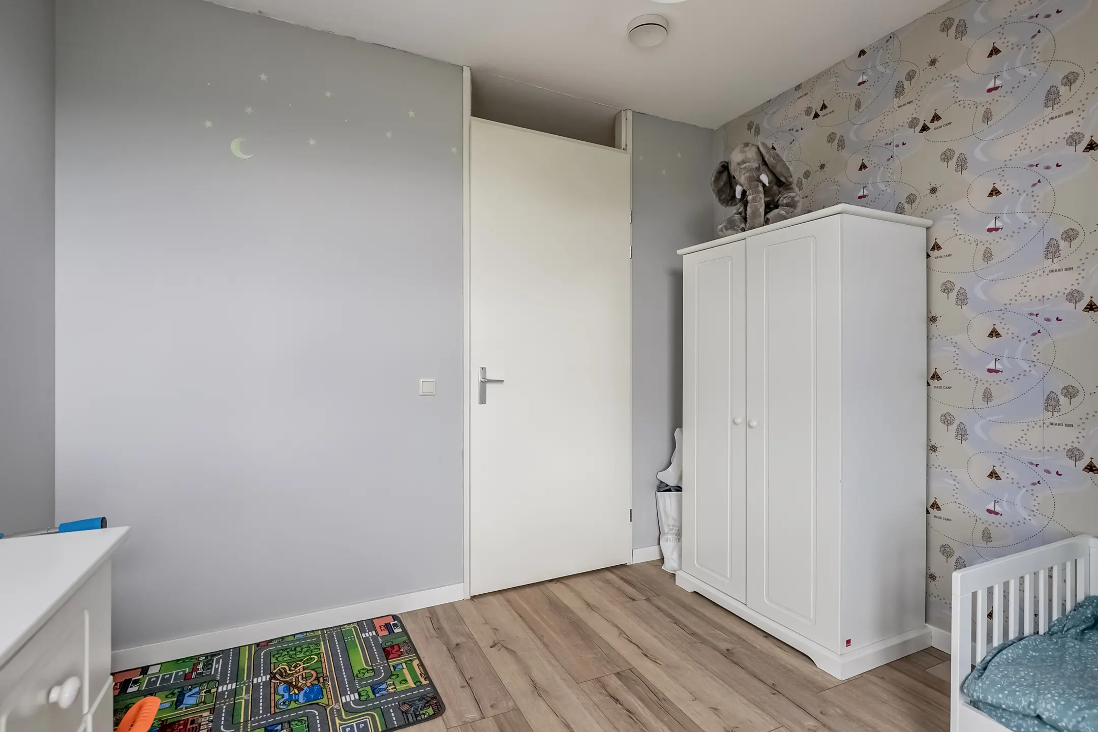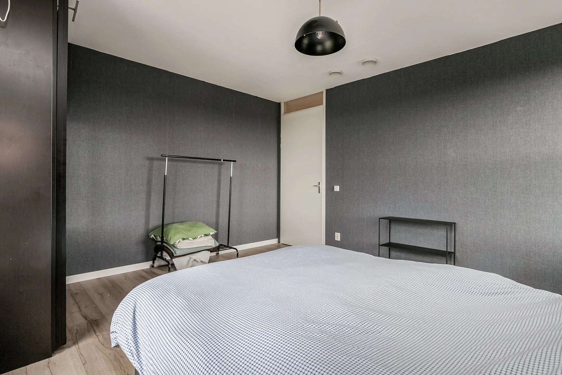 Entree/hal met aan de rechterkant de eerste grote slaapkamer, gevolgd door de tweede en derde slaapkamer. De badkamer is voorzien van een ligbad en een wastafel. Aan de linkerzijde bevinden zich de meterkast, een toilet met fonteintje en een separate bergruimte met onder andere de warmte-terugwin-installatie, wasmachine- en wasdroogaansluiting en de stadsverwarmingsunit.