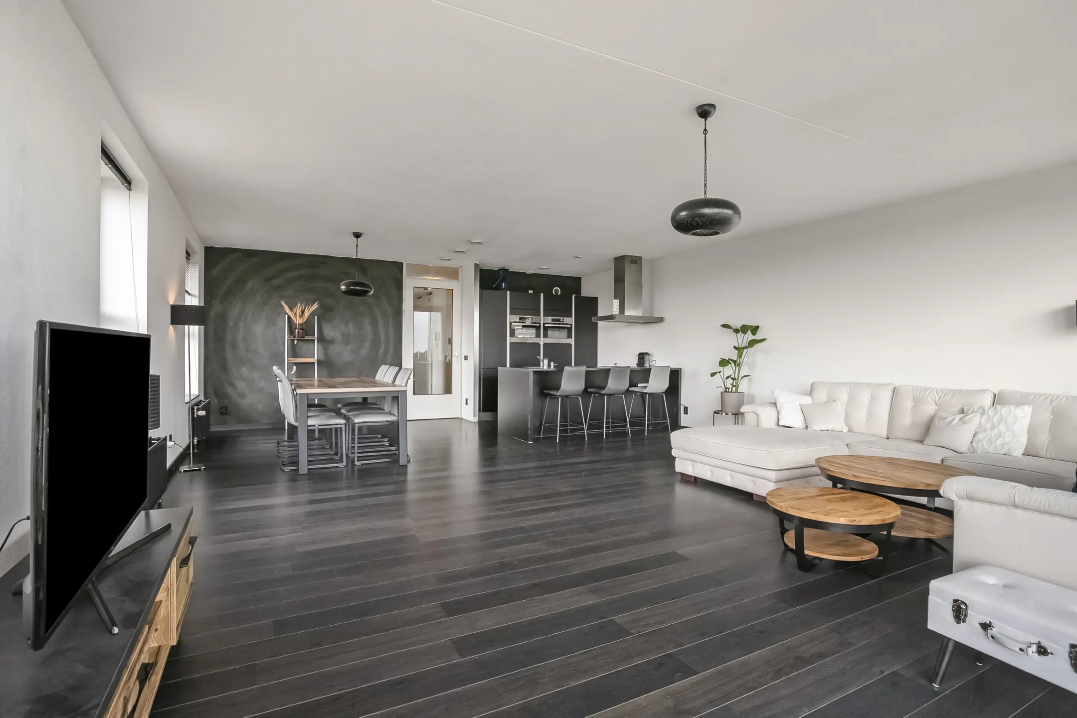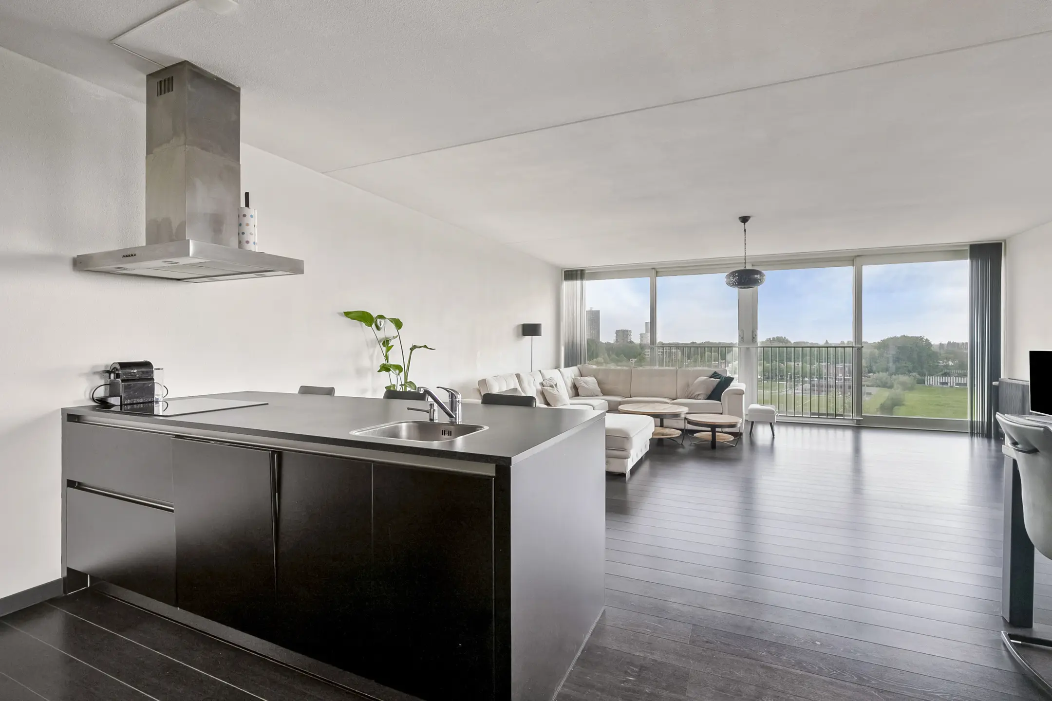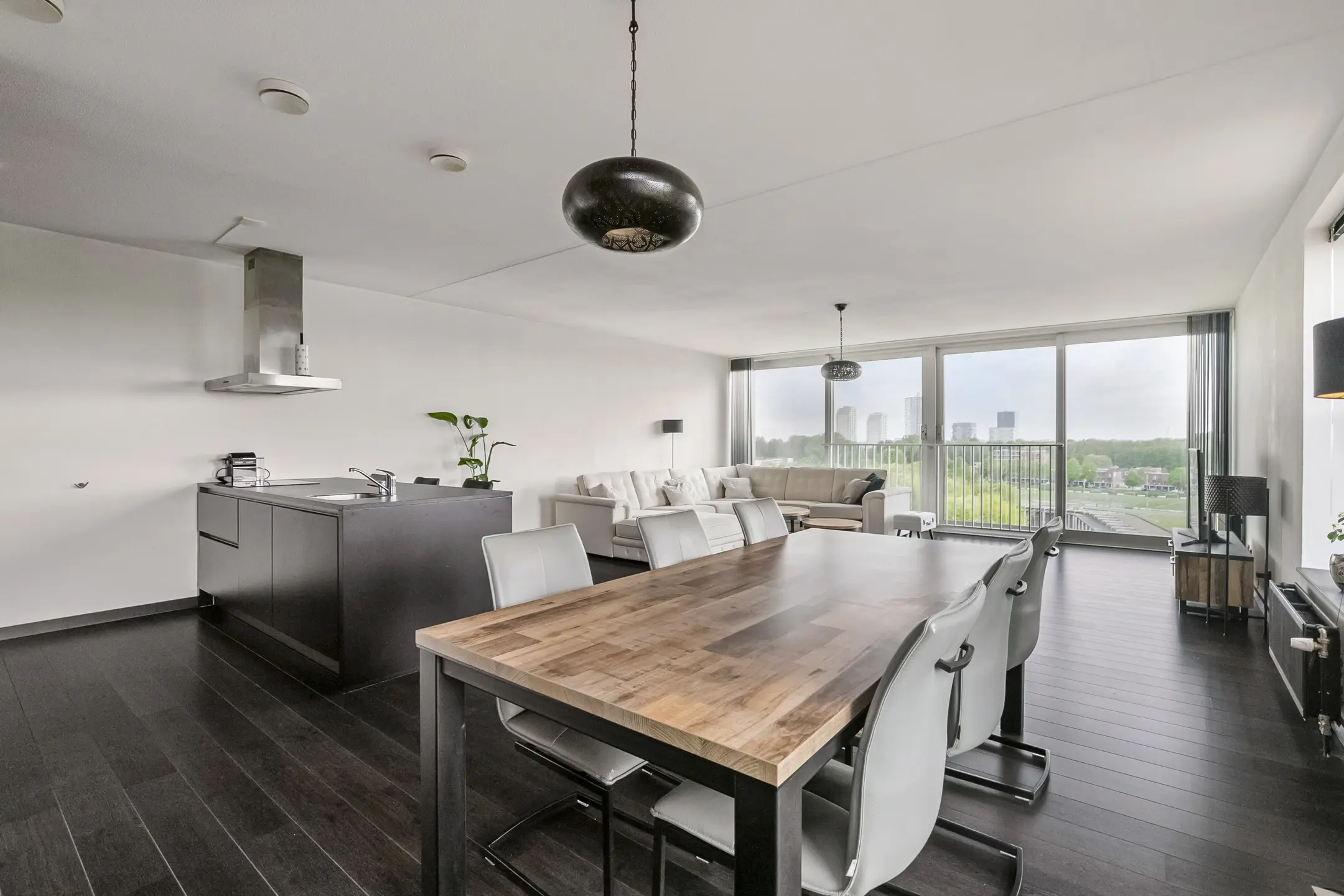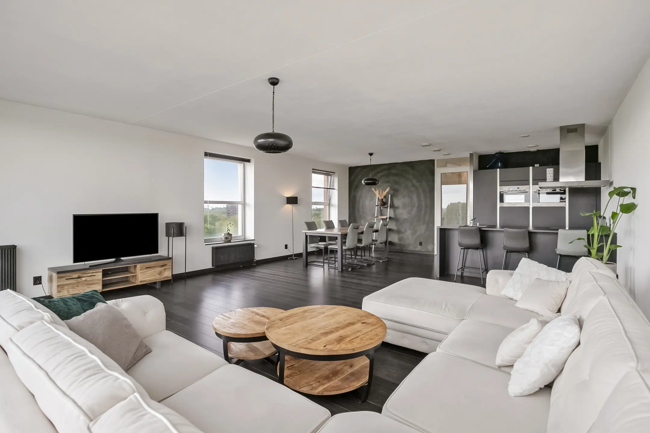 De royale woonkamer geniet van veel lichtinval dankzij de hoekligging en biedt een prachtig uitzicht. De keuken is afgewerkt met hoogglans kasten en voorzien van moderne apparatuur, waaronder een dubbele oven, koelkast, vaatwasser en een keramische kookplaat met afzuigkap.