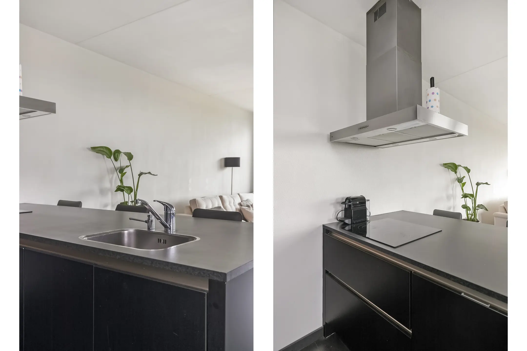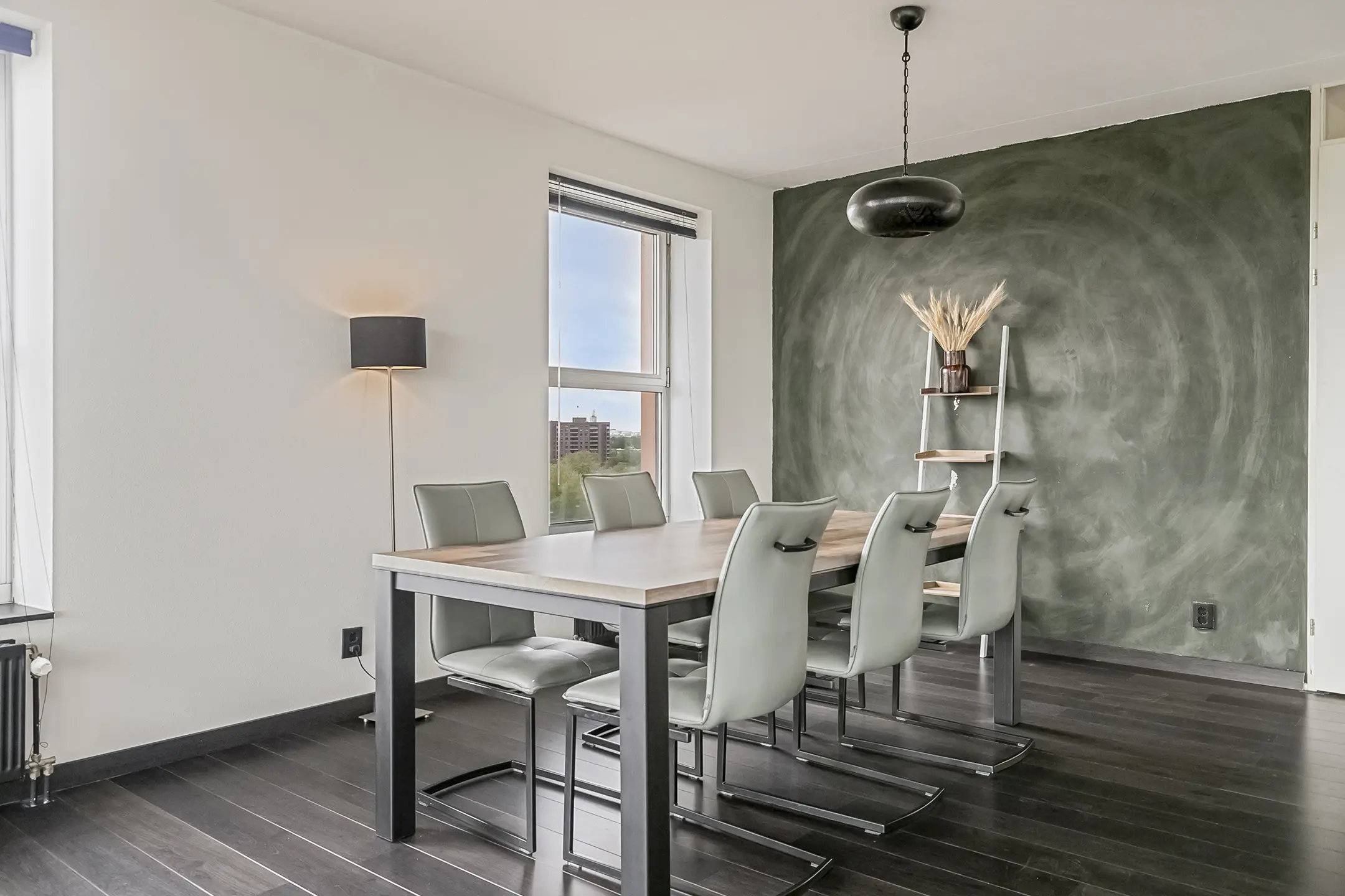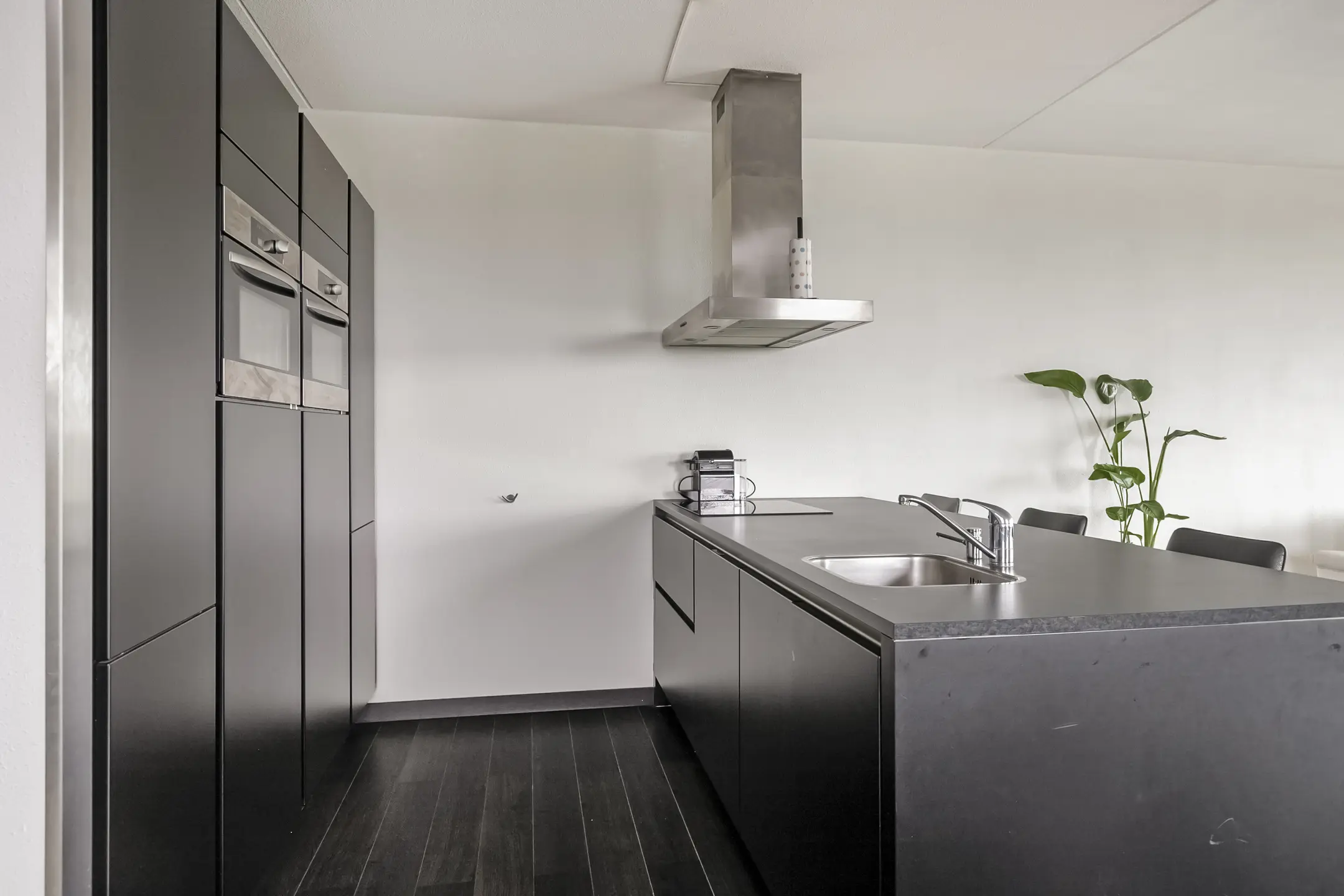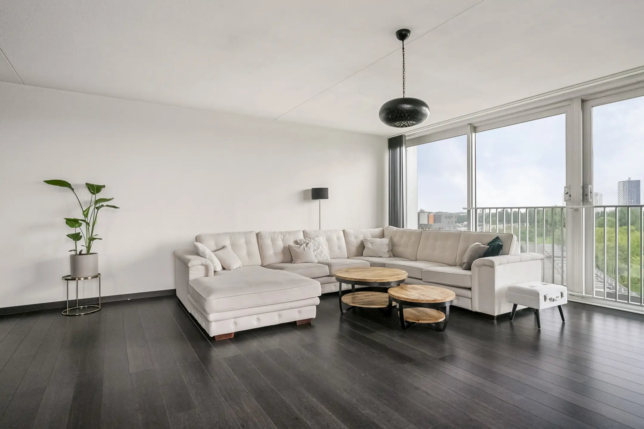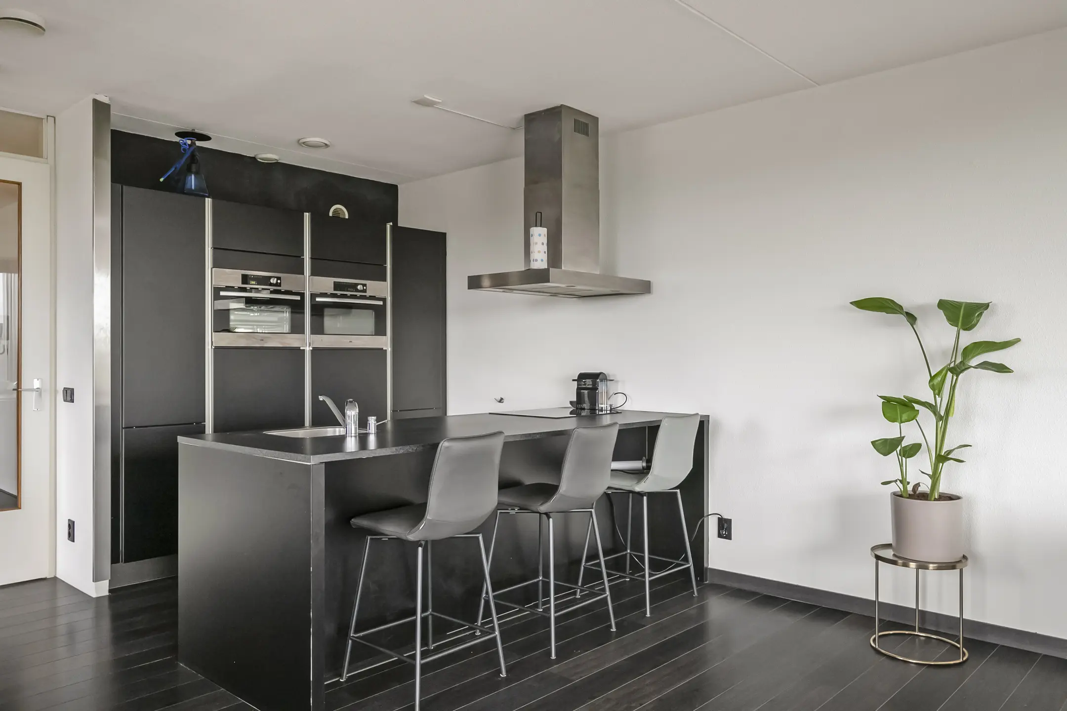 De royale woonkamer geniet van veel lichtinval dankzij de hoekligging en biedt een prachtig uitzicht. De keuken is afgewerkt met hoogglans kasten en voorzien van moderne apparatuur, waaronder een dubbele oven, koelkast, vaatwasser en een keramische kookplaat met afzuigkap.