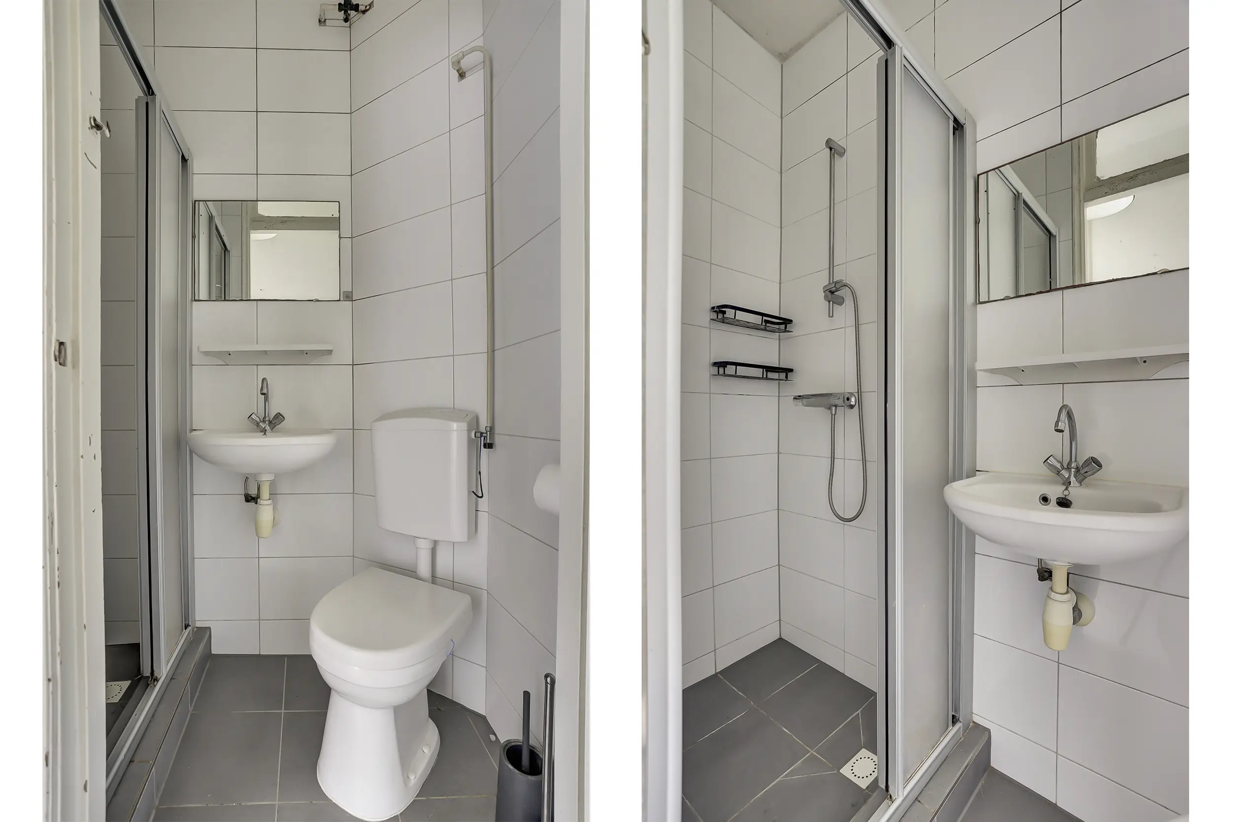 Aan de achterzijde bevindt zich een ruime slaapkamer met eveneens grote ramen, waardoor ook hier het natuurlijke licht naar binnen valt. Vanuit de hal is er toegang tot de eenvoudige keuken met dubbele spoelbak en praktische kastruimte, en de badkamer welke is voorzien van een douche, toilet en wastafel.