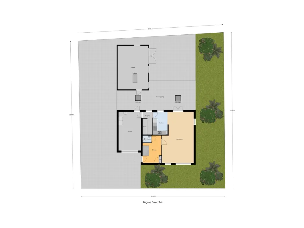 De half open keuken is voorzien van inbouwapparatuur, via een tussenhal heb je toegang tot de garage van 18,5 m2 naast de woning.