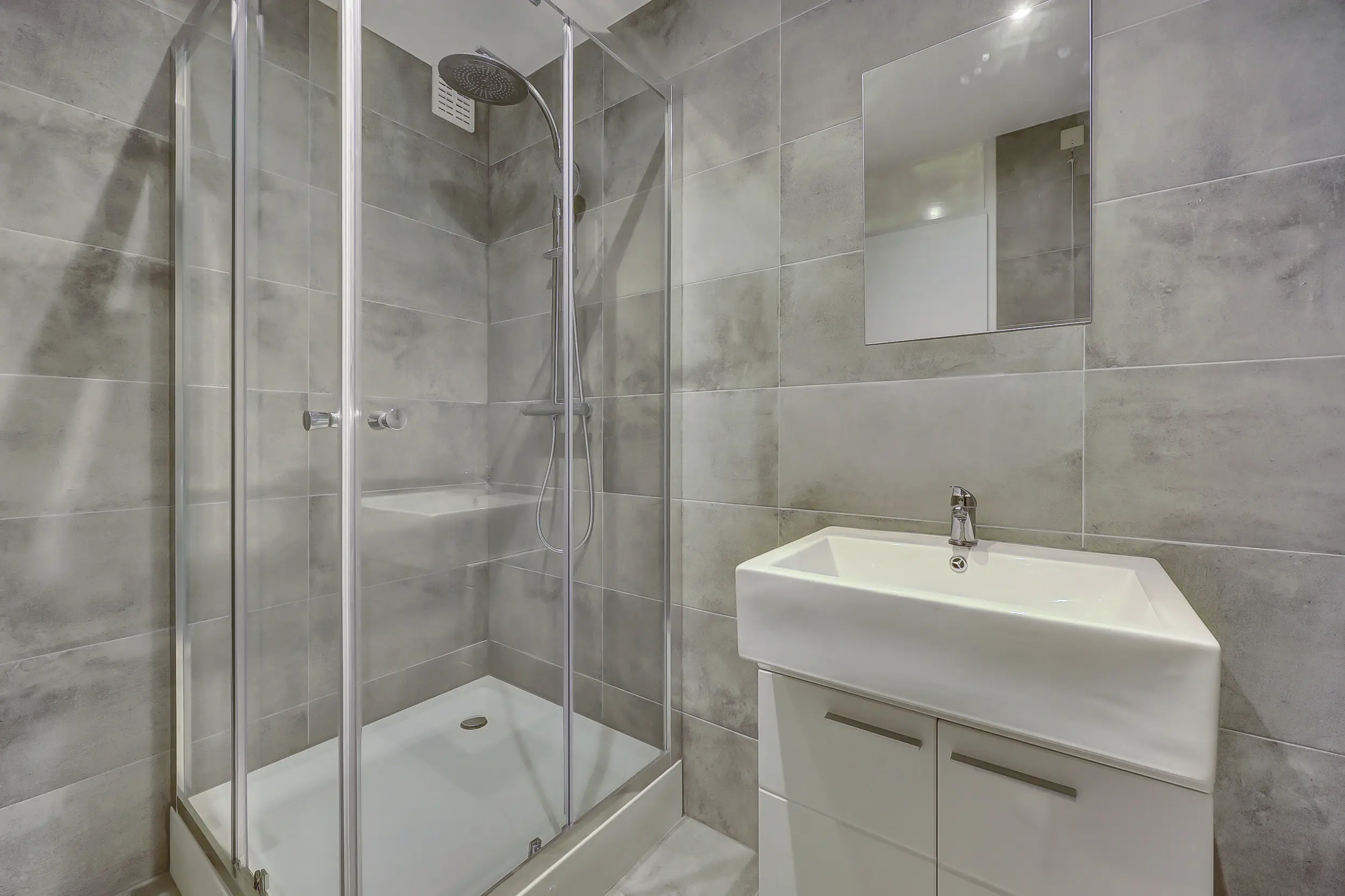 De ruime moderne badkamer (2025) is voorzien van een douche en een stijlvol wastafelmeubel.