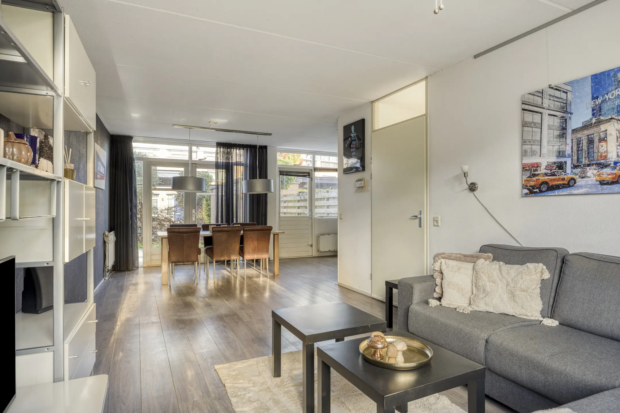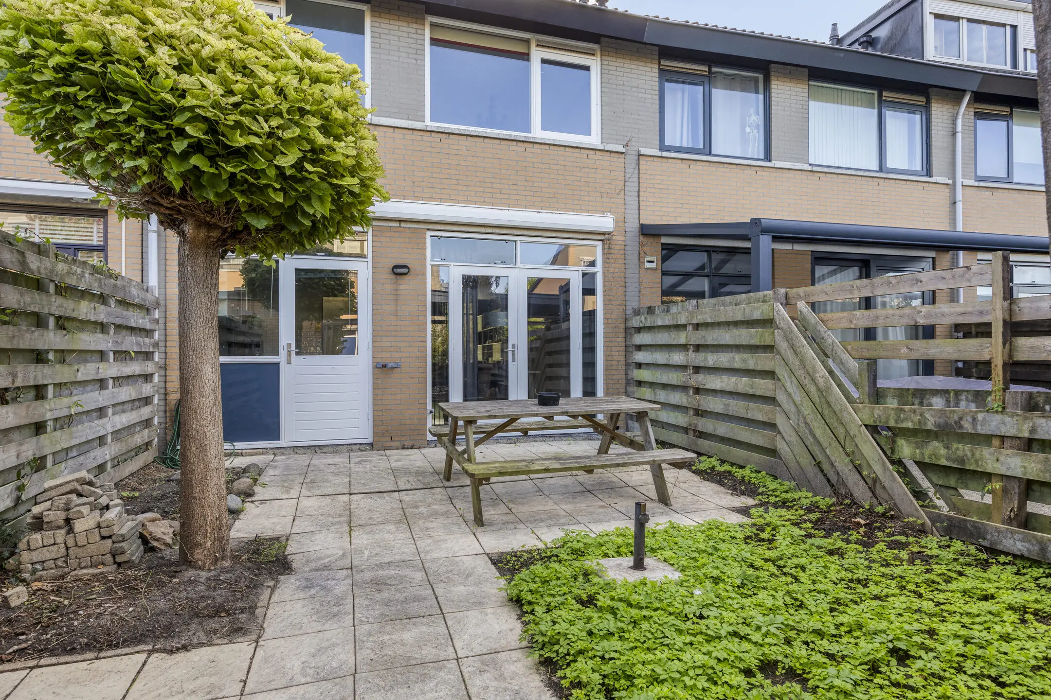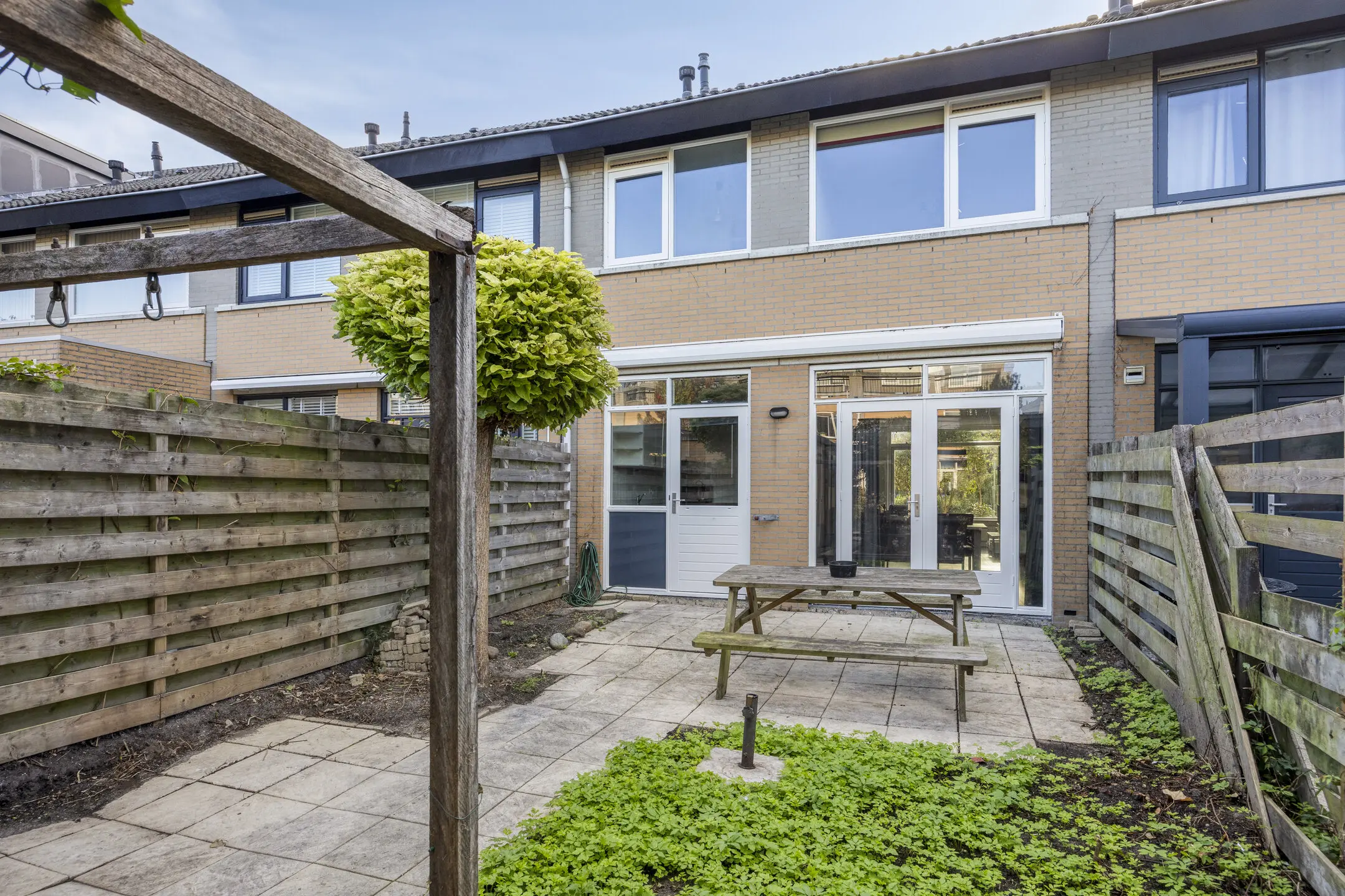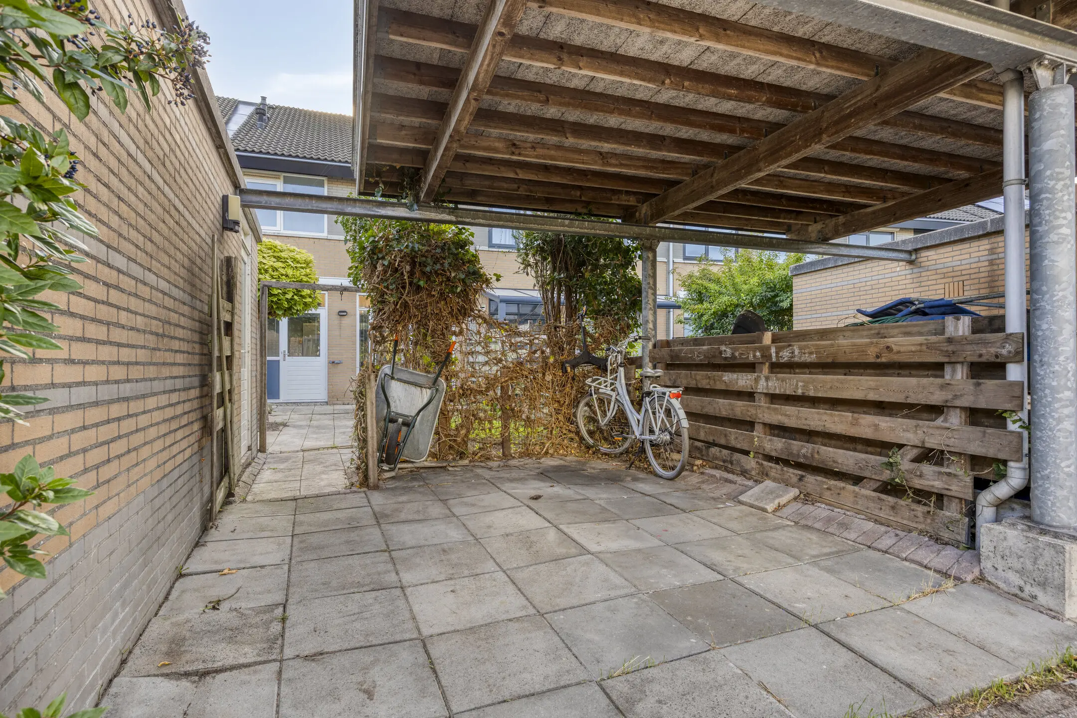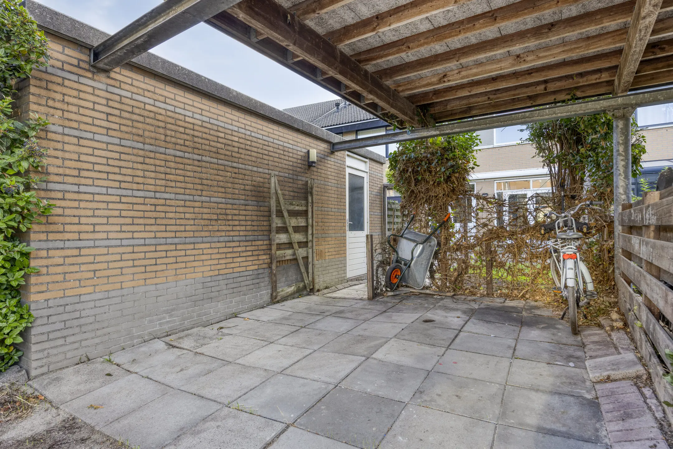 Entree/gang, meterkast, praktische trapkast, in lichte kleurstelling betegelde toiletruimte met fonteintje. Deur naar de living bestaande uit een woonkamer aan de voorzijde van het huis en een keuken in L-opstelling aan de achterzijde. De lichte keuken met donker granieten blad is uitgerust met een vaatwasmachine, inductiekookplaat, afzuigkap, oven (deze werkt niet maar de losse combi-magnetron vervangt deze) en RVS koel-/vriescombinatie. Op de begane grond ligt een laminaatvloer. De tuin is bereikbaar via de openslaande deuren en de deur vanuit de keuken. De tuin ligt op het noord-westen waardoor deze 's-middags en 's-avonds zonnig is. Achter de tuin bevindt zich de carport met eigen parkeerplaats. In de tuin is een buitenkraan aanwezig en een stenen berging met elektra. Het zonnescherm houdt de zon uit de woning.