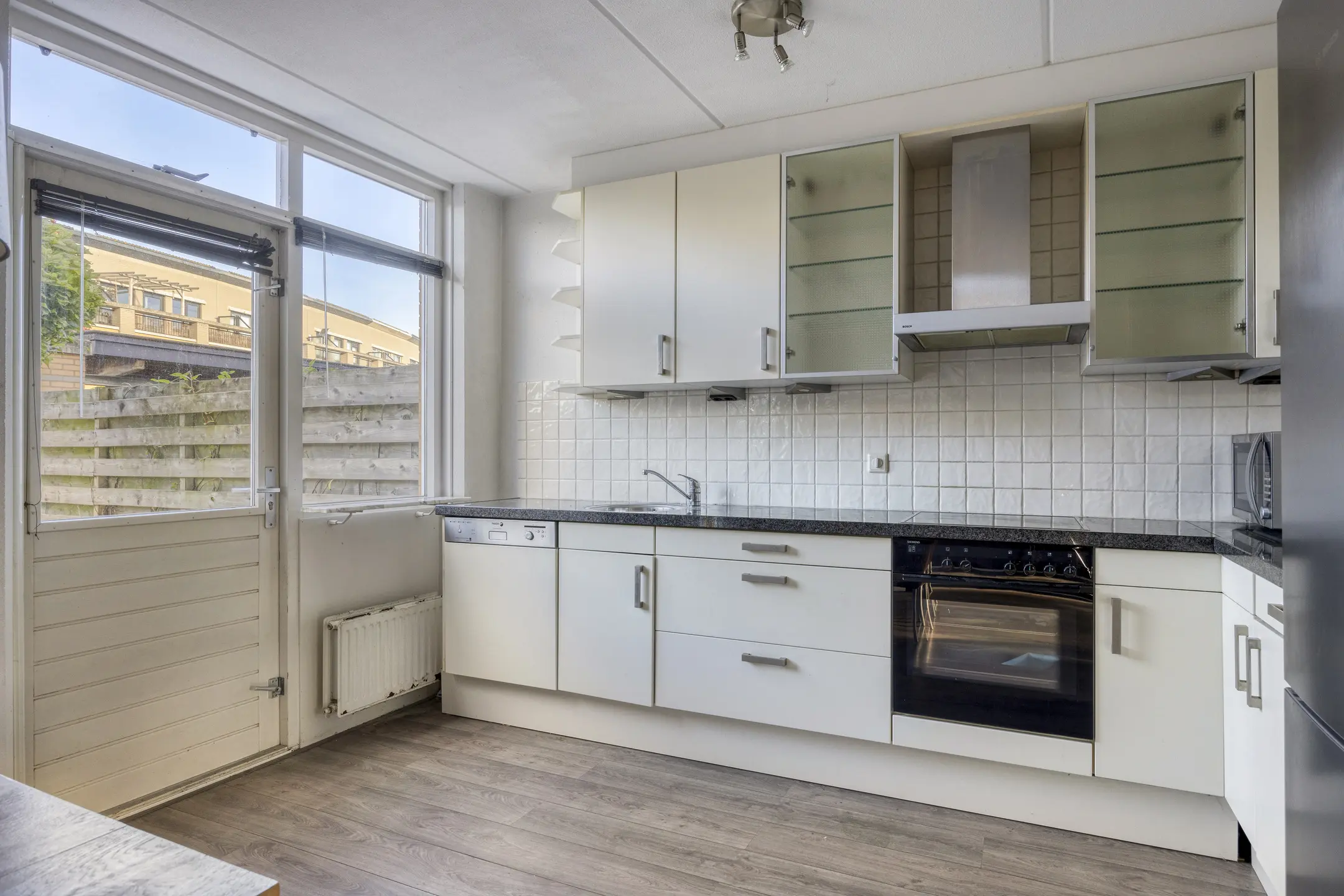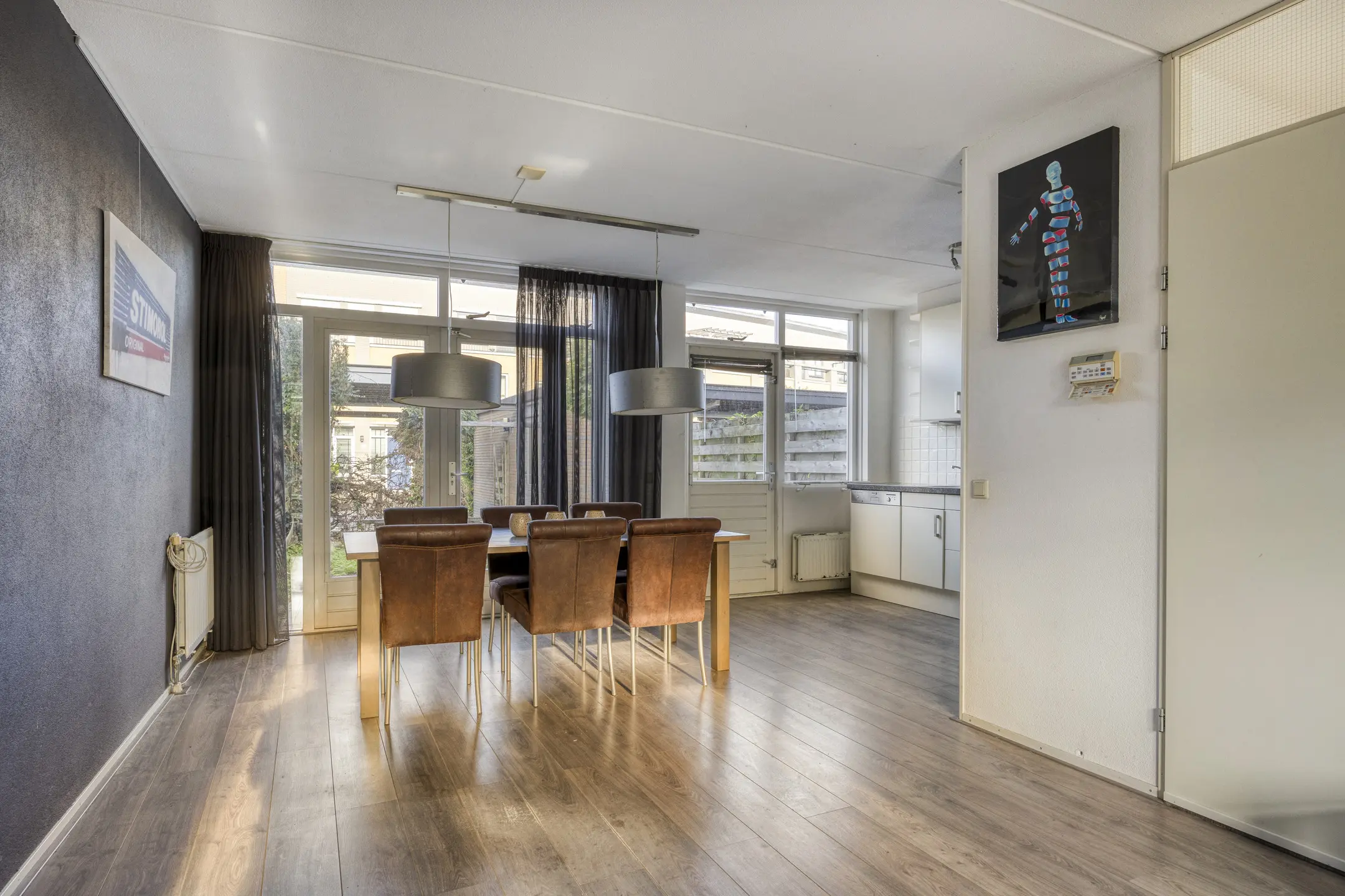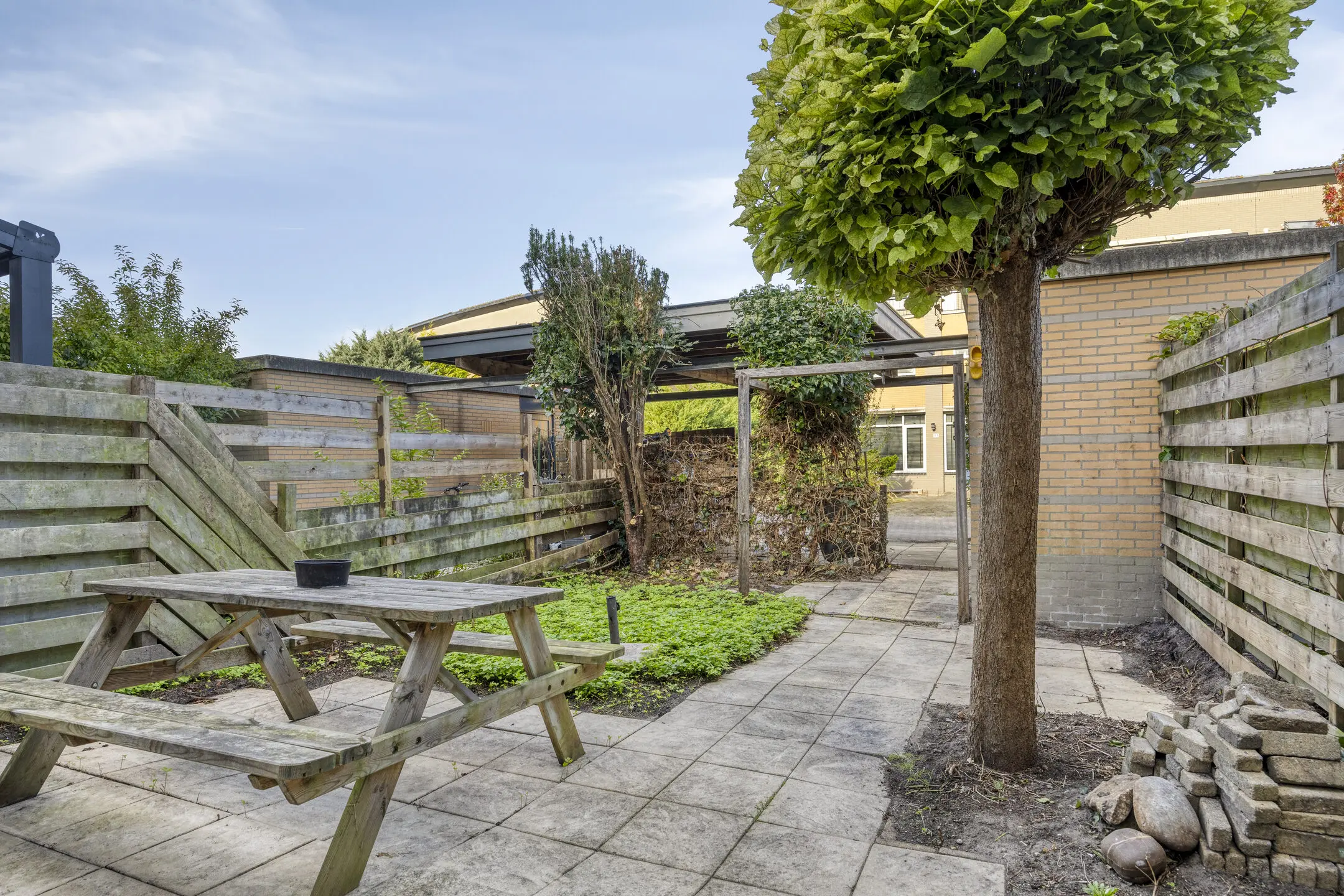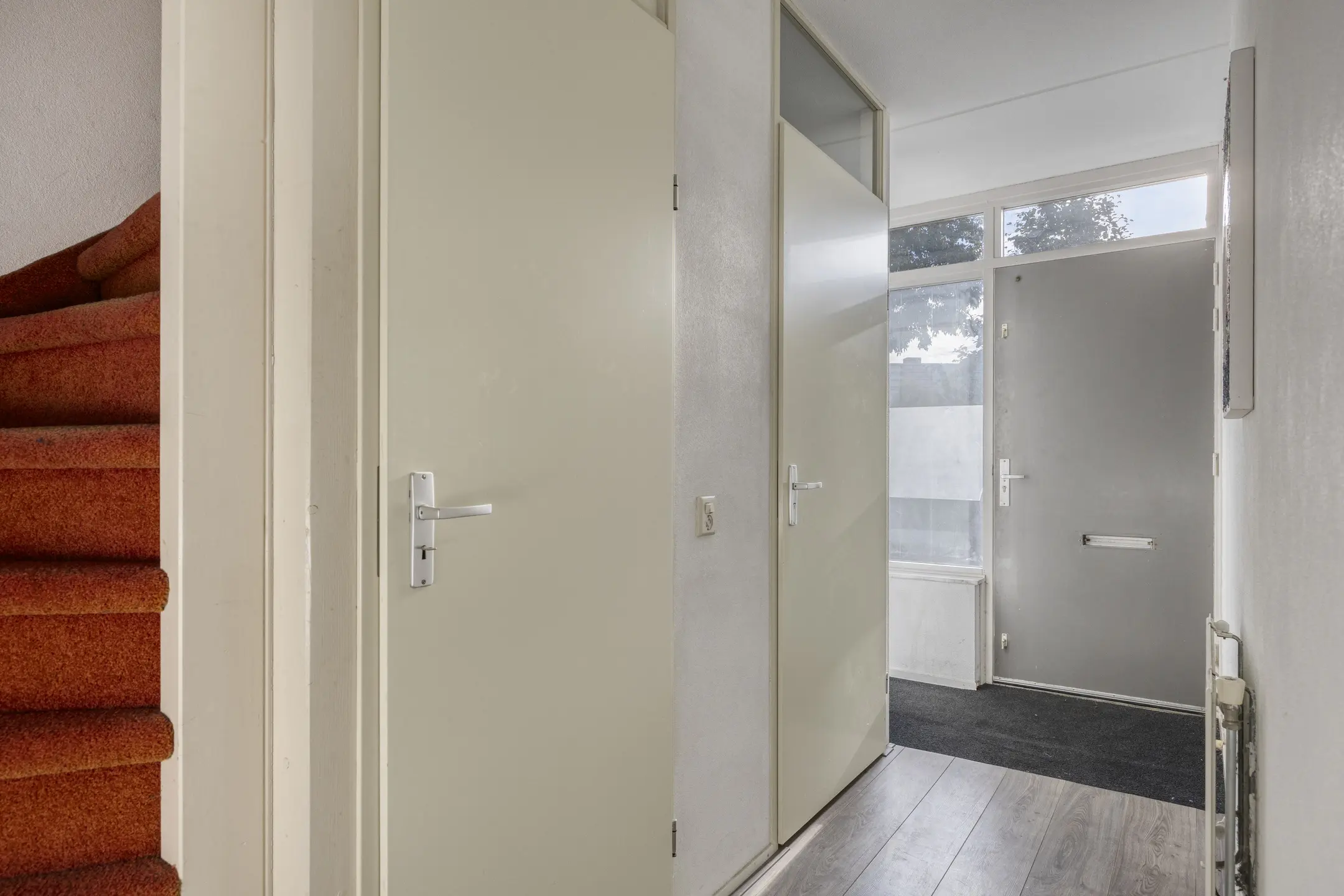 Entree/gang, meterkast, praktische trapkast, in lichte kleurstelling betegelde toiletruimte met fonteintje. Deur naar de living bestaande uit een woonkamer aan de voorzijde van het huis en een keuken in L-opstelling aan de achterzijde. De lichte keuken met donker granieten blad is uitgerust met een vaatwasmachine, inductiekookplaat, afzuigkap, oven (deze werkt niet maar de losse combi-magnetron vervangt deze) en RVS koel-/vriescombinatie. Op de begane grond ligt een laminaatvloer. De tuin is bereikbaar via de openslaande deuren en de deur vanuit de keuken. De tuin ligt op het noord-westen waardoor deze 's-middags en 's-avonds zonnig is. Achter de tuin bevindt zich de carport met eigen parkeerplaats. In de tuin is een buitenkraan aanwezig en een stenen berging met elektra. Het zonnescherm houdt de zon uit de woning.