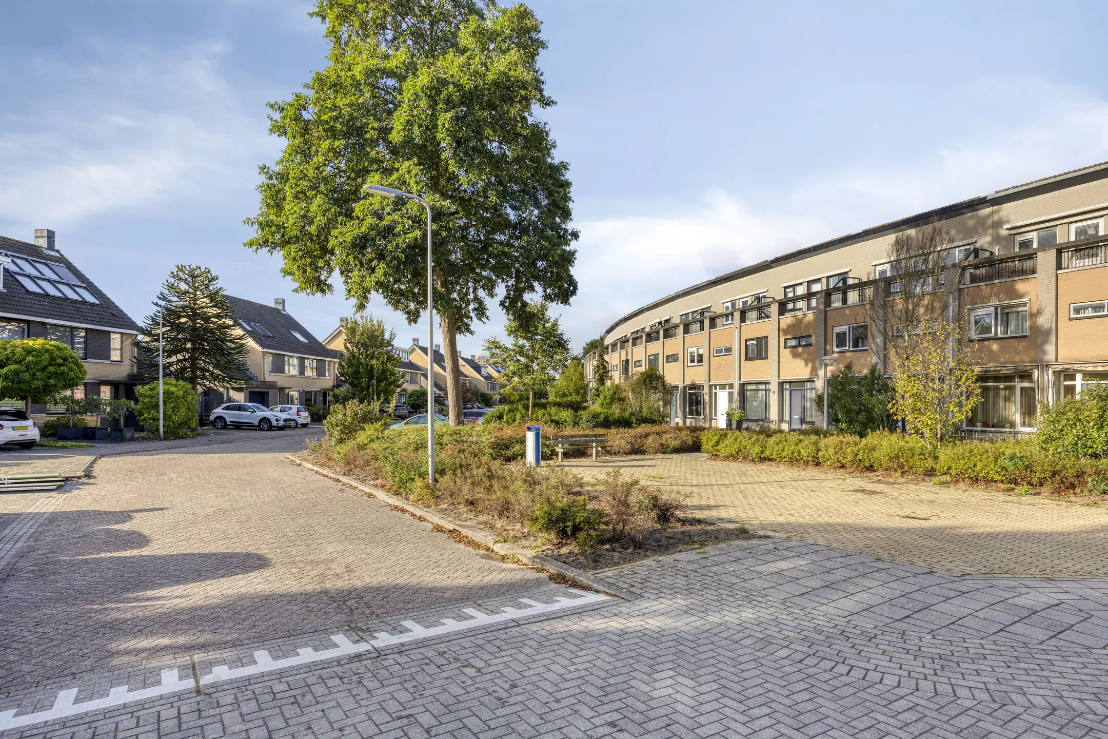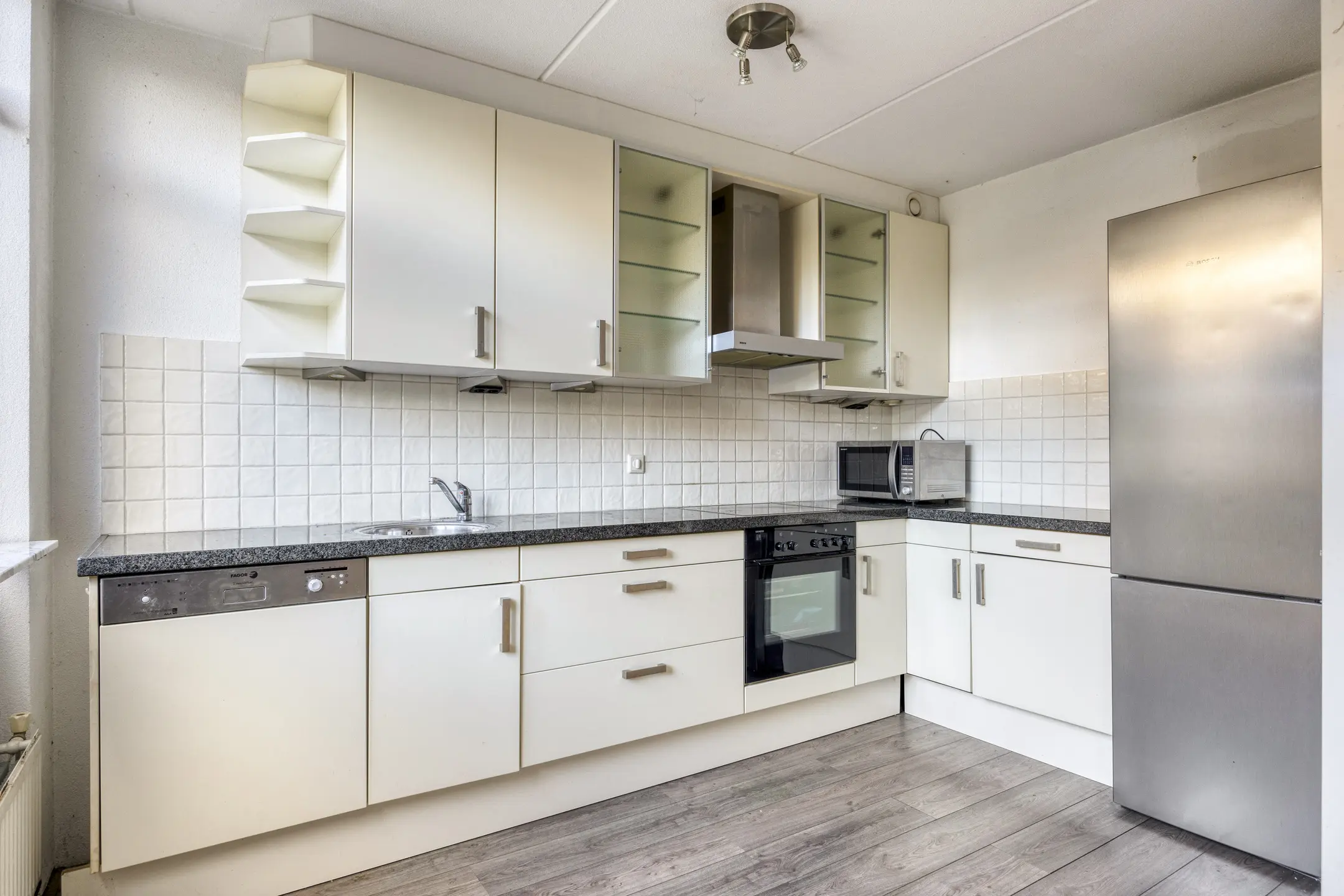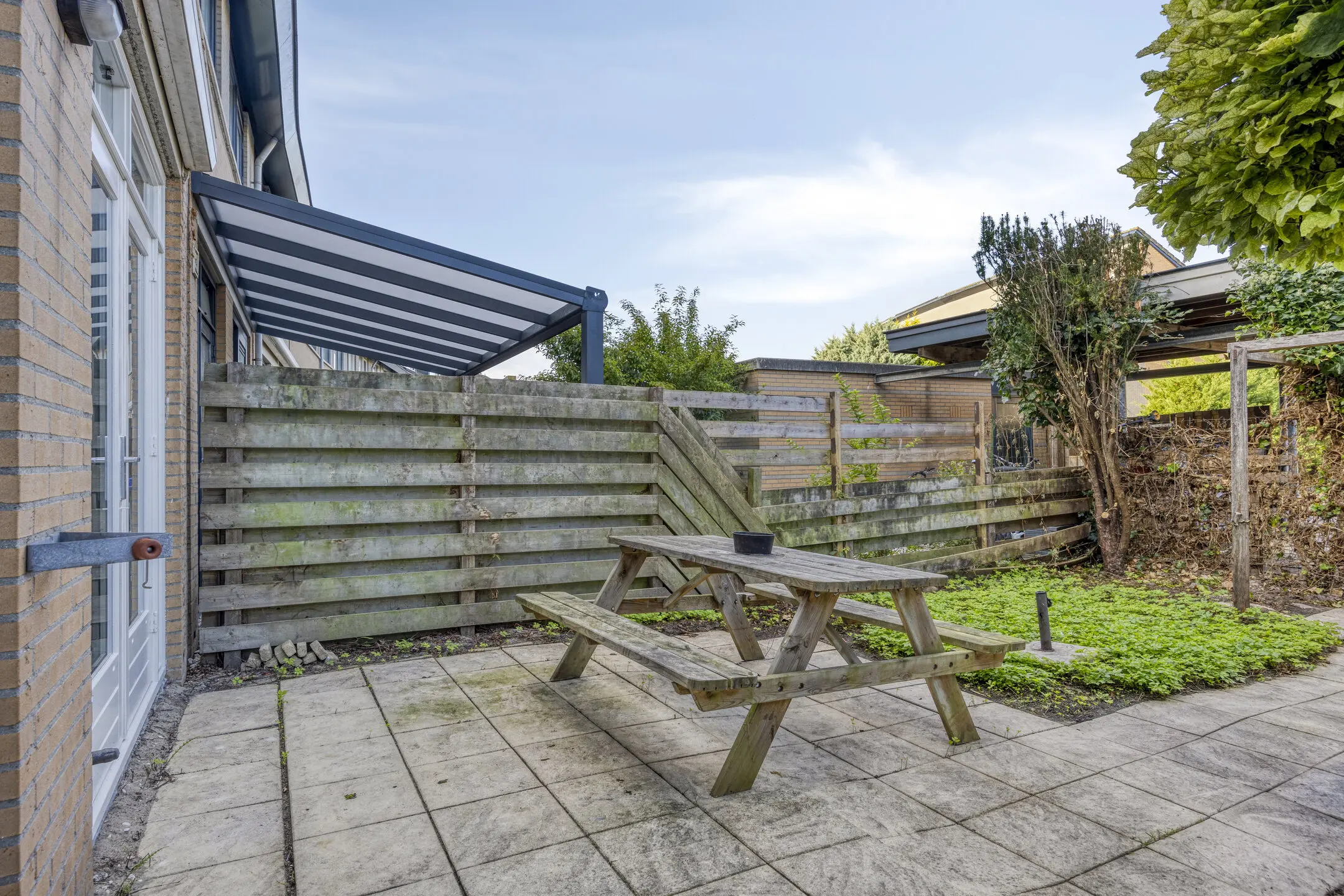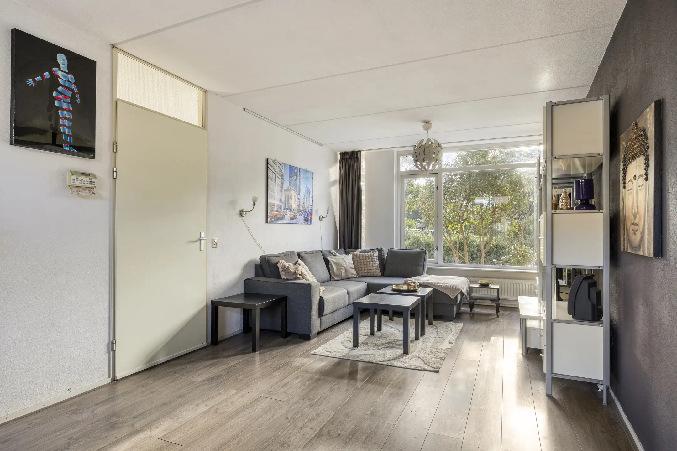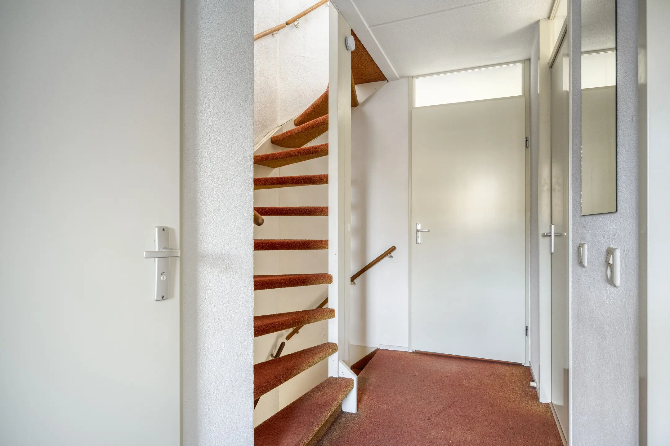 Entree/gang, meterkast, praktische trapkast, in lichte kleurstelling betegelde toiletruimte met fonteintje. Deur naar de living bestaande uit een woonkamer aan de voorzijde van het huis en een keuken in L-opstelling aan de achterzijde. De lichte keuken met donker granieten blad is uitgerust met een vaatwasmachine, inductiekookplaat, afzuigkap, oven (deze werkt niet maar de losse combi-magnetron vervangt deze) en RVS koel-/vriescombinatie. Op de begane grond ligt een laminaatvloer. De tuin is bereikbaar via de openslaande deuren en de deur vanuit de keuken. De tuin ligt op het noord-westen waardoor deze 's-middags en 's-avonds zonnig is. Achter de tuin bevindt zich de carport met eigen parkeerplaats. In de tuin is een buitenkraan aanwezig en een stenen berging met elektra. Het zonnescherm houdt de zon uit de woning.