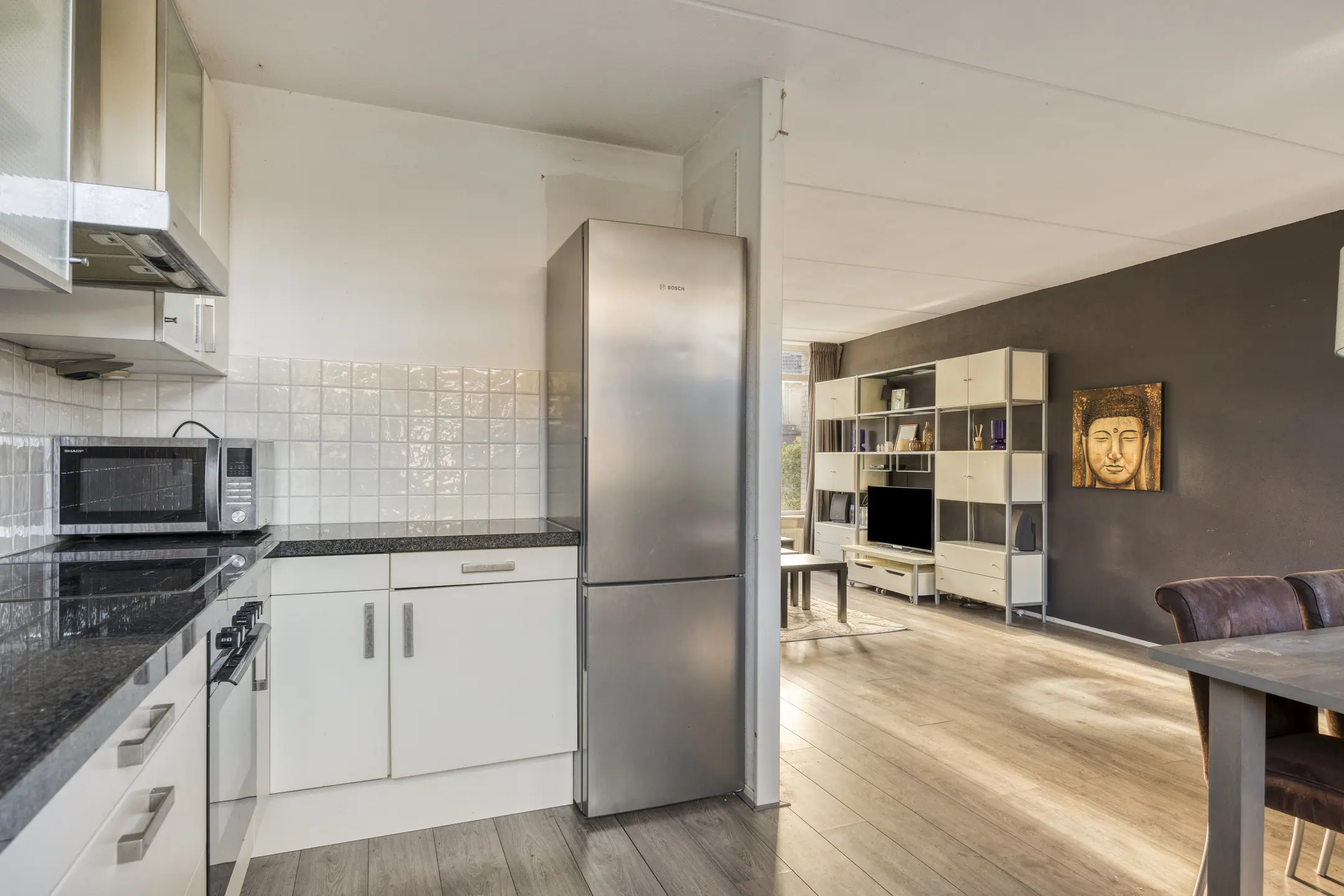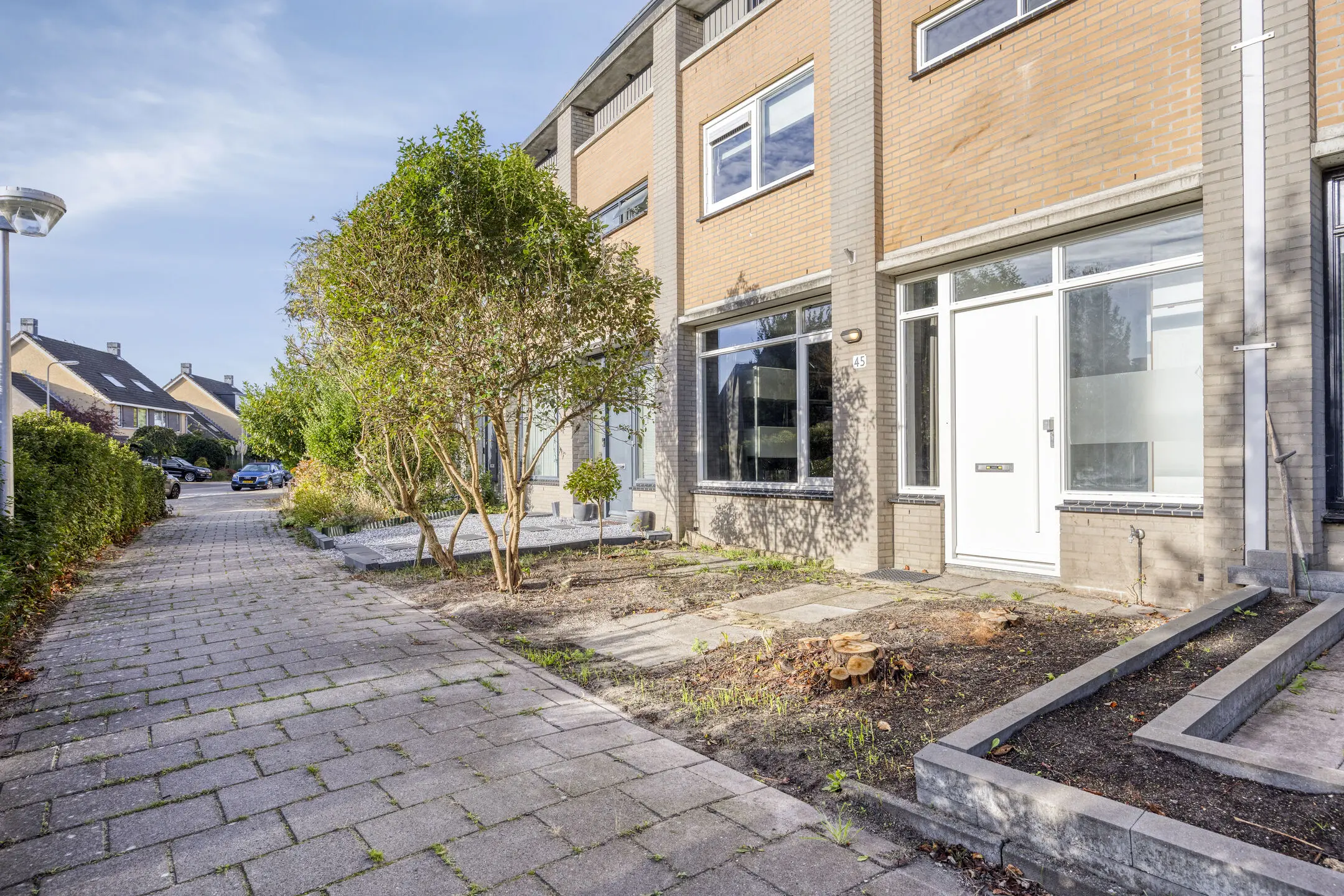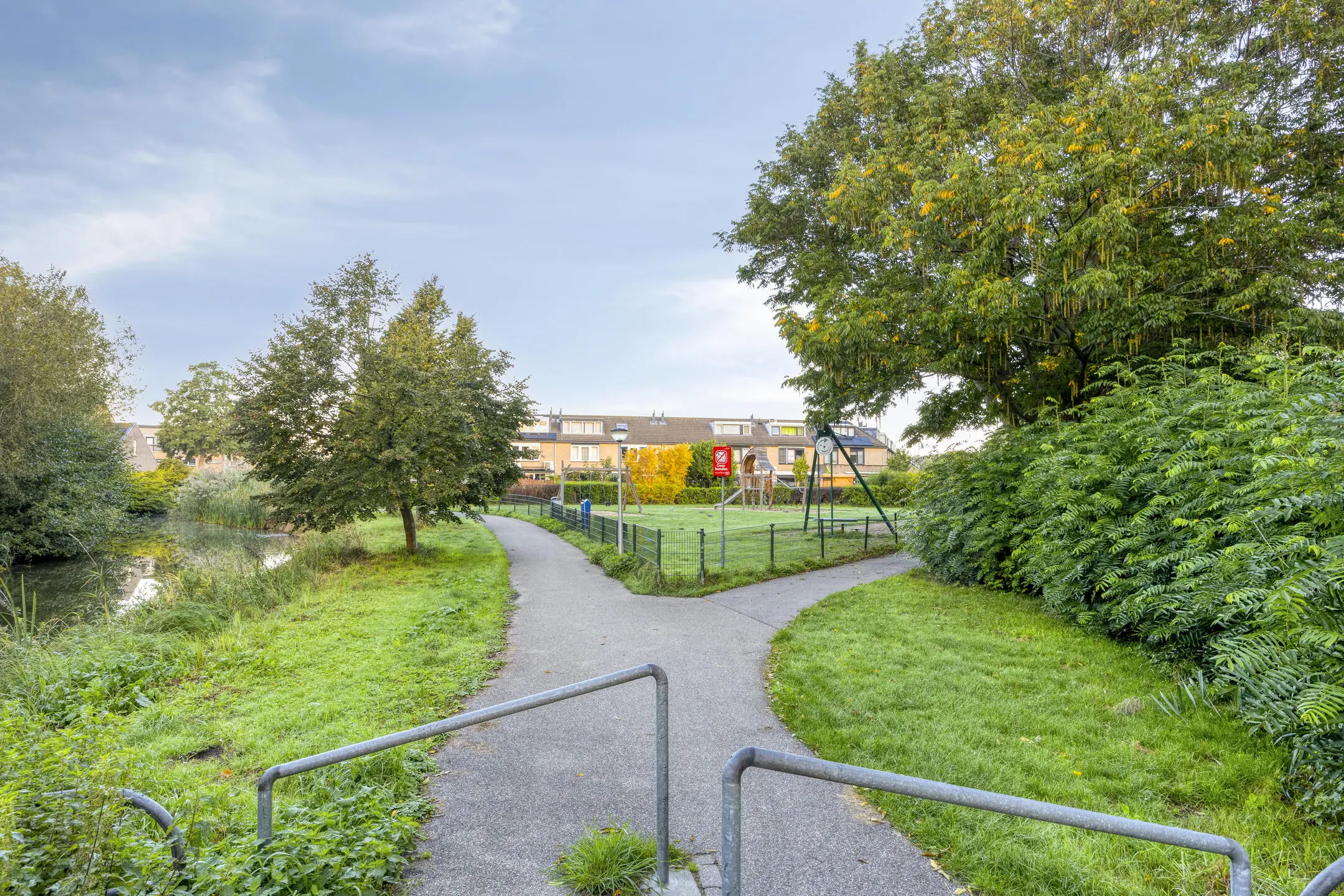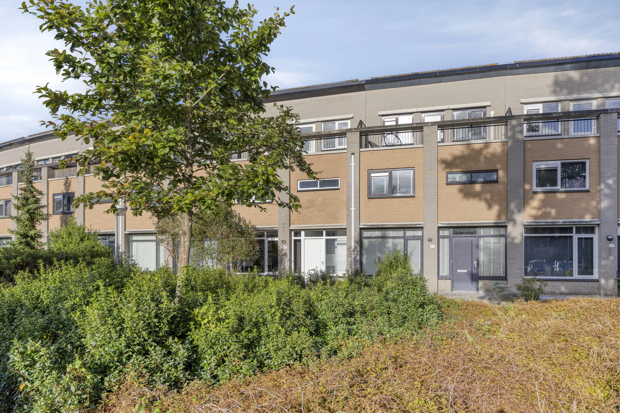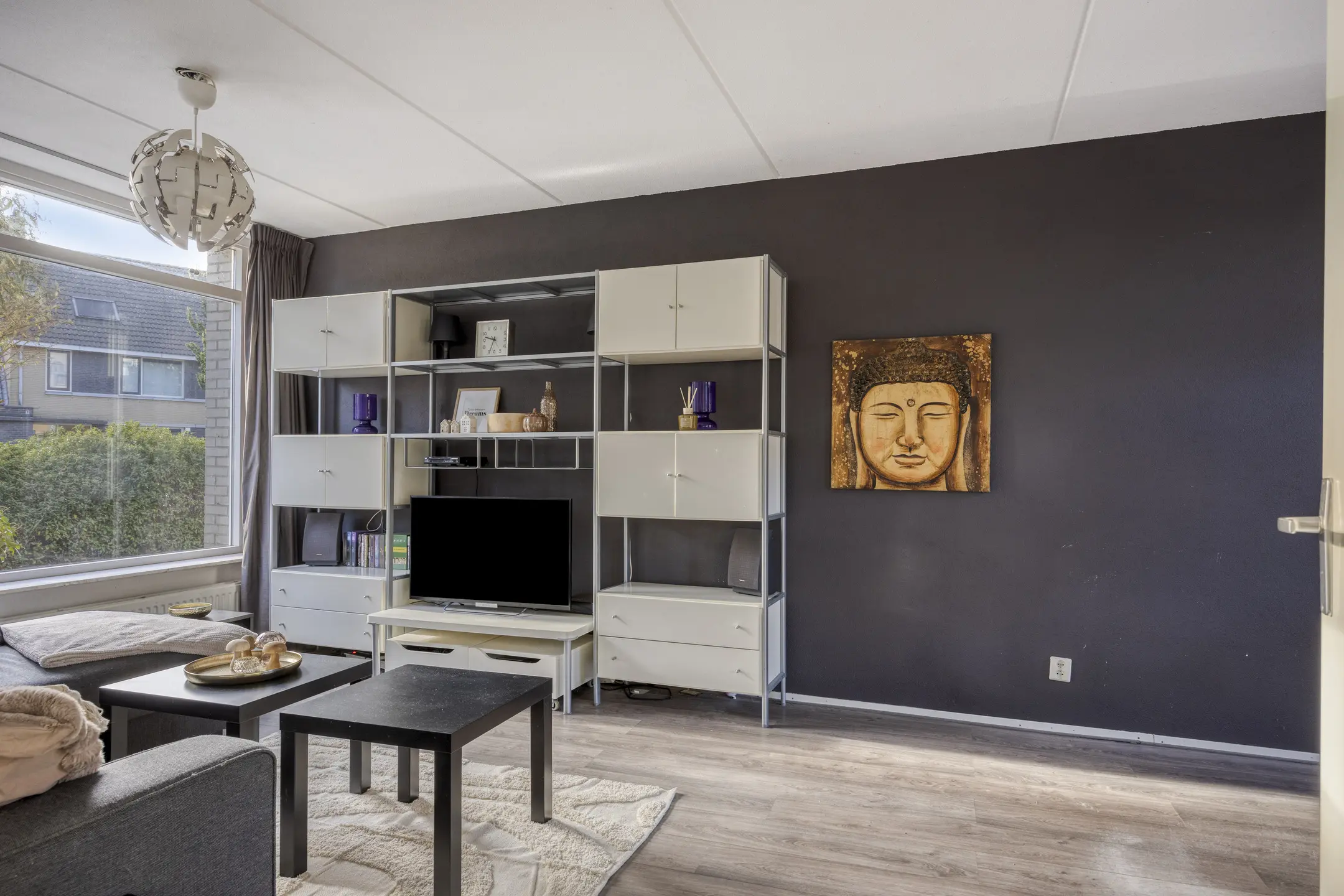 Entree/gang, meterkast, praktische trapkast, in lichte kleurstelling betegelde toiletruimte met fonteintje. Deur naar de living bestaande uit een woonkamer aan de voorzijde van het huis en een keuken in L-opstelling aan de achterzijde. De lichte keuken met donker granieten blad is uitgerust met een vaatwasmachine, inductiekookplaat, afzuigkap, oven (deze werkt niet maar de losse combi-magnetron vervangt deze) en RVS koel-/vriescombinatie. Op de begane grond ligt een laminaatvloer. De tuin is bereikbaar via de openslaande deuren en de deur vanuit de keuken. De tuin ligt op het noord-westen waardoor deze 's-middags en 's-avonds zonnig is. Achter de tuin bevindt zich de carport met eigen parkeerplaats. In de tuin is een buitenkraan aanwezig en een stenen berging met elektra. Het zonnescherm houdt de zon uit de woning.