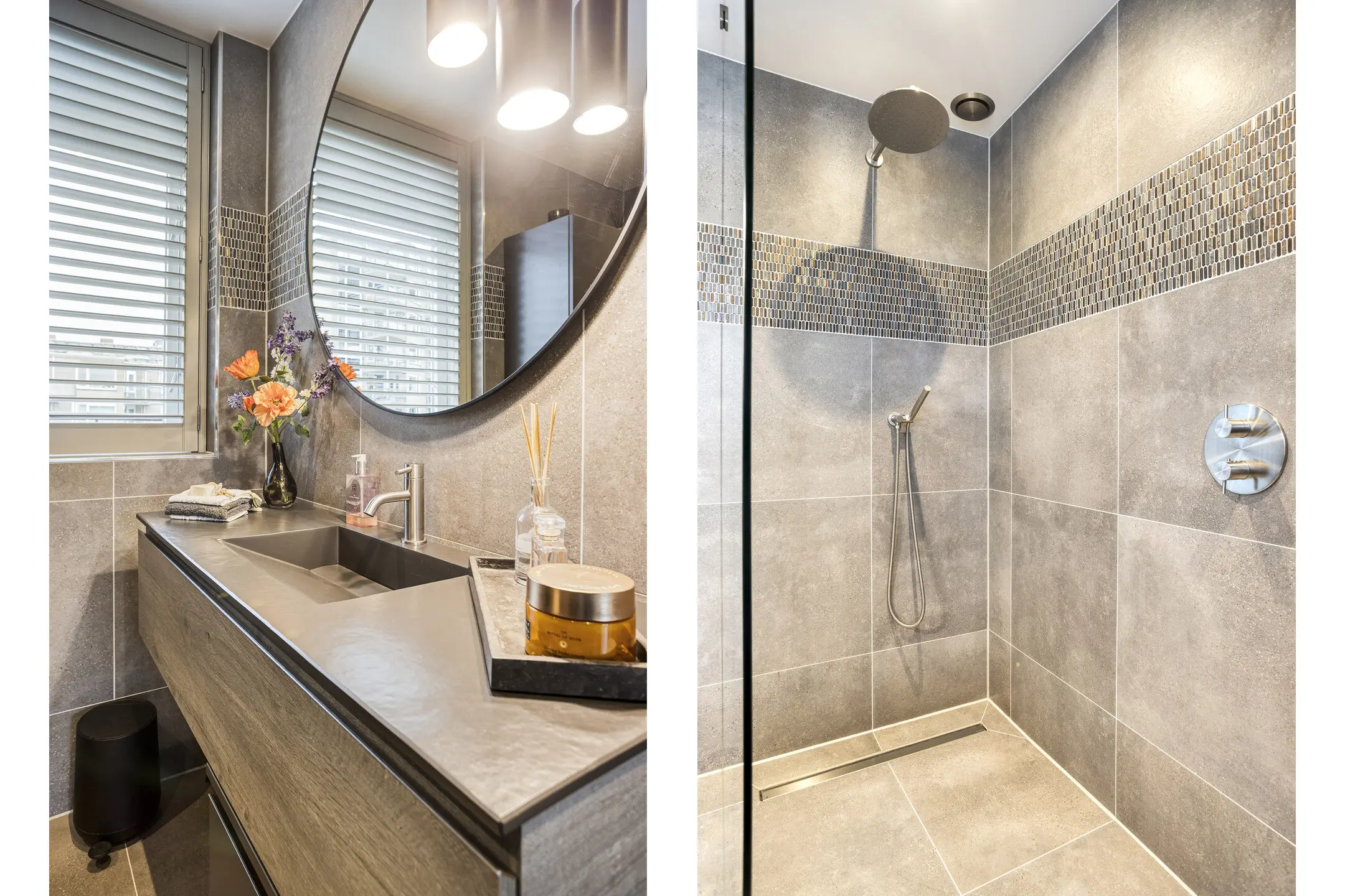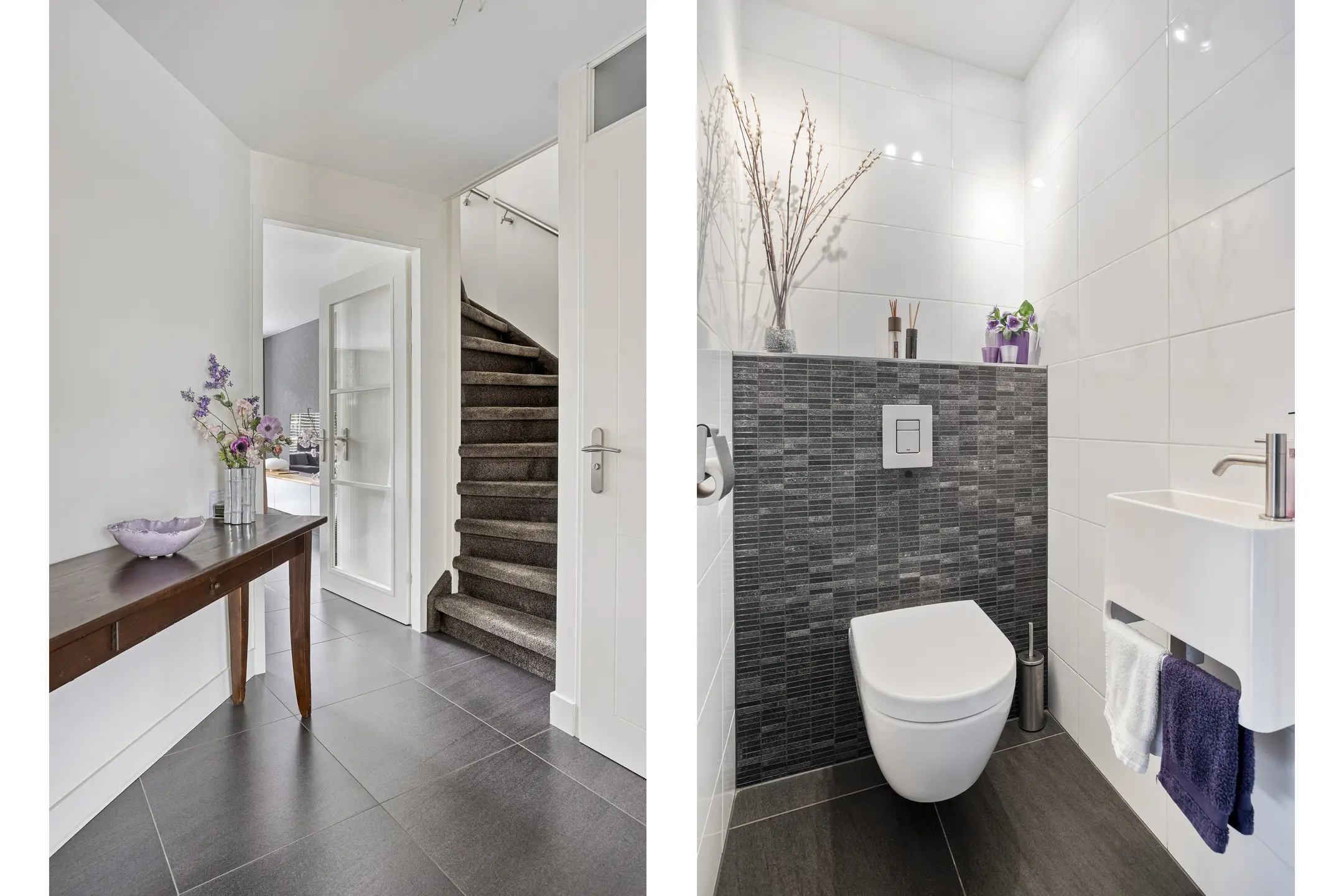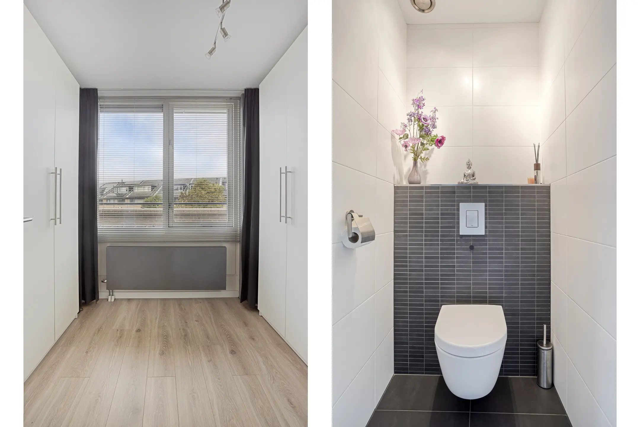 De geheel betegelde luxe badkamer is in 2020 vernieuwd en is uitgerust met een inloopdouche, wastafelmeubel, spiegel en twee kasten. Prettig is het raam dat open kan zodat er naast de mechanische ventilatie ook op een natuurlijke manier geventileerd kan worden. Separate toiletruimte (2016) in grijs/witte kleurstelling met wandcloset.