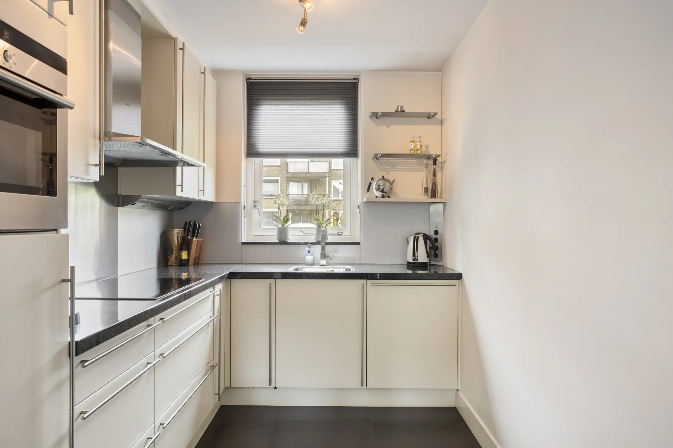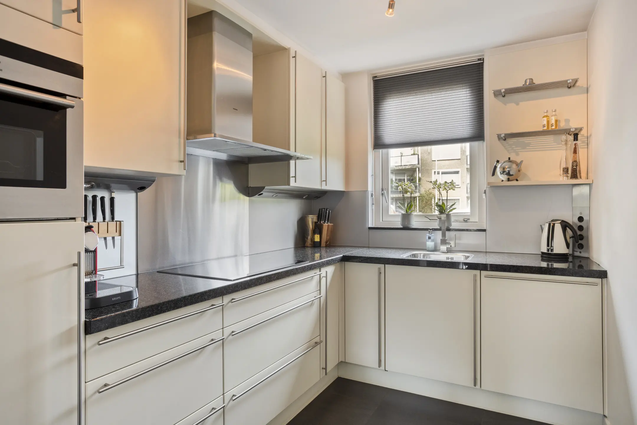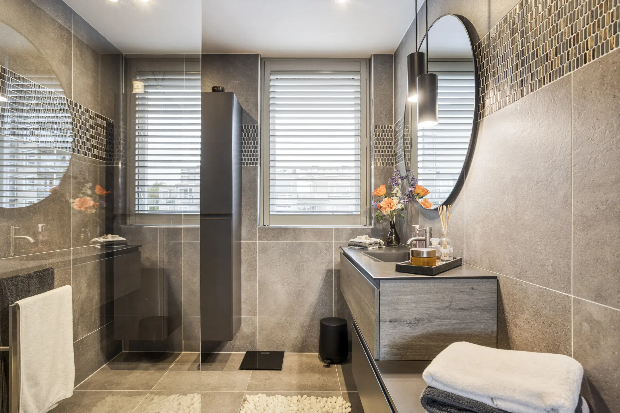 De geheel betegelde luxe badkamer is in 2020 vernieuwd en is uitgerust met een inloopdouche, wastafelmeubel, spiegel en twee kasten. Prettig is het raam dat open kan zodat er naast de mechanische ventilatie ook op een natuurlijke manier geventileerd kan worden. Separate toiletruimte (2016) in grijs/witte kleurstelling met wandcloset.