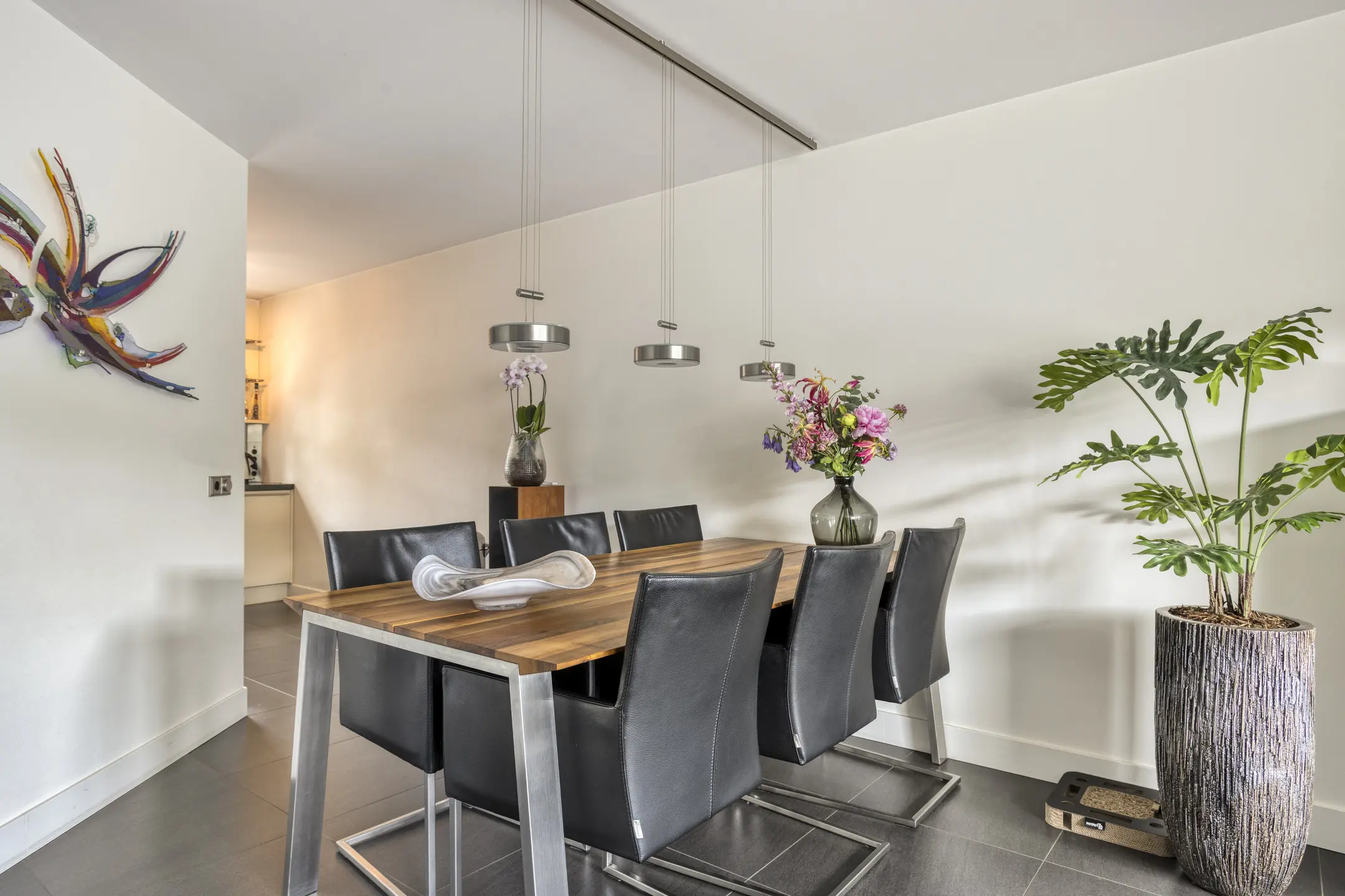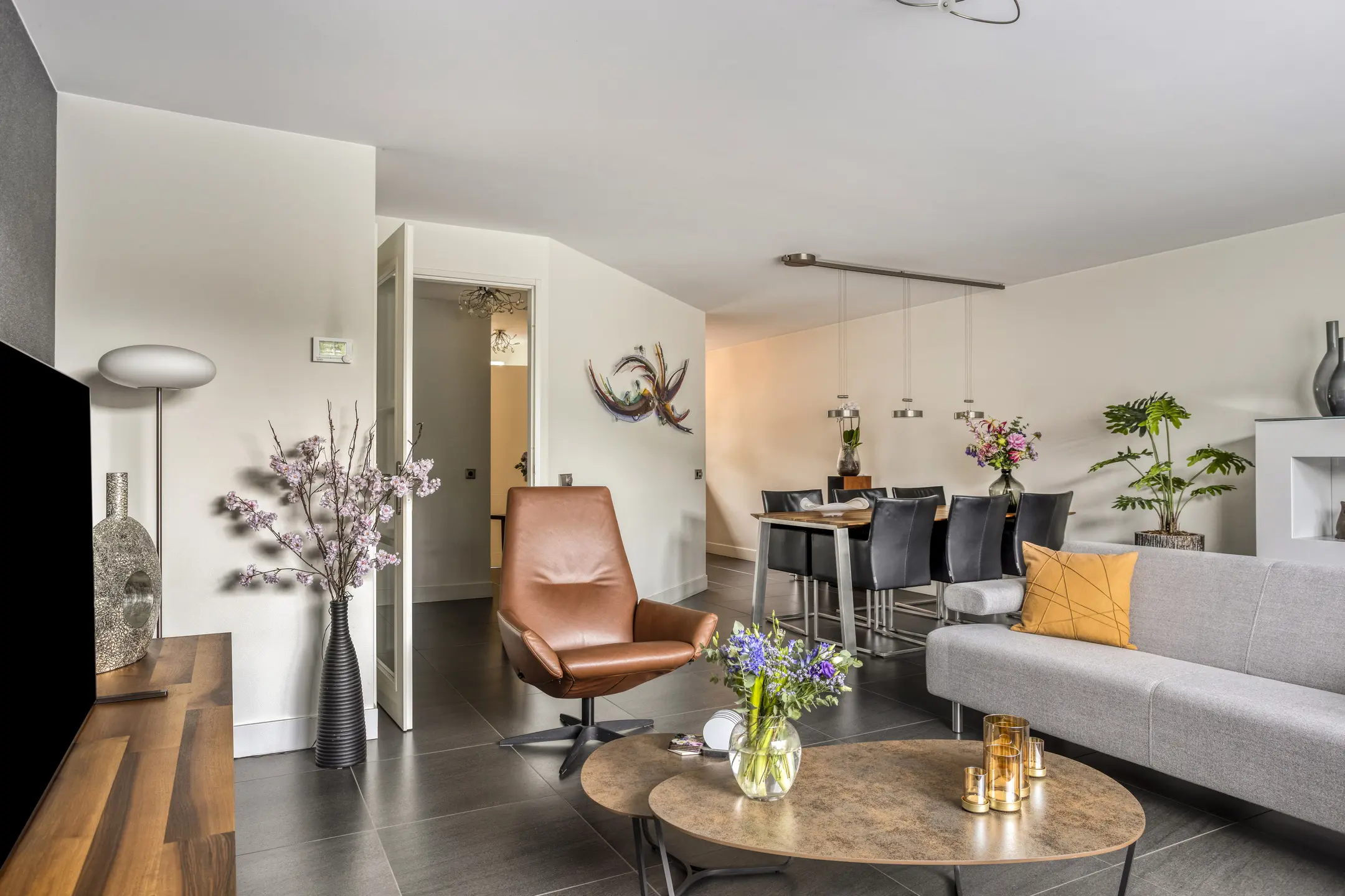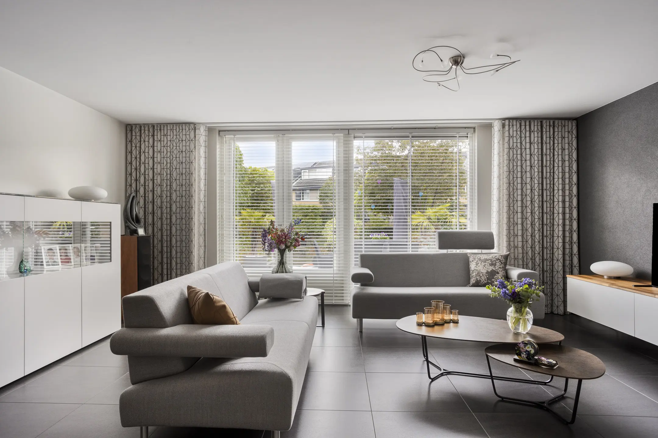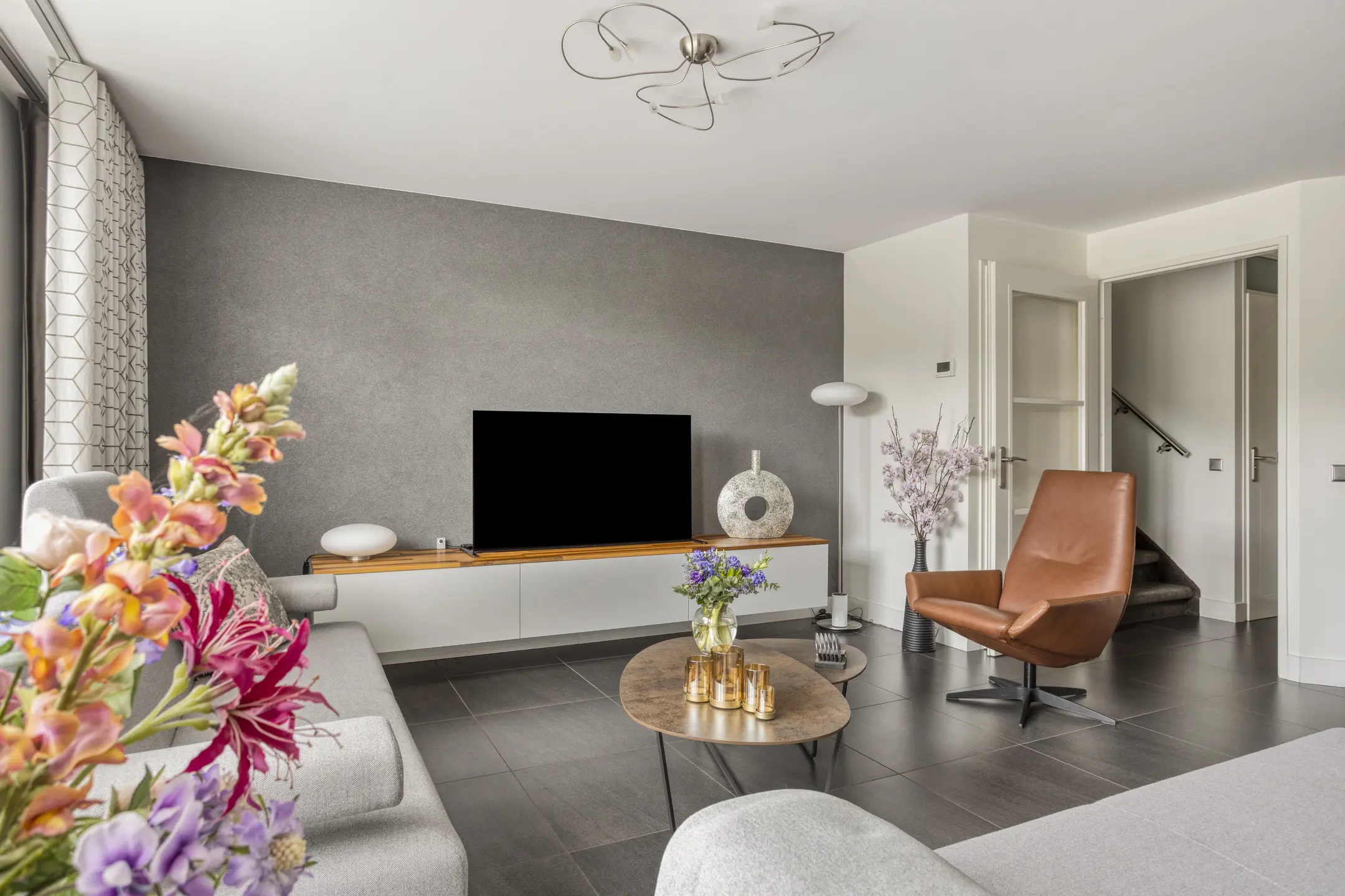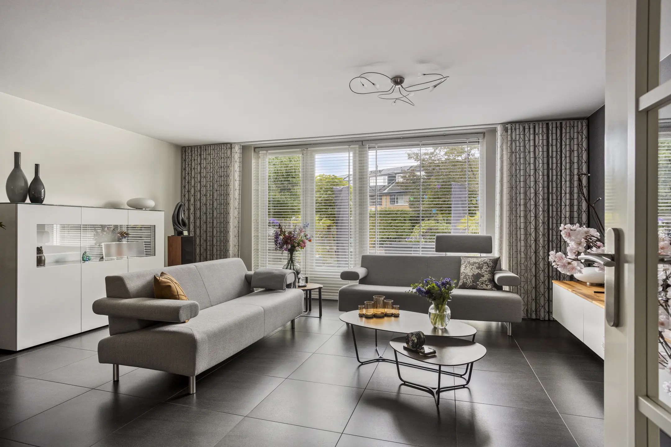 Entree, hal met meterkast, trapopgang en ruime trapkast. De aangebouwde berging is een praktische ruimte en is vanuit de voortuin en vanuit de hal te bereiken. Geheel met grijs/witte tegels betegelde toiletruimte met wandcloset en modern fonteintje. Via een deur is de riante living bereikbaar bestaande uit een open keuken in L-opstelling aan de voorzijde van de woning en een tuingerichte woonkamer. De lichte keuken met donker granieten blad is uitgerust met een inductiekookplaat (ca. 2015), afzuigkap (met afvoer naar buiten), vaatwasmachine, koelkast, combi- oven en spoelbak onder het raam. In de gezellige tuingerichte woonkamer is een praktische trapkast aanwezig en de openslaande deuren geven toegang tot de fraaie achtertuin. Op de begane grond liggen grote donkergrijze vloertegels met daaronder vloerverwarming als hoofdverwarming (in de woonkamer, keuken, hal, toilet en berging). De wanden en plafonds van deze verdieping zijn glad gestuukt.