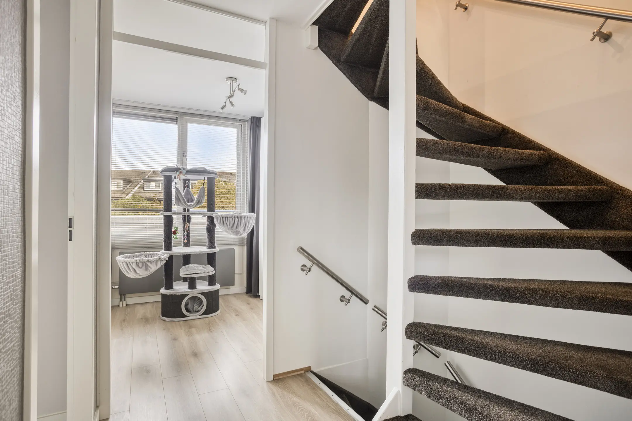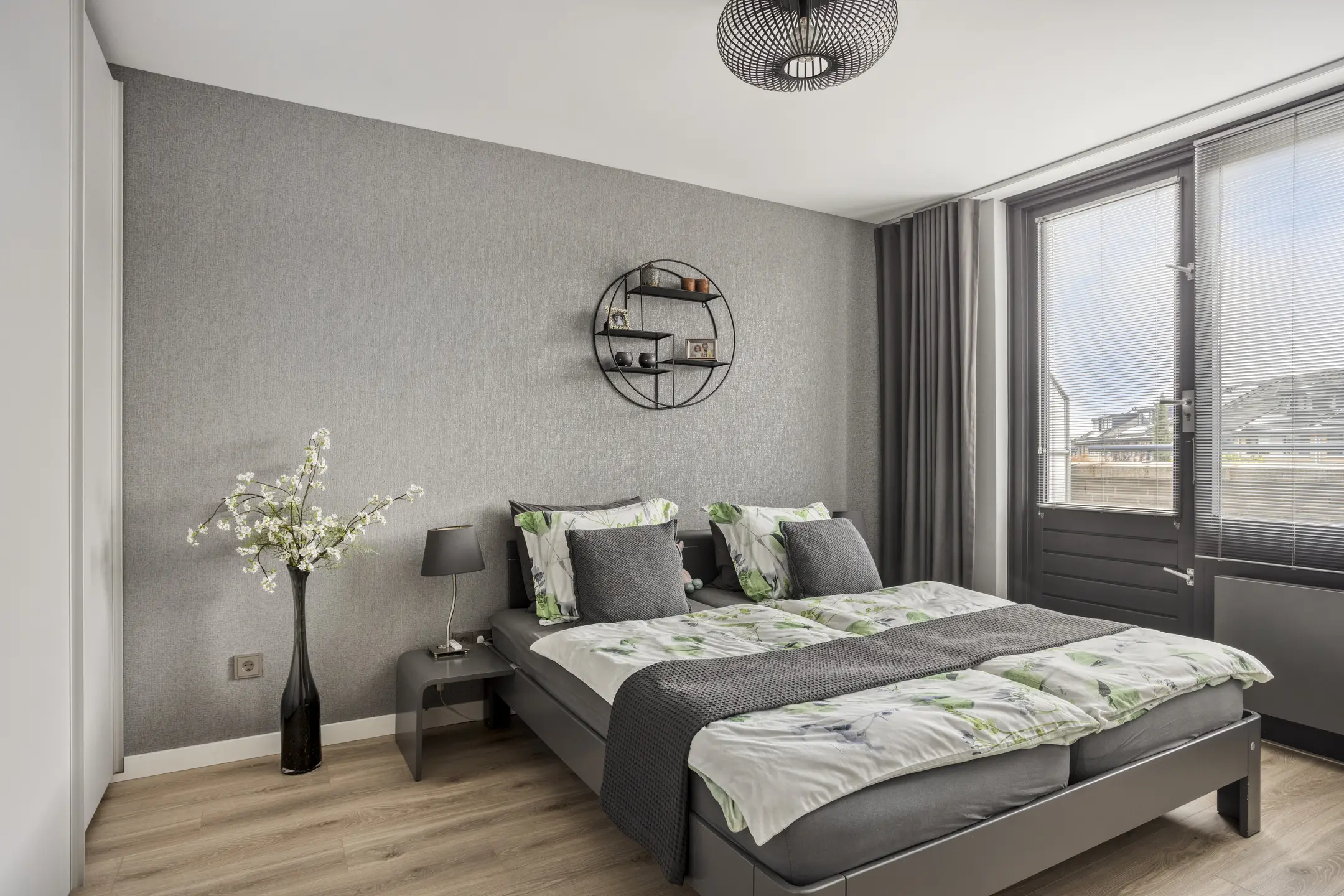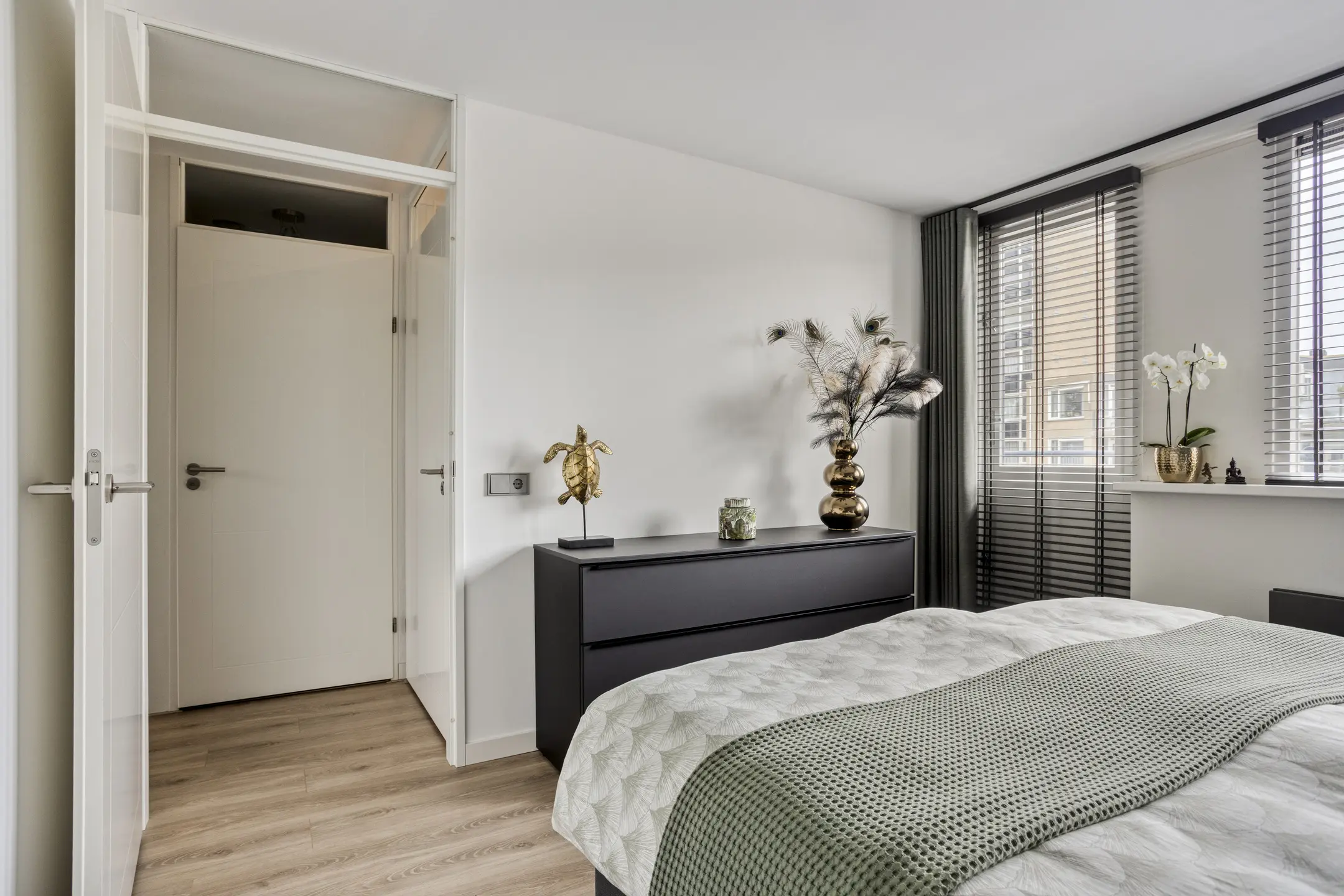 Overloop met toegang tot de vertrekken, ruime hoofdslaapkamer aan de voorzijde van het huis met deur naar het balkon. Aan de achterzijde van de woning bevinden zich nog twee slaapkamers, beiden van een fijn formaat. De grootste van de twee heeft toegang tot een riant balkon over de gehele breedte van de woning. Op de overloop en in de slaapkamers ligt een drempelloos doorgelegde laminaatvloer en de wanden zijn voorzien van behang.
