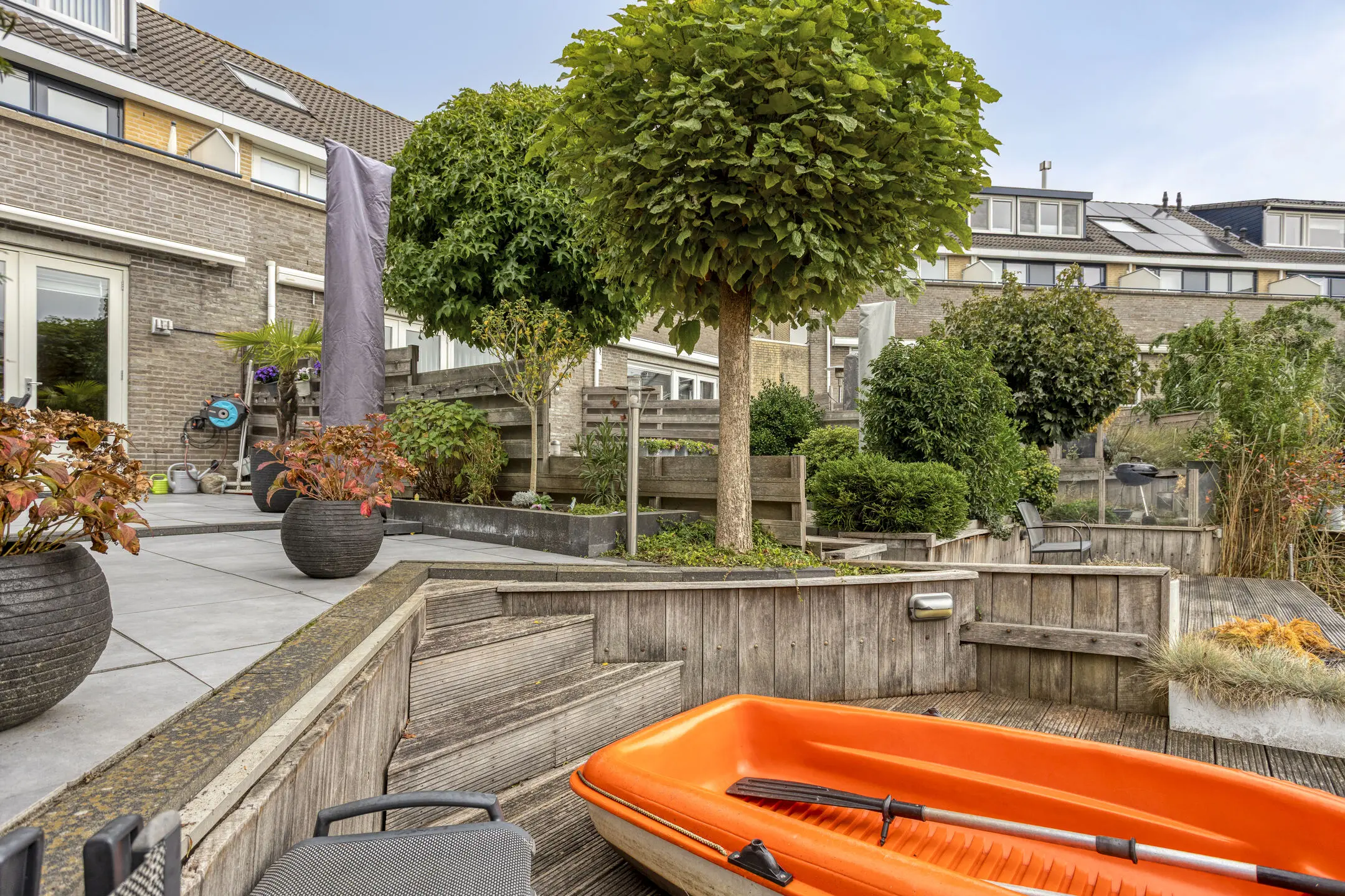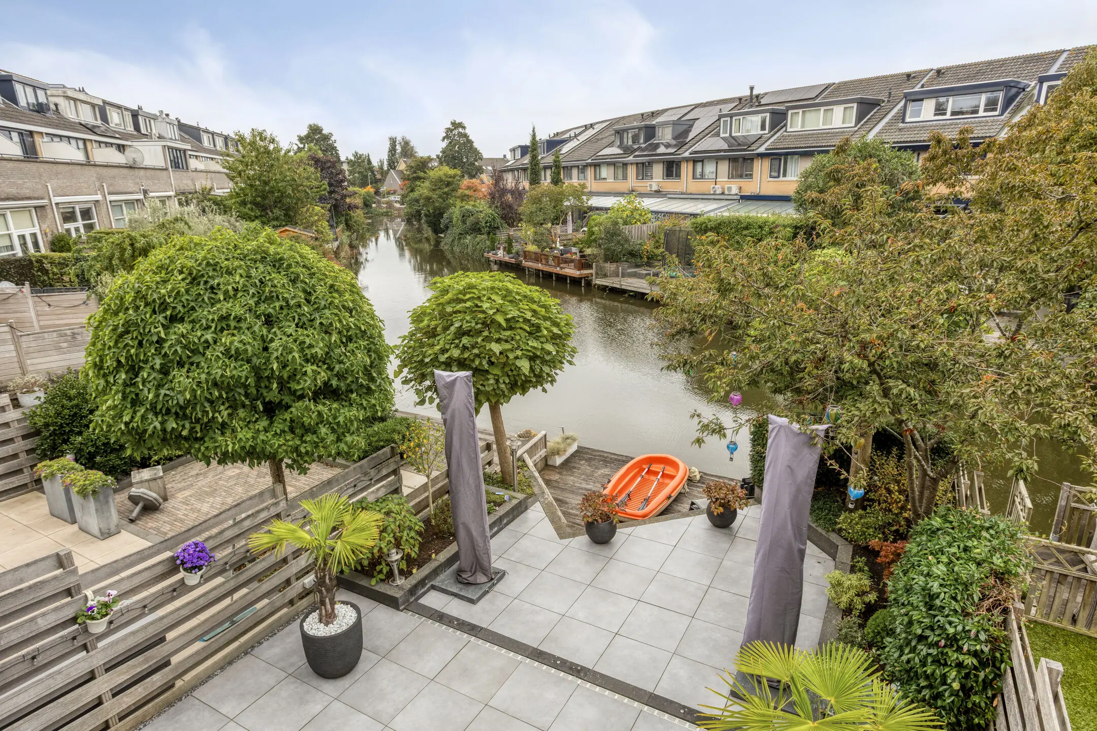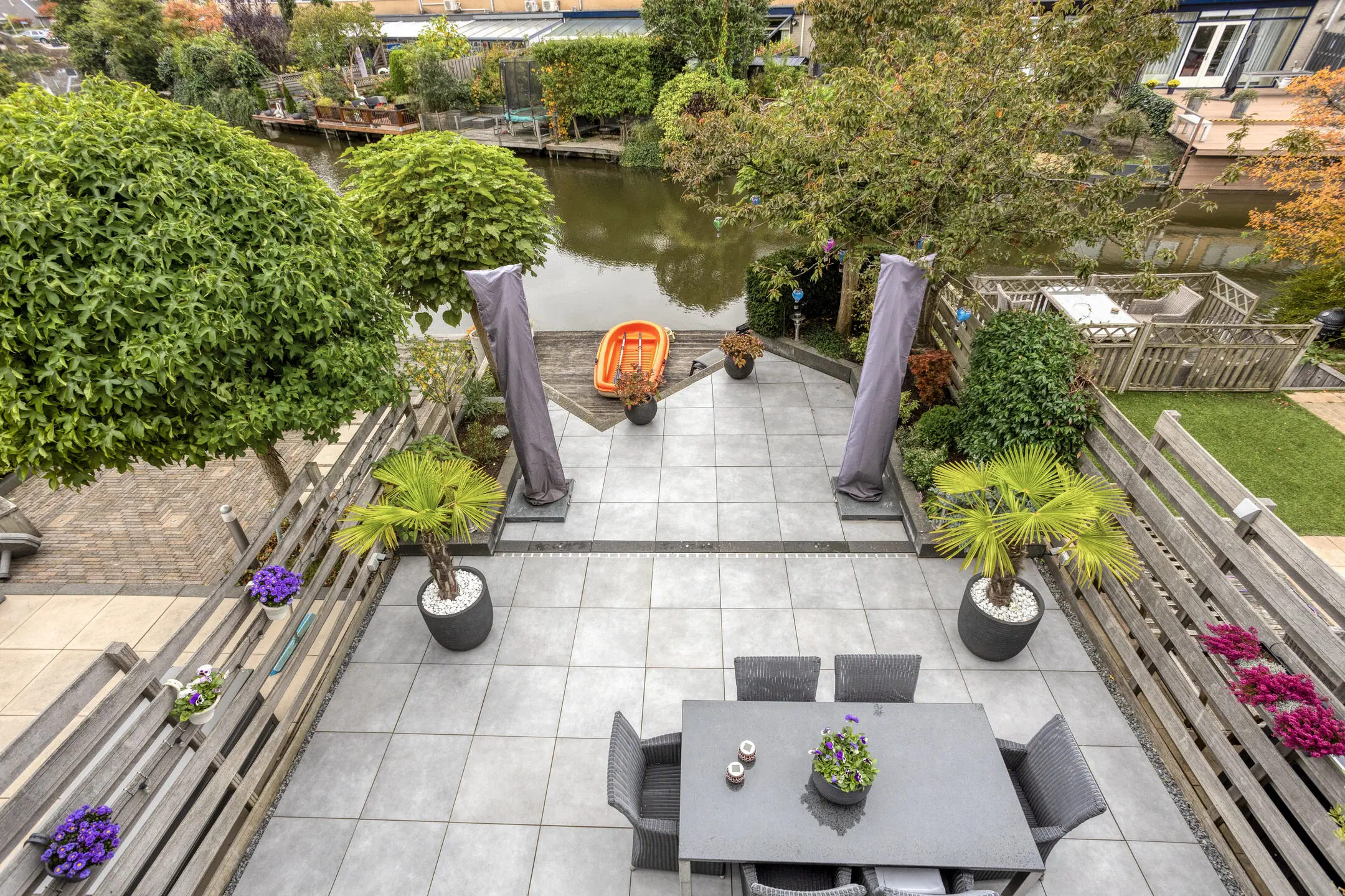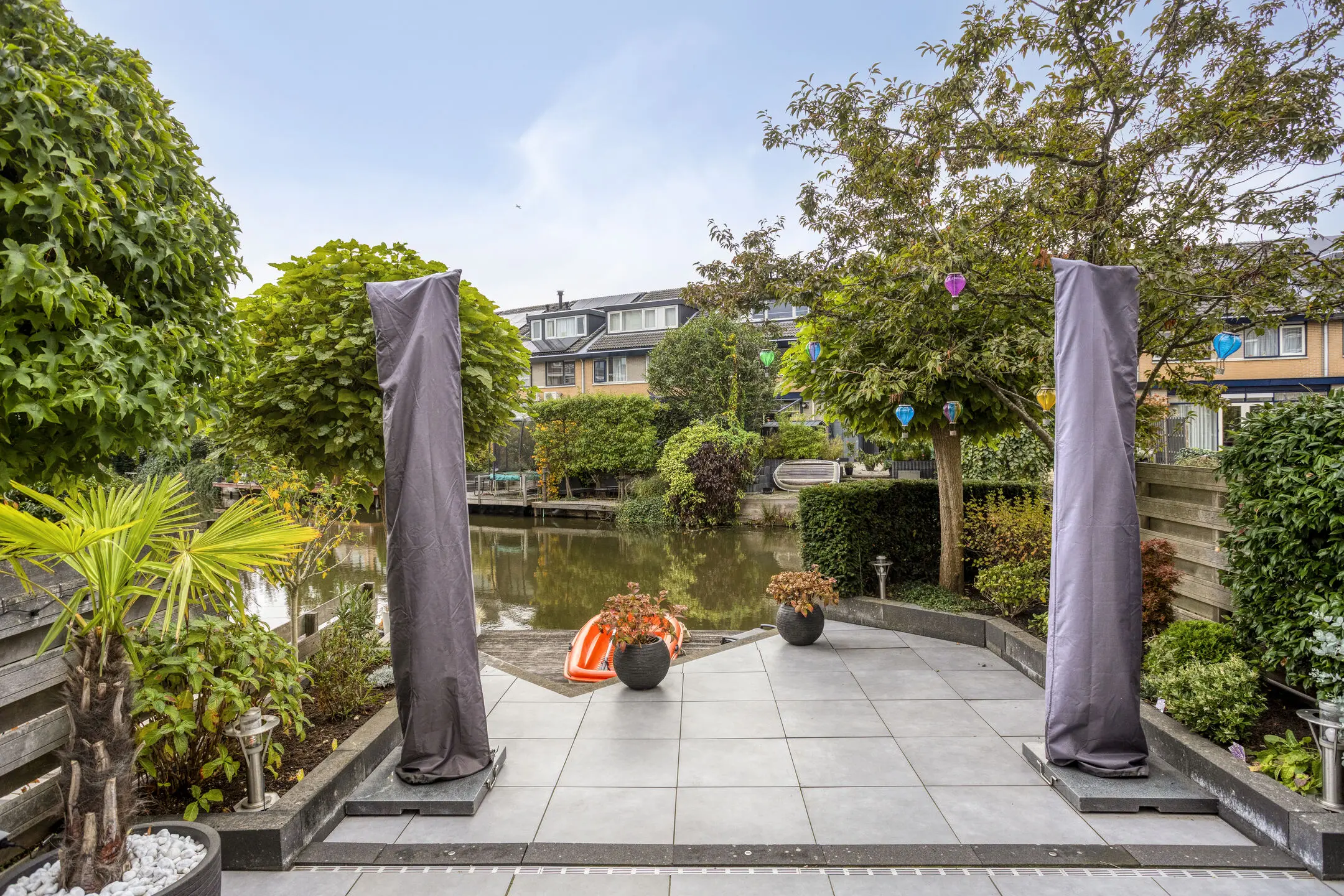 Gunstig op het zuidwesten gelegen zonnige achtertuin met veel privacy en fraaie ligging aan het water. De tuin is onderhoudsvriendelijk aangelegd met tuiinverlichting en een brede vlonder aan het water. Er is een buitenkraan aanwezig en het elektrisch bedienbare zonnescherm (met grijs/wit gestreept doek) houdt de zon uit de woonkamer.