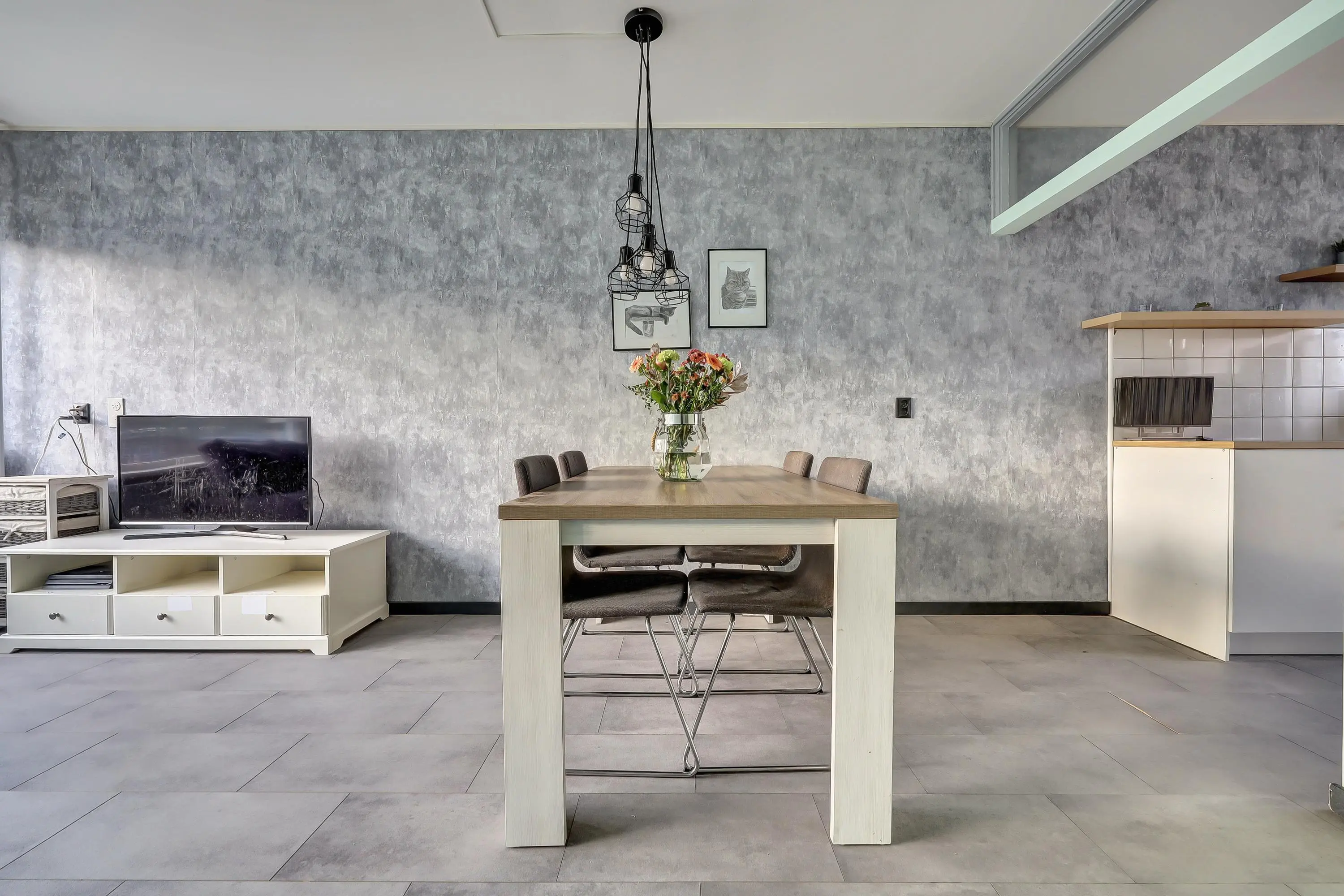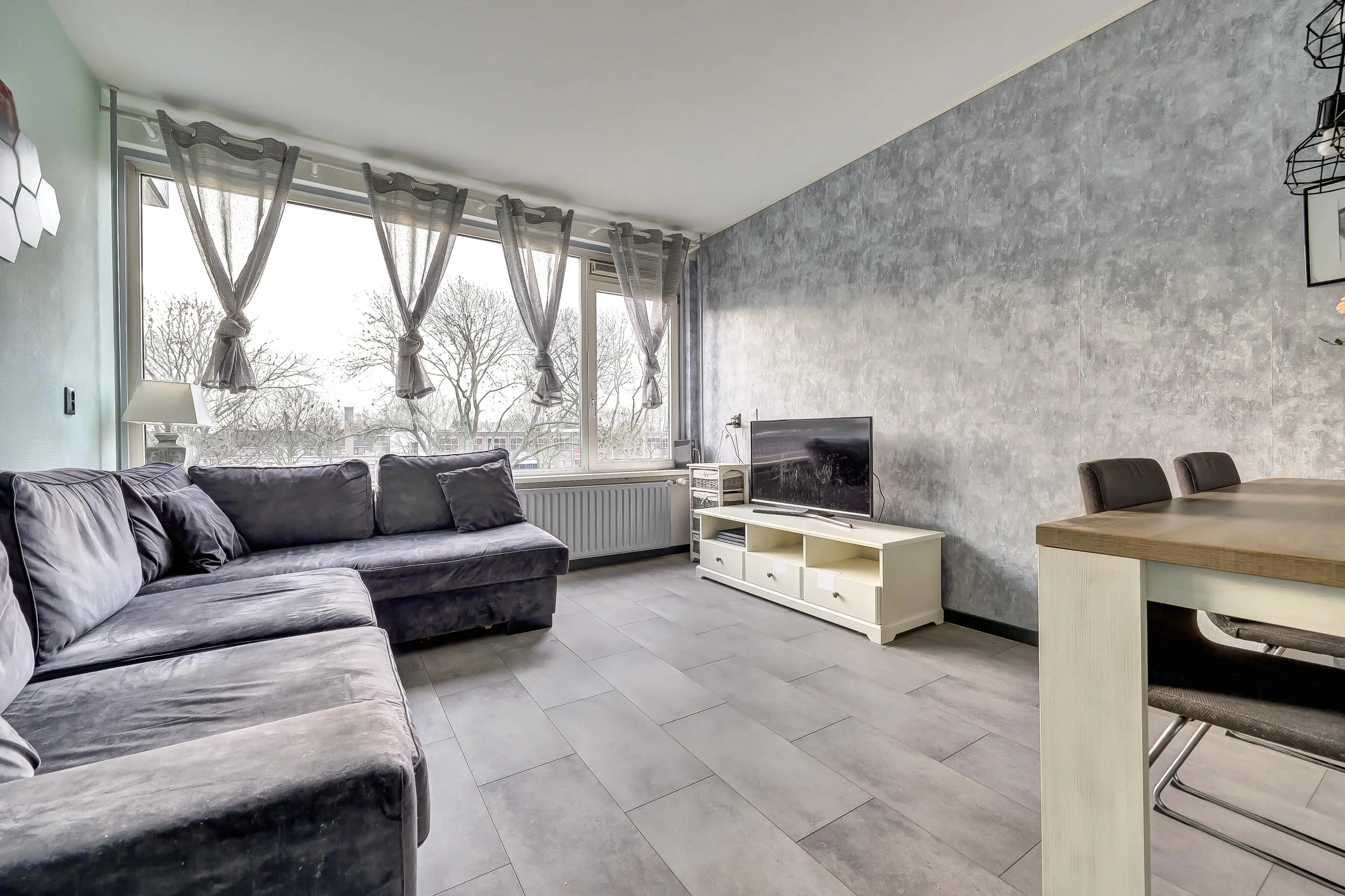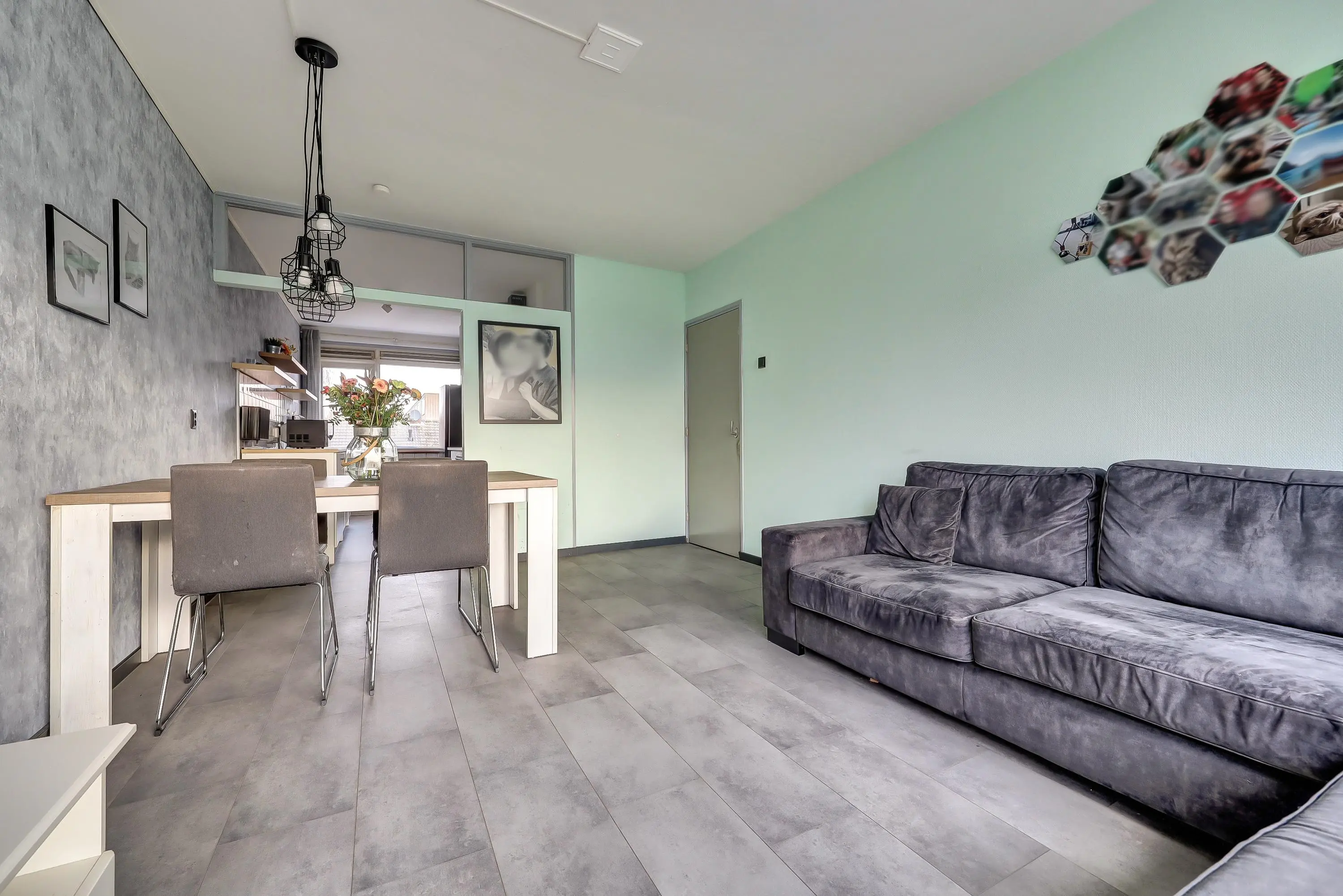 De doorzonwoonkamer is voorzien van een grote raampartij met zicht op de achtergelegen groenstrook.