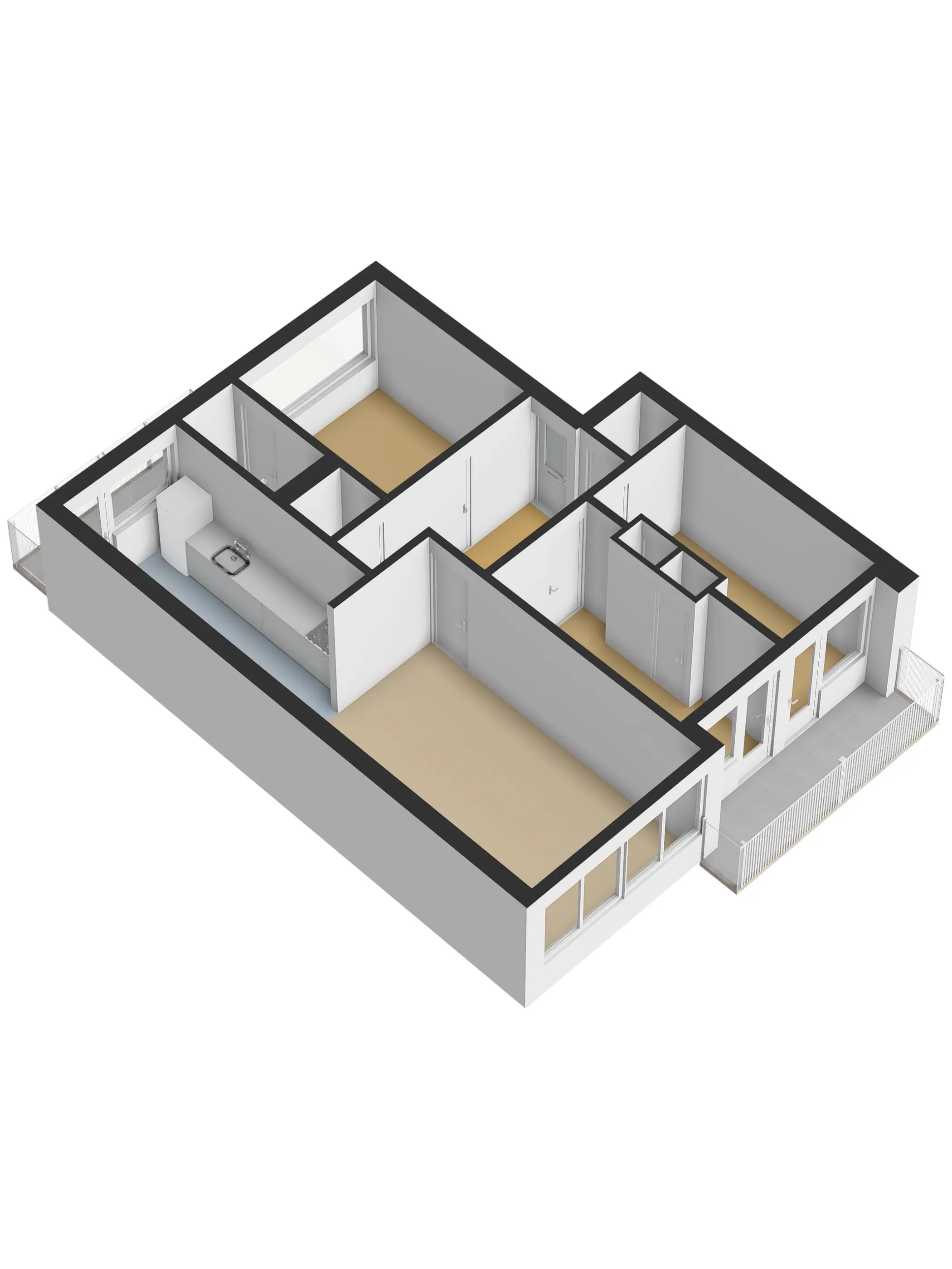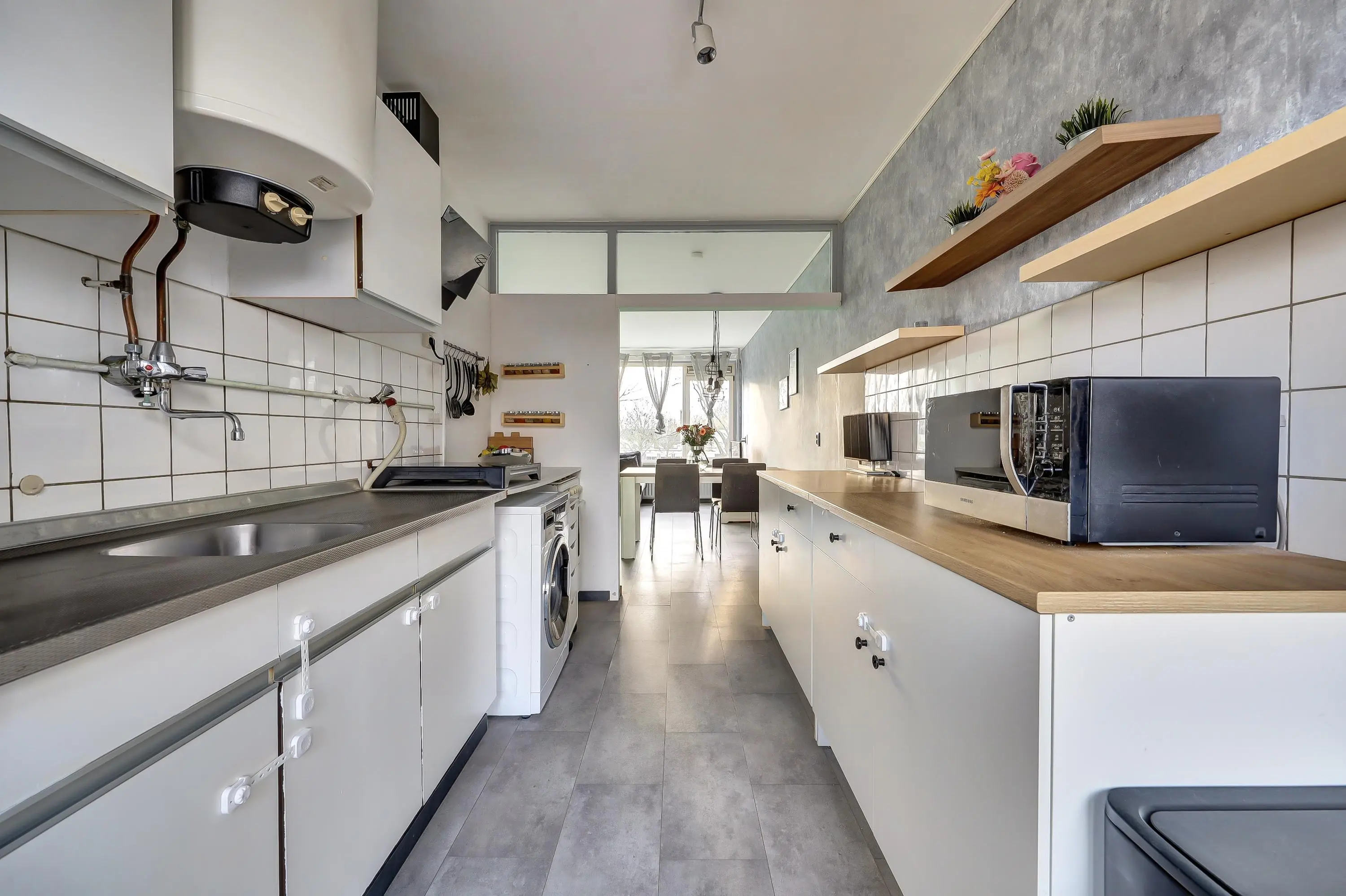 De open keuken aan de voorzijde is voorzien van een eenvoudig keukenblok en geeft toegang tot het tweede balkon aan de voorzijde.