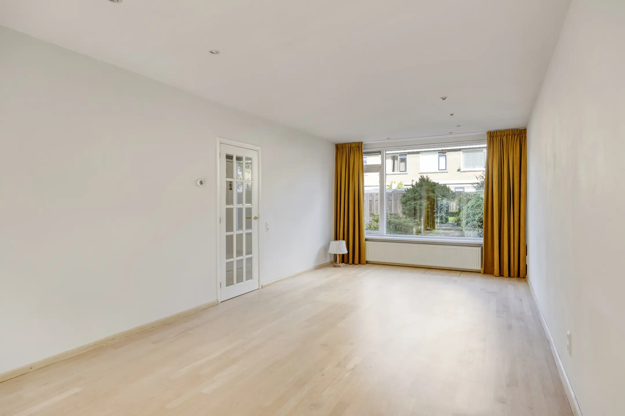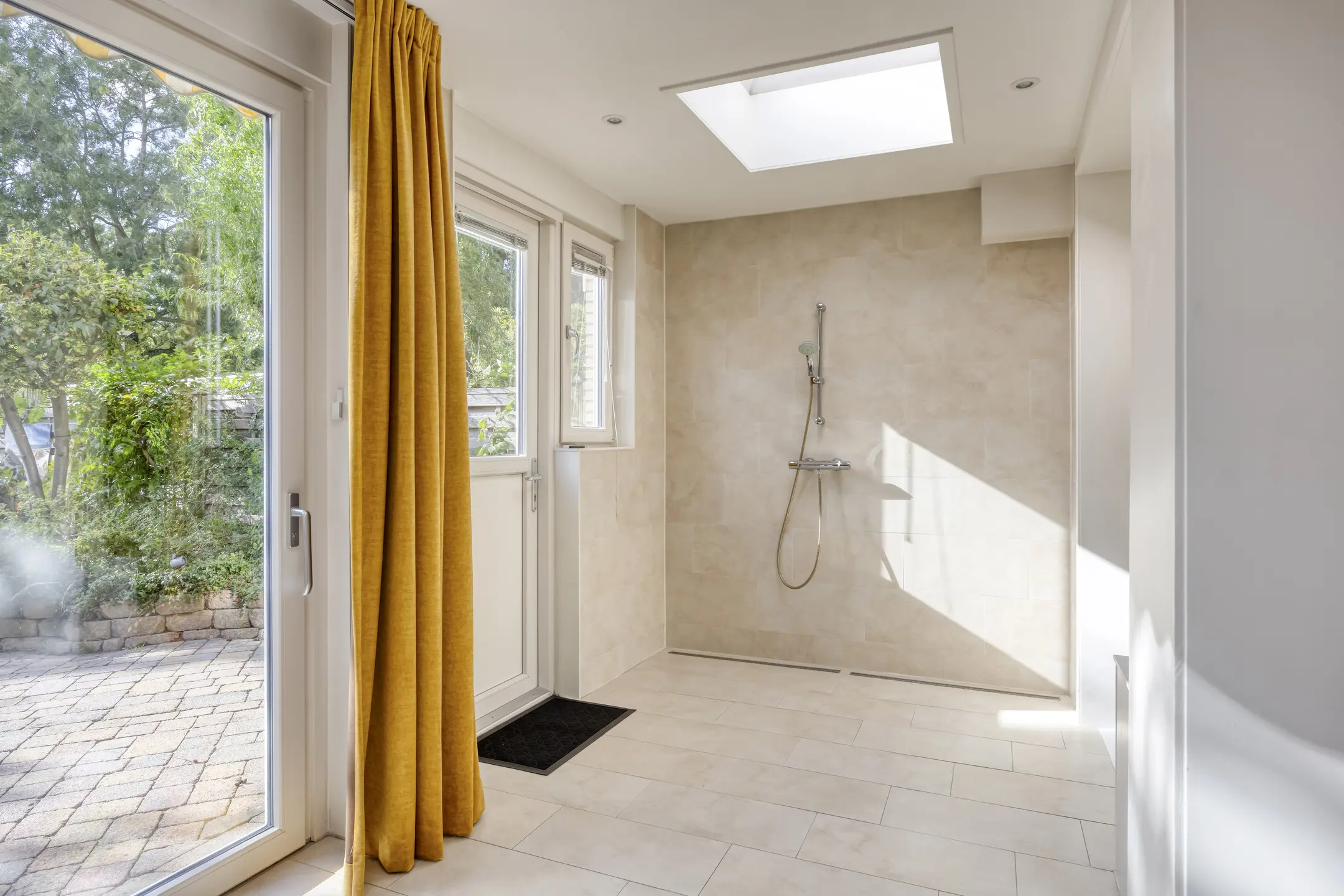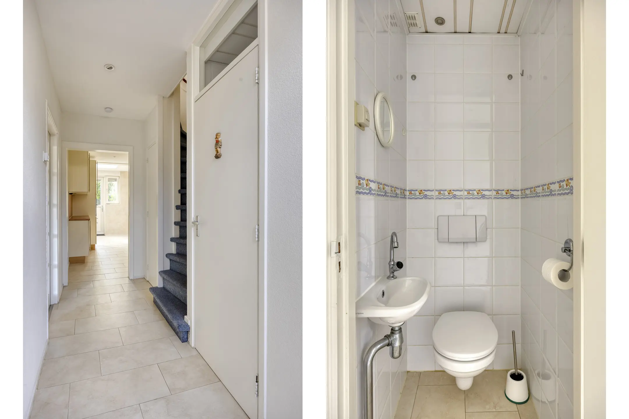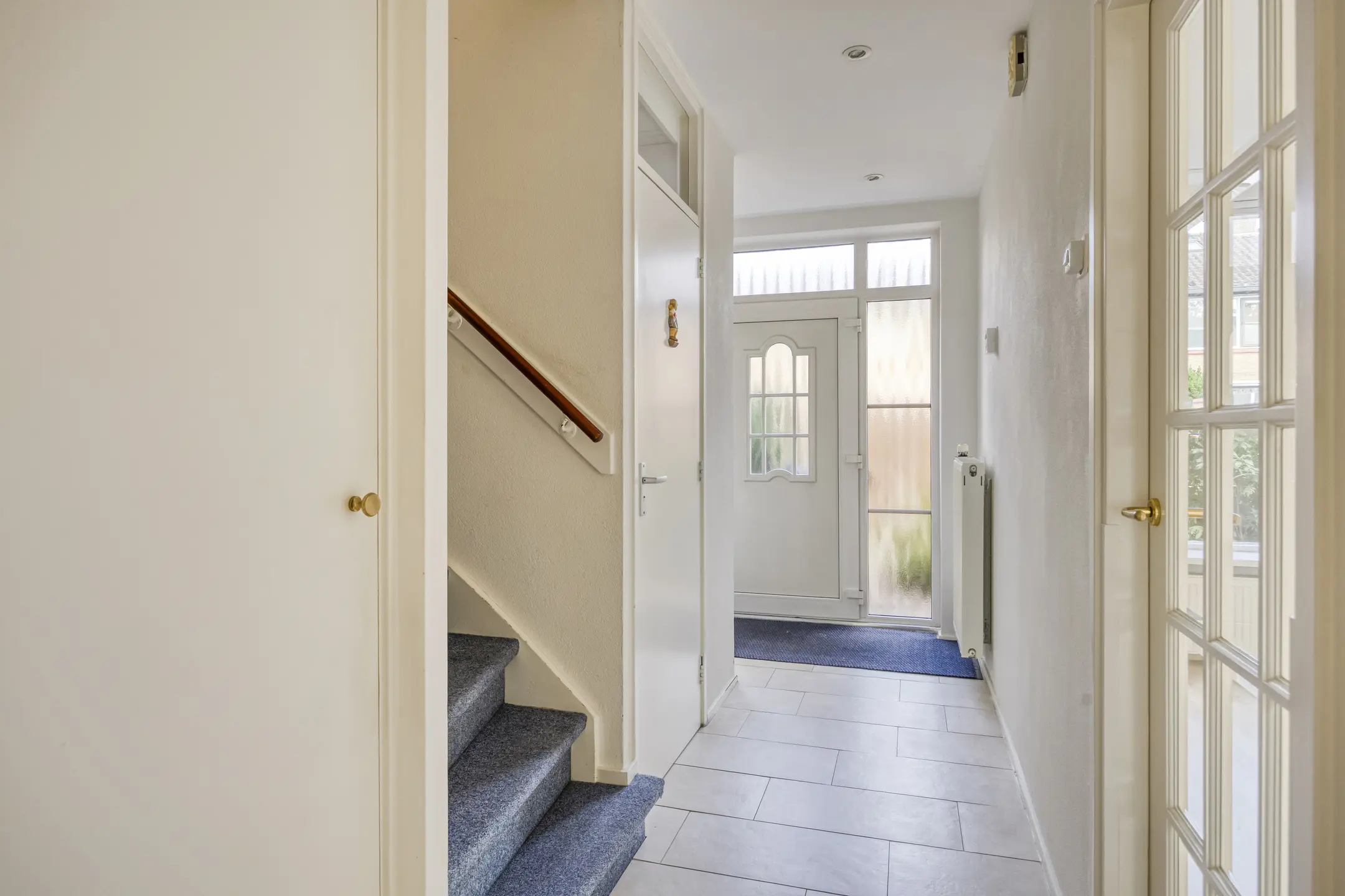 Entree, hal met meterkast, trapopgang, trapkast en geheel in lichte kleurstelling betegelde toiletruimte met wandcloset en fonteintje. Via een deur met facet geslepen ruitjes is de riante doorzonwoonkamer met parketvloer bereikbaar. De woning is aan de achterzijde uitgebouwd en in het dak van de uitbouw zijn twee lichtkoepels geplaatst waarvan er één elektrisch kan worden geopend. In de aanbouw liggen vloertegels met daaronder vloerverwarming en er is een douche geplaatst zodat de woning ook geschikt is voor minder validen. Een schuifpui en een deur (beiden met een hor) geven toegang tot de verzorgde achtertuin. De vanille kleurige keuken met beuken kleurig blad is in parallel opstelling geplaatst en is uitgerust met een inductiekookplaat met 4 zones, afzuigkap, combimagnetron (recent vernieuwd), Quooker kraan, vaatwasmachine en koel-/vriescombinatie.