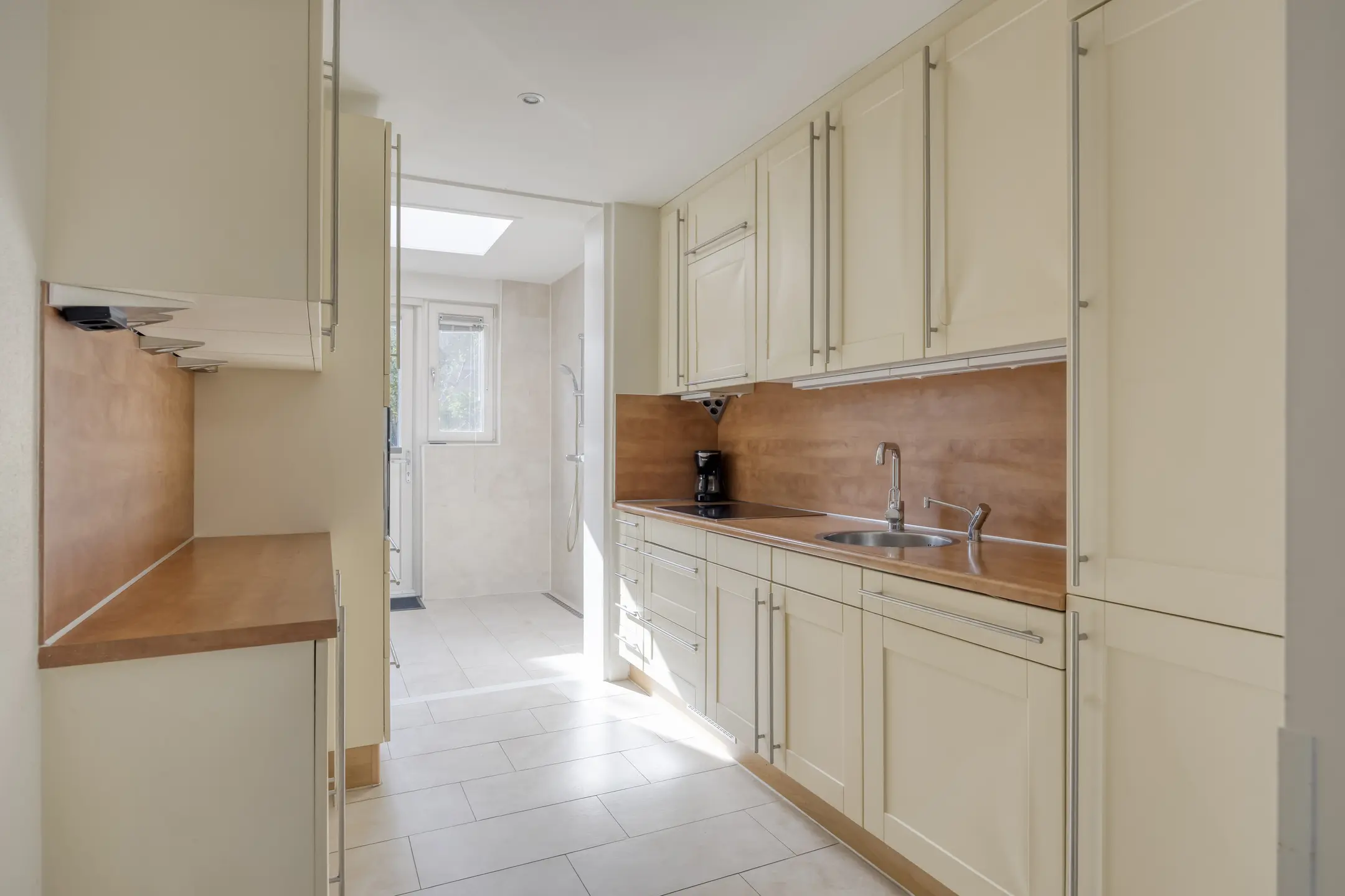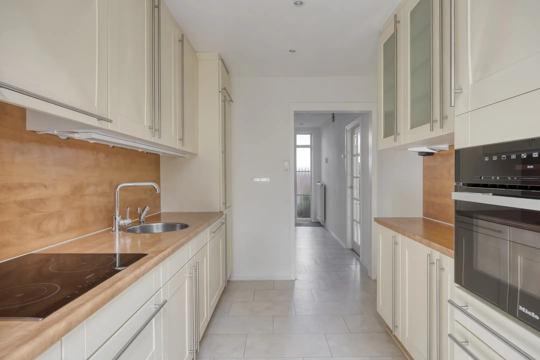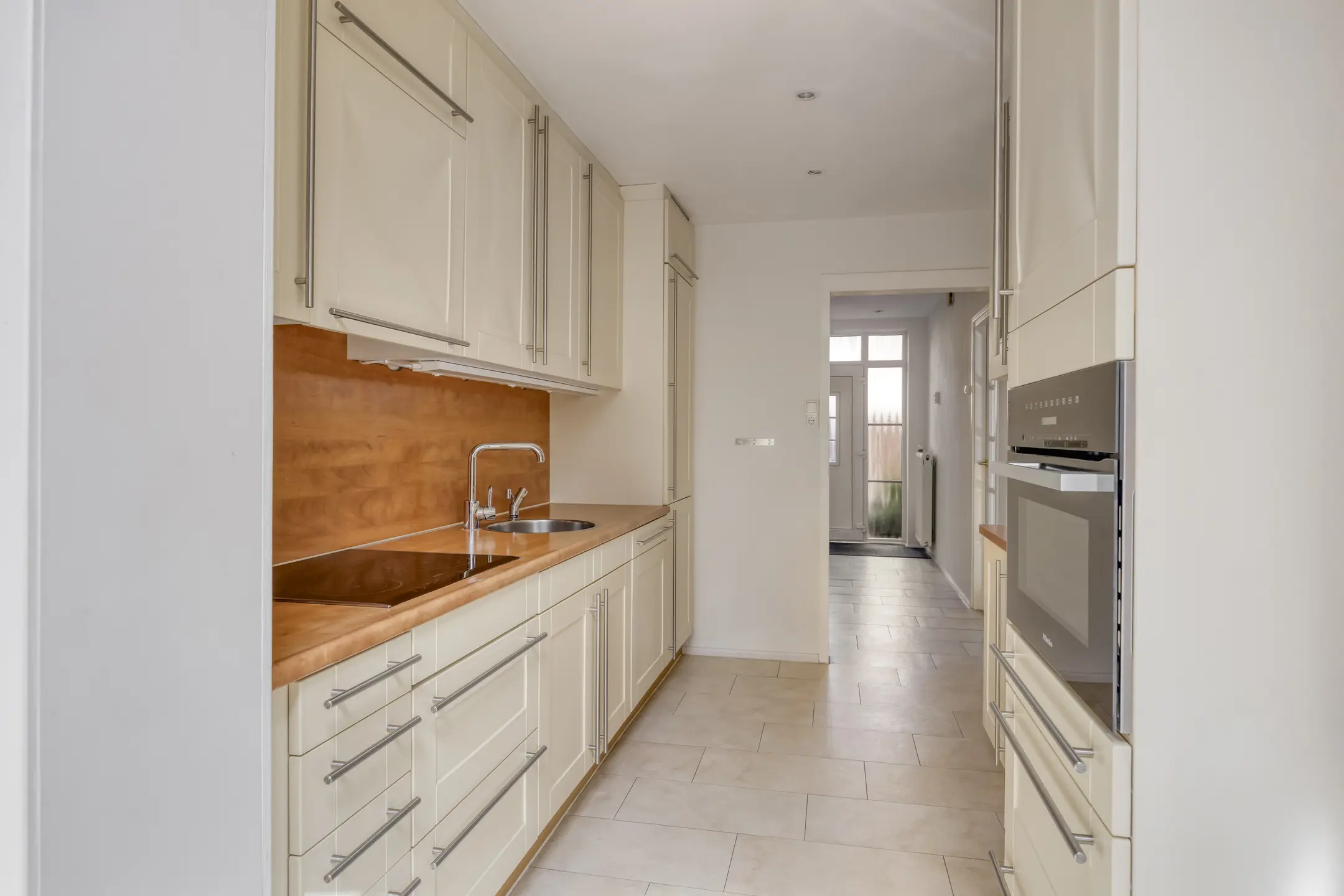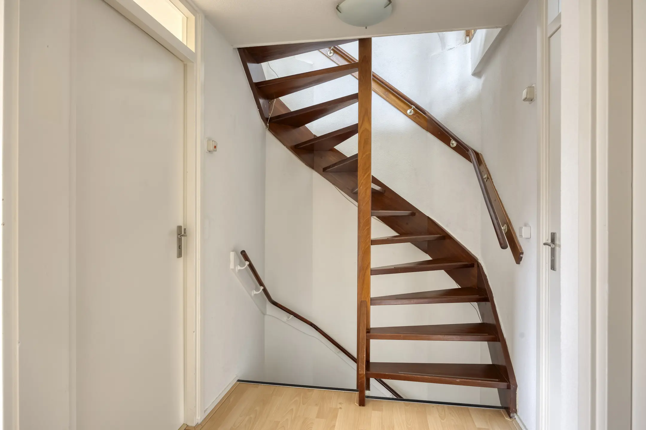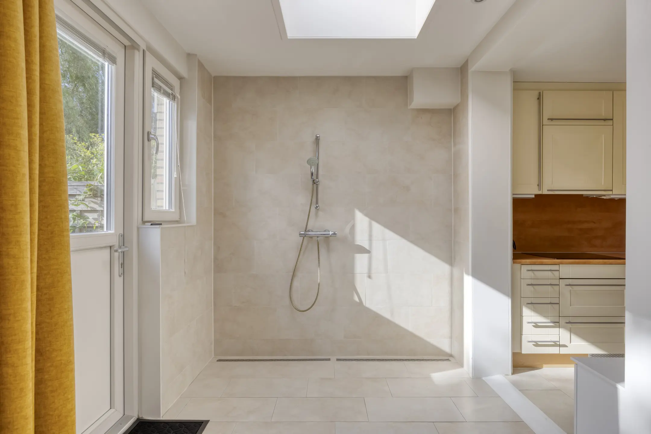 Entree, hal met meterkast, trapopgang, trapkast en geheel in lichte kleurstelling betegelde toiletruimte met wandcloset en fonteintje. Via een deur met facet geslepen ruitjes is de riante doorzonwoonkamer met parketvloer bereikbaar. De woning is aan de achterzijde uitgebouwd en in het dak van de uitbouw zijn twee lichtkoepels geplaatst waarvan er één elektrisch kan worden geopend. In de aanbouw liggen vloertegels met daaronder vloerverwarming en er is een douche geplaatst zodat de woning ook geschikt is voor minder validen. Een schuifpui en een deur (beiden met een hor) geven toegang tot de verzorgde achtertuin. De vanille kleurige keuken met beuken kleurig blad is in parallel opstelling geplaatst en is uitgerust met een inductiekookplaat met 4 zones, afzuigkap, combimagnetron (recent vernieuwd), Quooker kraan, vaatwasmachine en koel-/vriescombinatie.