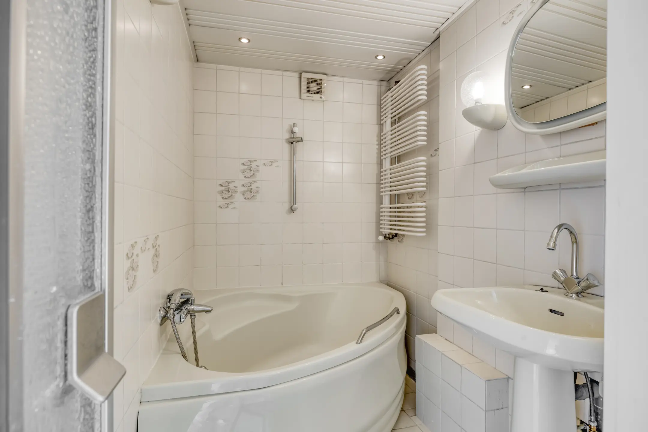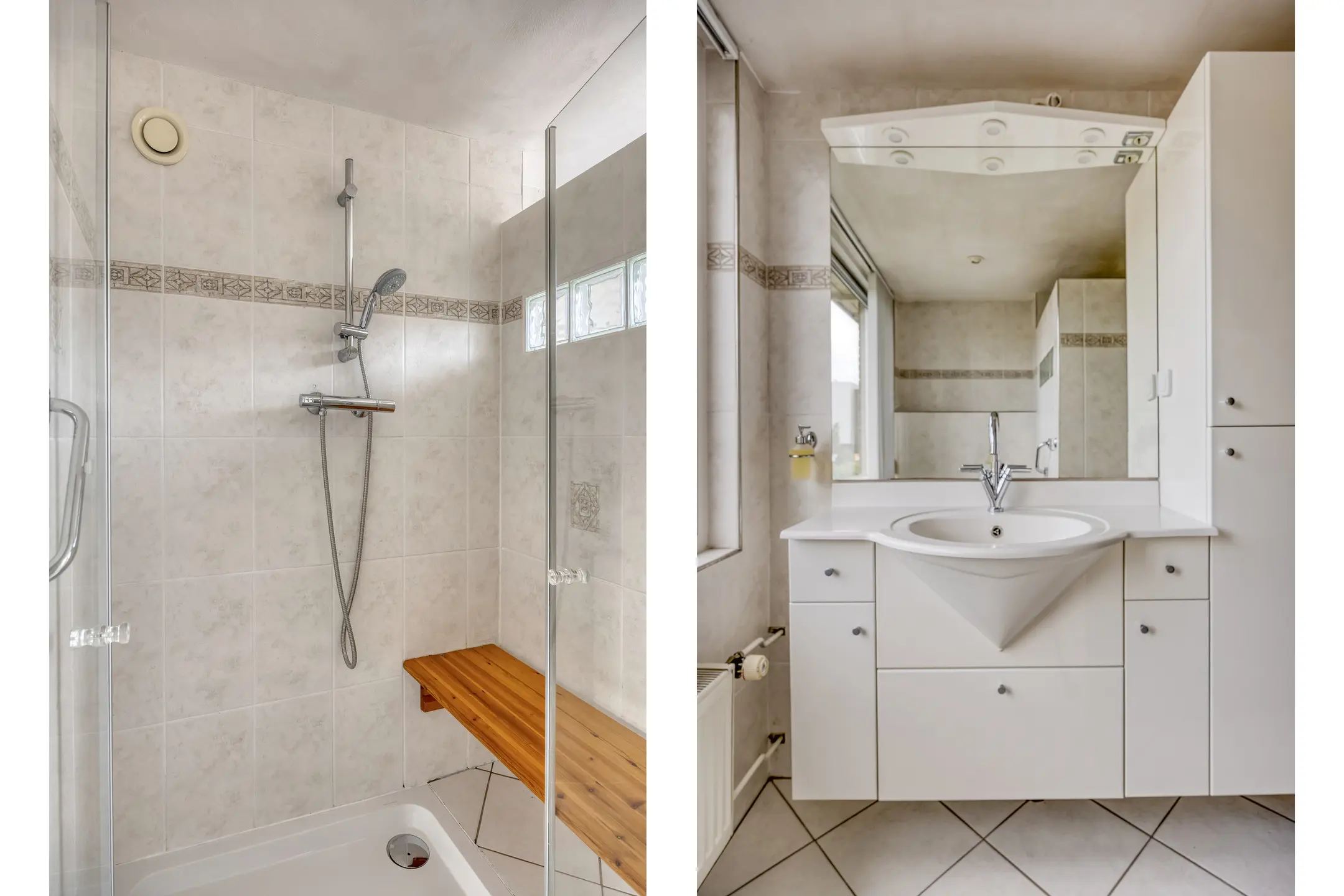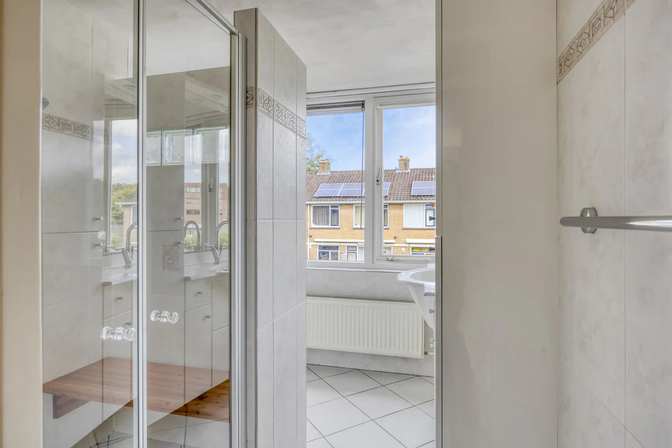 Overloop met toegang tot de vertrekken; ruime slaapkamer aan de voorzijde van de woning. Slaapkamer twee en drie liggen aan de achterzijde van het huis en hebben beiden een zonnescherm met elektrische bediening en de grootste van de twee heeft een airco unit. Op de overloop en in de slaapkamers ligt laminaat. Inpandige geheel betegelde badkamer met ligbad, design radiator en wastafel. Badkamer twee is gerealiseerd in een kamer aan de voorzijde, deze is eveneens geheel betegeld en uitgerust met een douche, wandcloset en wastafelmeubel. Er is een raam aanwezig zodat er op een natuurlijke manier geventileerd kan worden.
