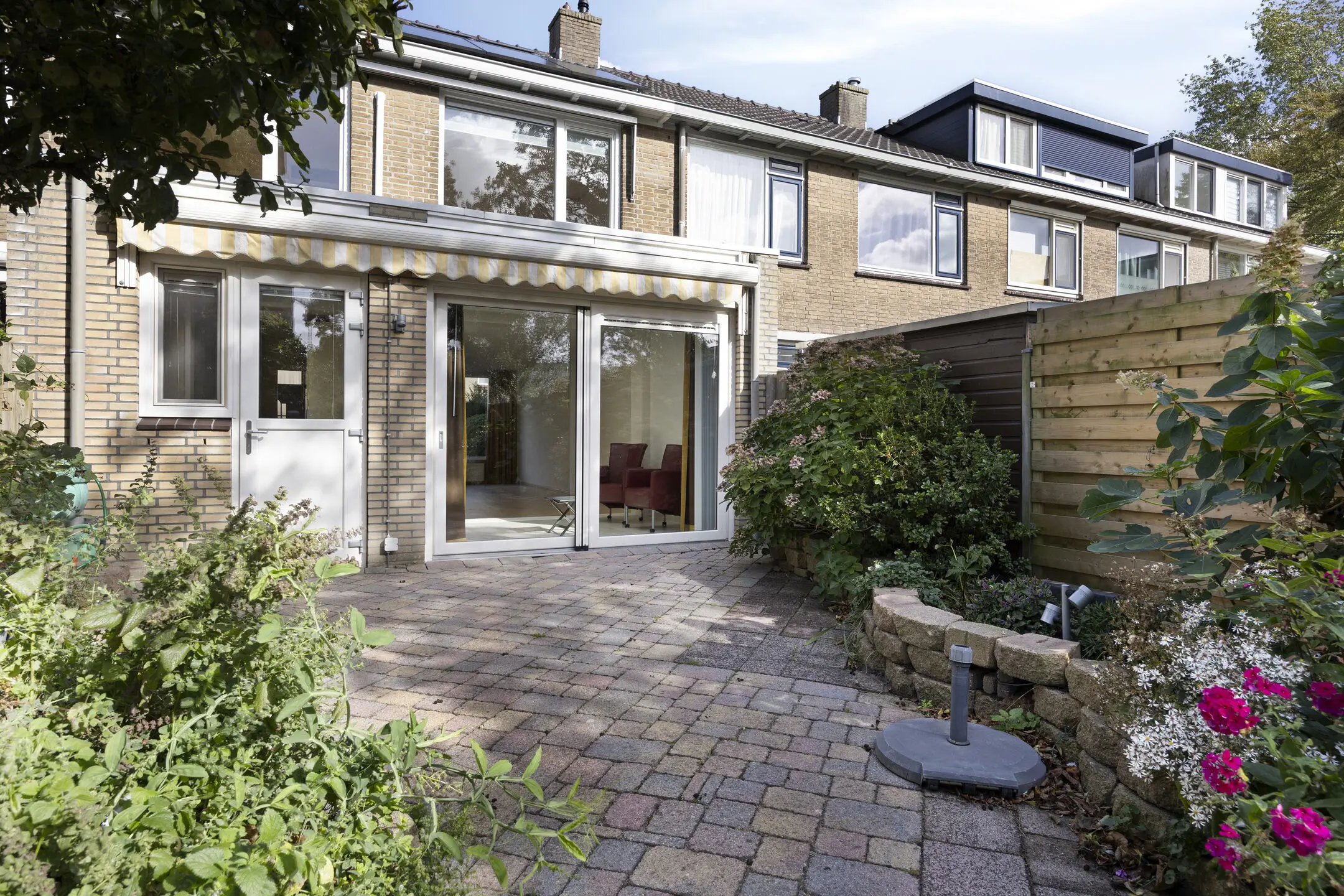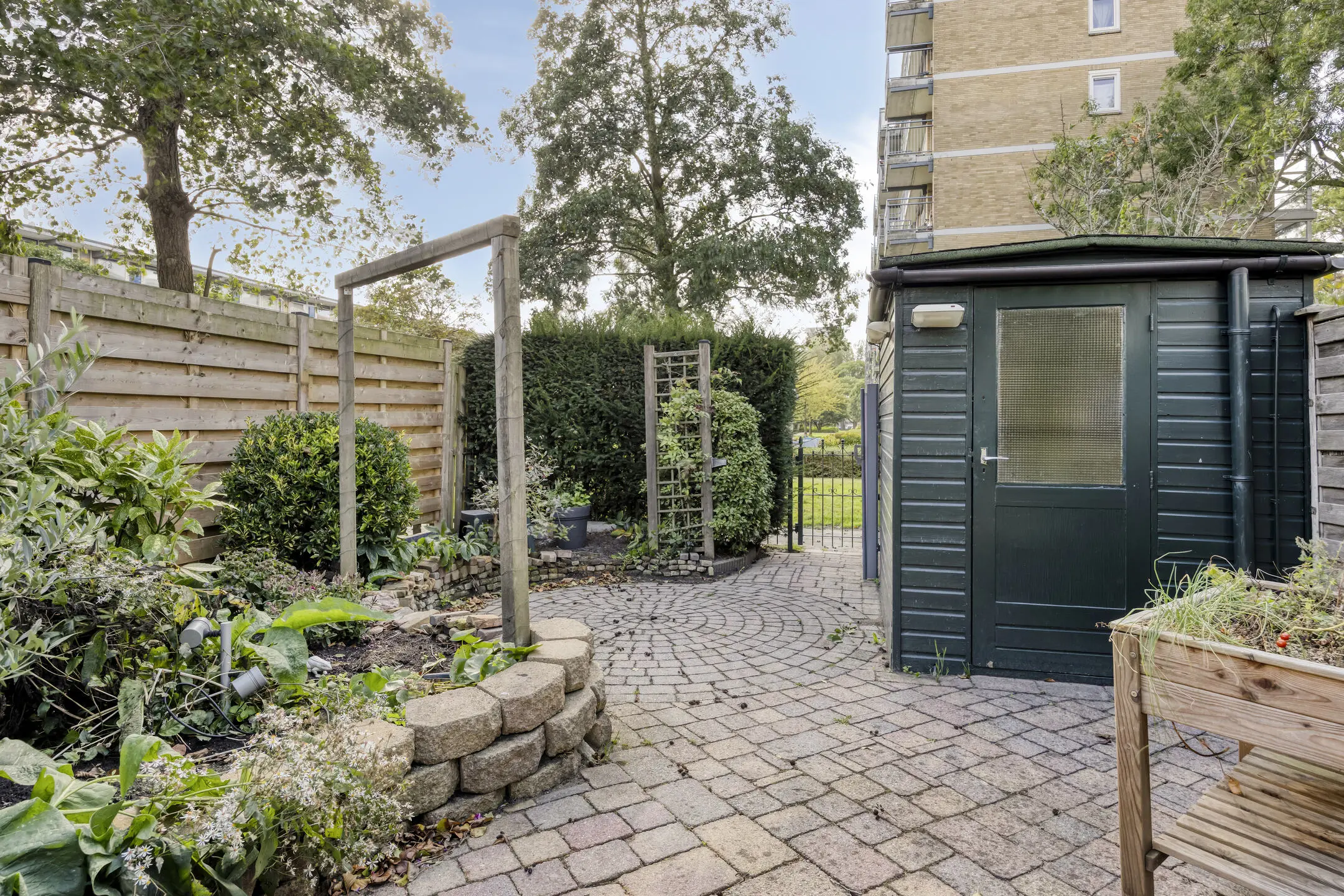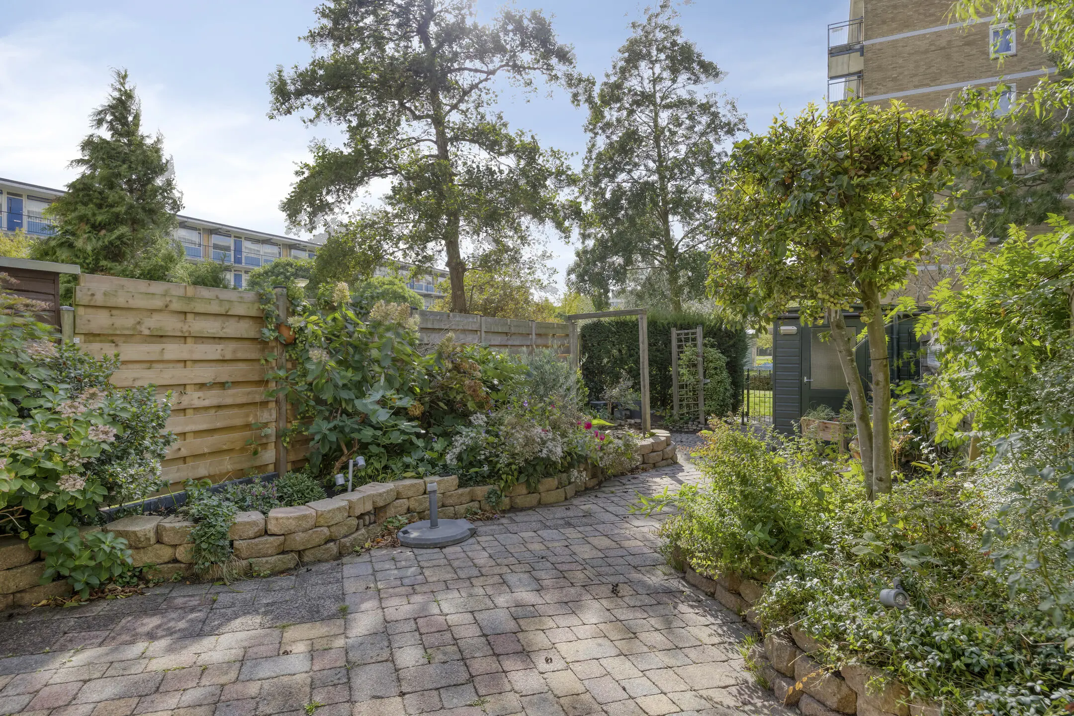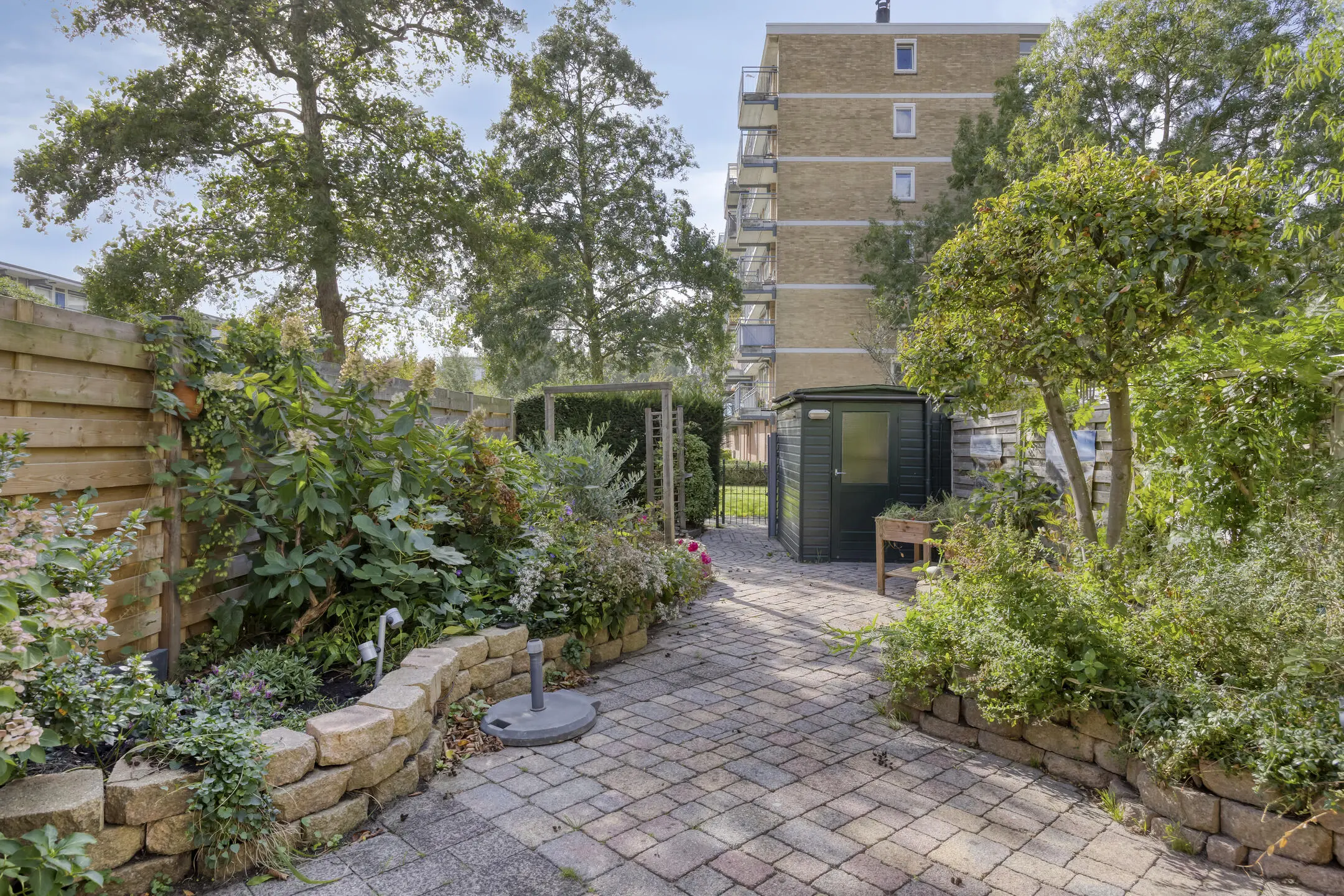 Verzorgde op het zuidwesten gelegen achtertuin met een achterom, een buitenkraan, verlichting en een houten berging met elektra. De tuin is fraai aangelegd met vaste beplanting en het gestreepte zonnescherm met elektrische bediening houdt de zon uit de woonkamer. De op het noordoosten gelegen voortuin is eveneens voorzien van vaste beplanting en grenst aan een kindvriendelijk autovrij voetpad.