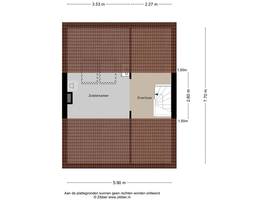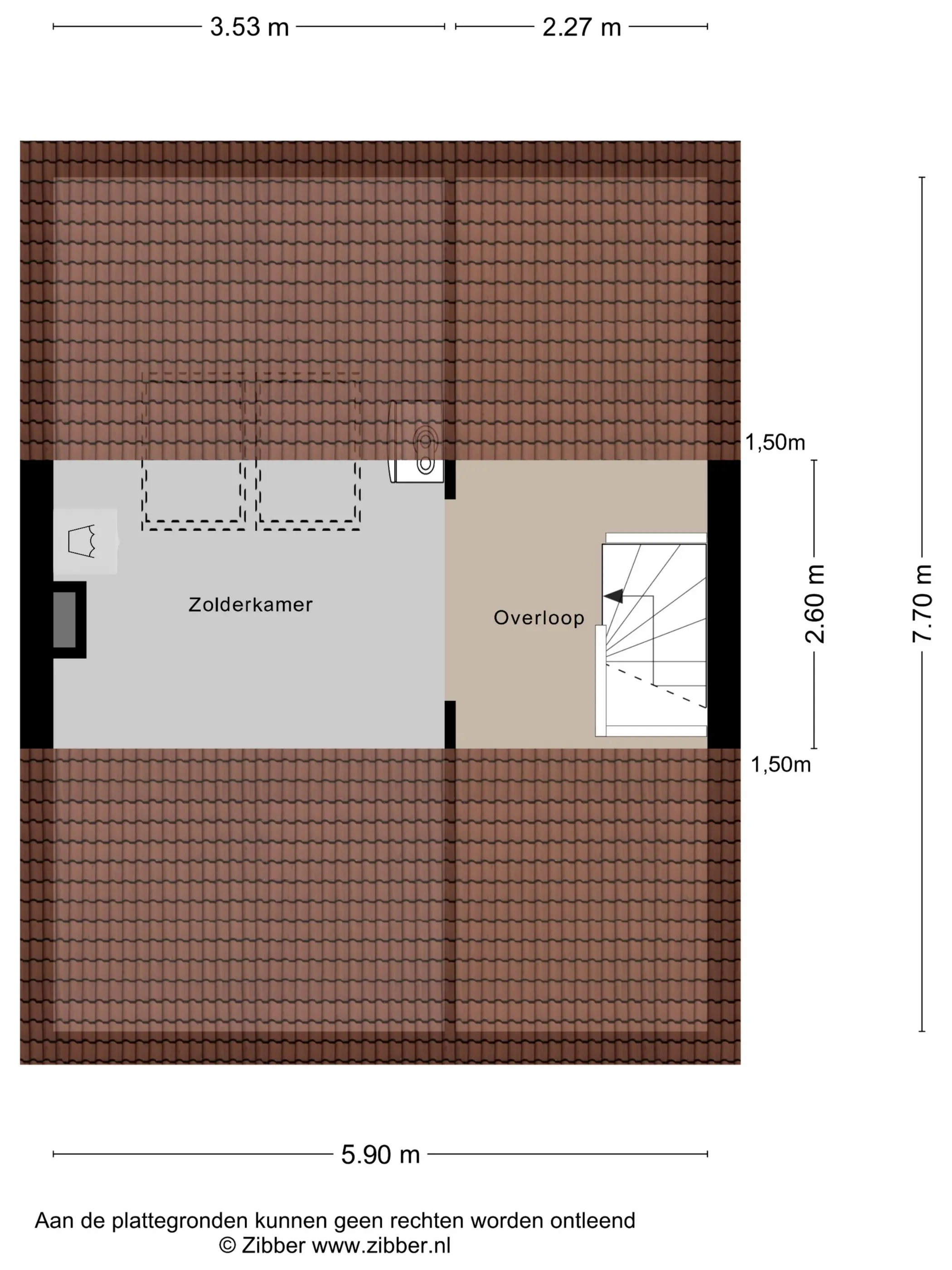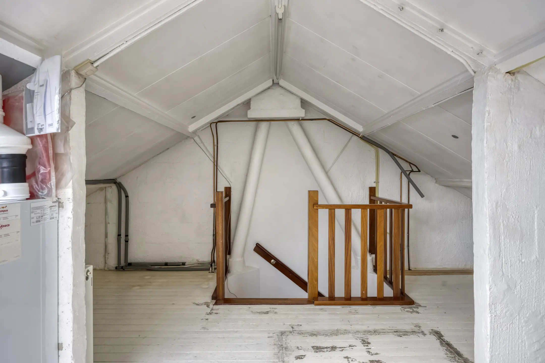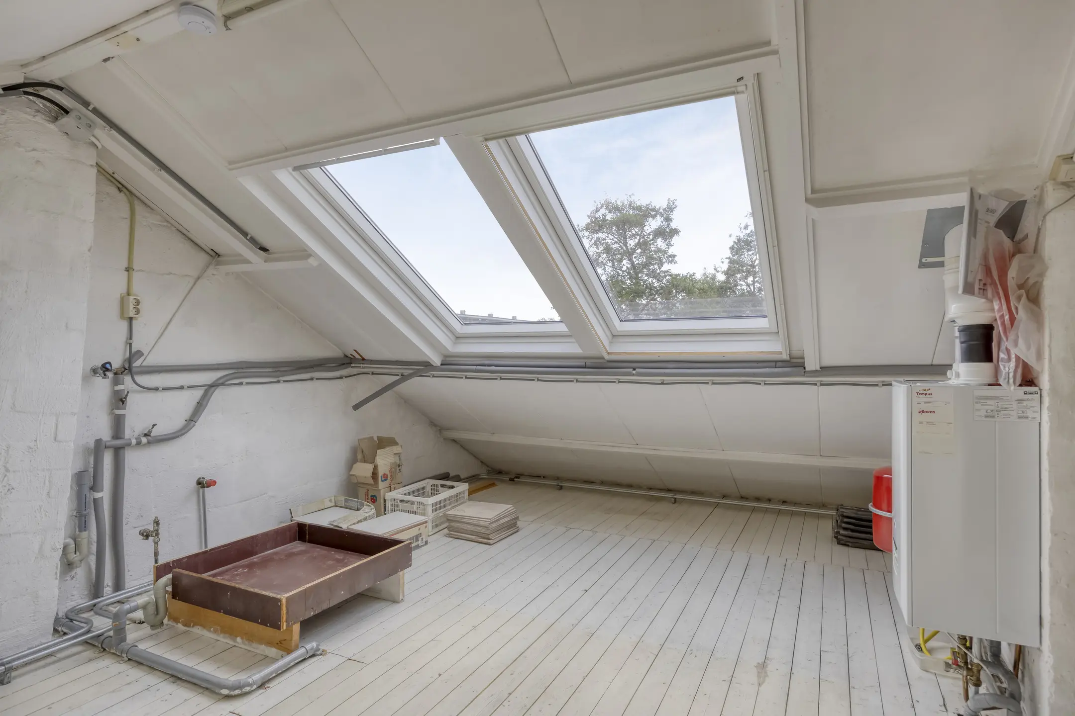Middels vaste trap bereikbare open zolderruimte met twee grote dakramen aan de achterzijde, de aansluiting voor de wasmachine en de C.V.-combiketel. Het is mogelijk om op deze verdieping één of desgewenst twee slaapkamers te realiseren.