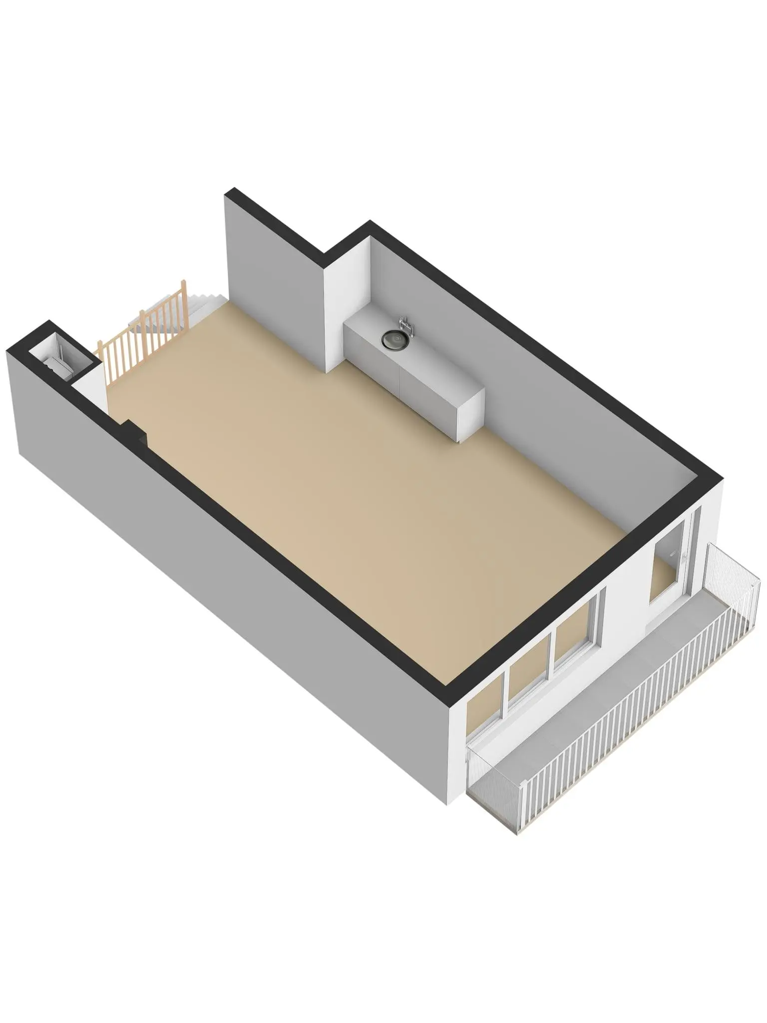 Verdieping: open ruimte met pantry, ramen aan achterzijde, toegang tot plat dak (niet beloopbaar)