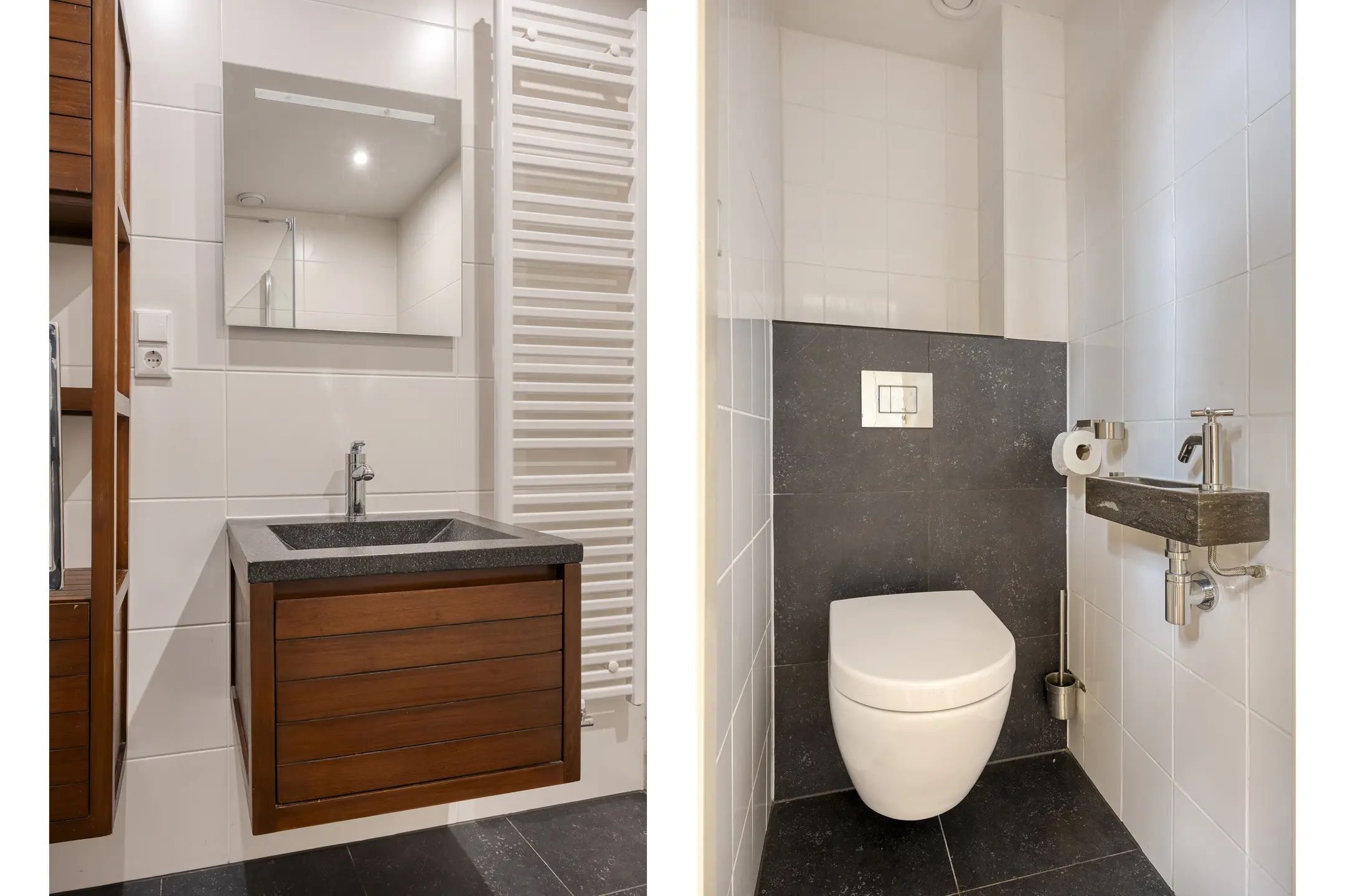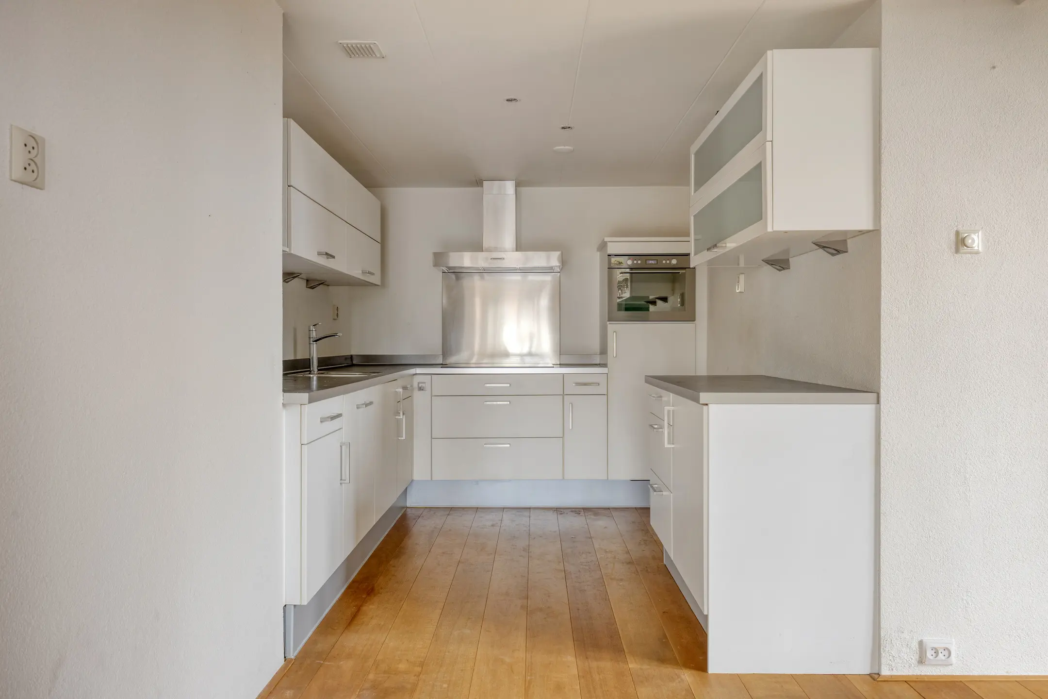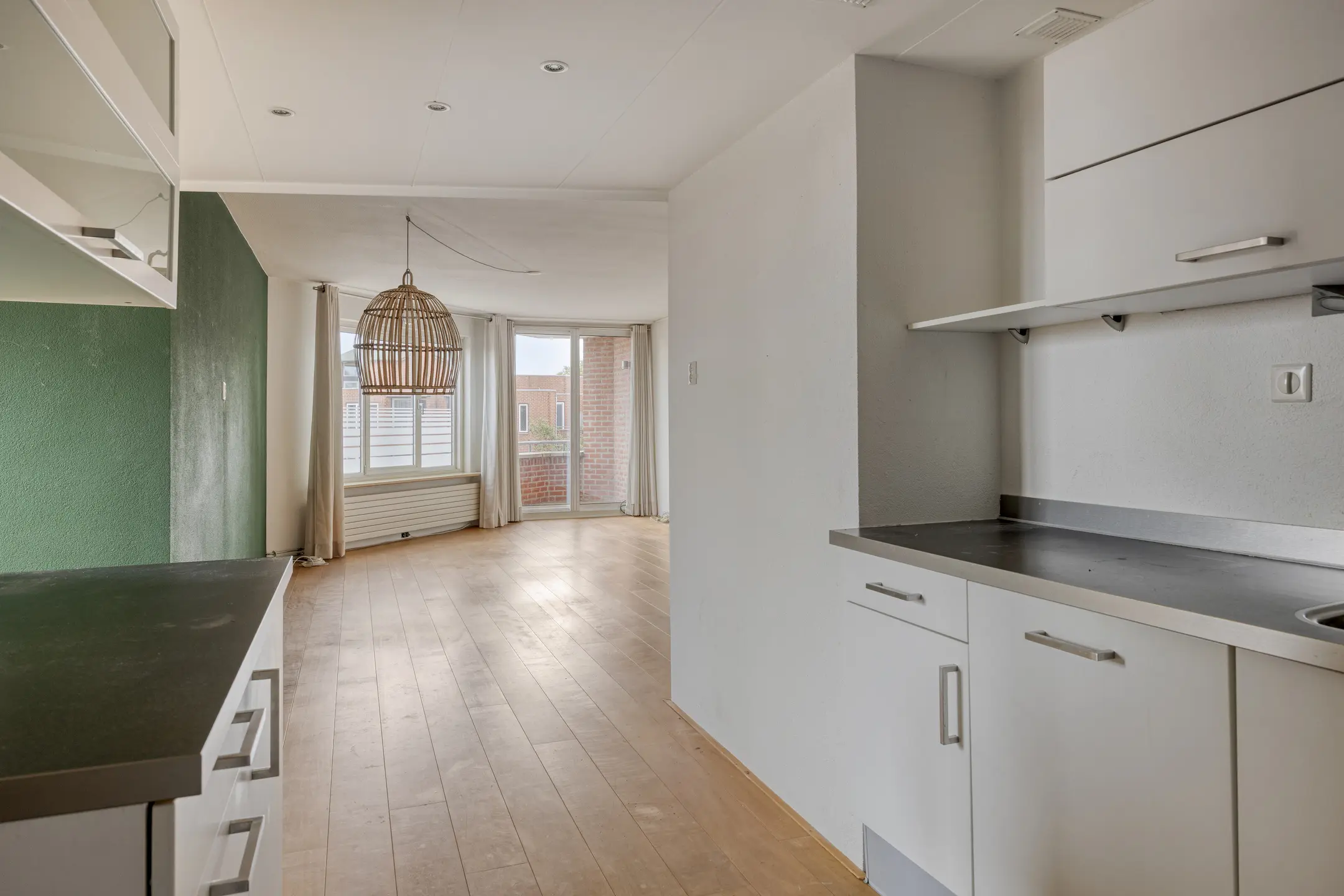 Entree, hal met videofoon en meterkast. Vaste kast met de C.V.-combi-ketel en warmte-terugwininstallatie. Deur met glas inzet maar de ruime en lichte woonkamer speelse indeling en schuifpui naar het aan de woonkamer grenzende balkon. De witte keuken met donker aanrechtblad is geplaatst in L-opstelling en is uitgerust met een keramische kookplaat, RVS afzuigkap (recirculatie), vriezer, vaatwasmachine, combi-oven en koelkast met vriesvak. Het plafond in de keuken is verlaagd en voorzien van inbouwspots. De slaapkamers zijn beiden kamers van een fijn formaat en ze hebben tevens allebei een deur naar het ruime terras en openslaande ramen. In de woonkamer, keuken, hal en de kleinere slaapkamer ligt een fraaie houten vloer, welke drempelloos is doorgelegd. In de grootste slaapkamer ligt een laminaatvloer. De geheel in wit/grijze kleurstelling betegelde badkamer is uitgerust met een douche met regen- en handdouche, wastafelmeubel, spiegel met verlichting, design radiator. In de badkamer zijn ook de aansluitingen aanwezig voor de wasmachine en droger. In dezelfde kleurstelling betegelde toiletruimte met een wandcloset en fonteintje.