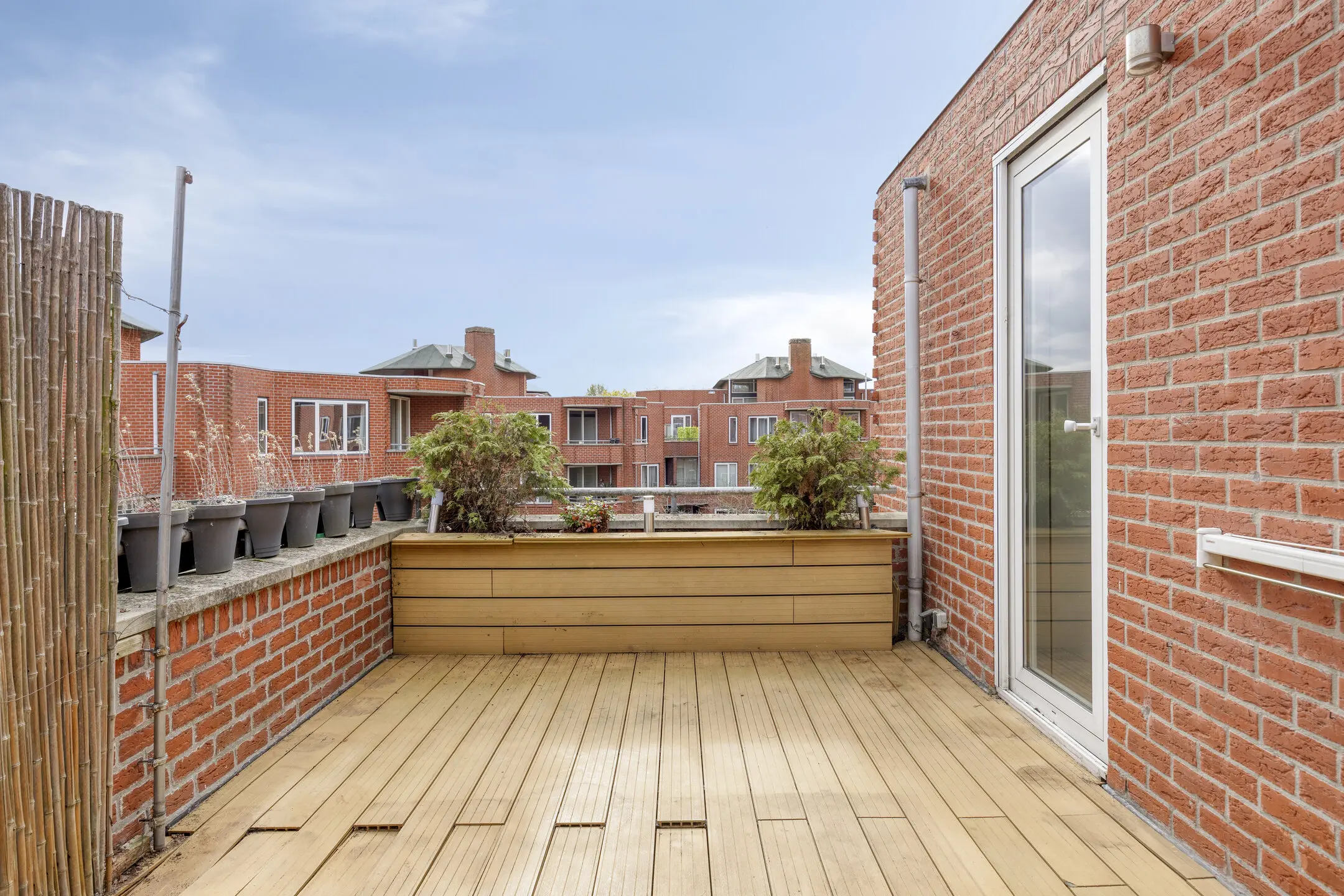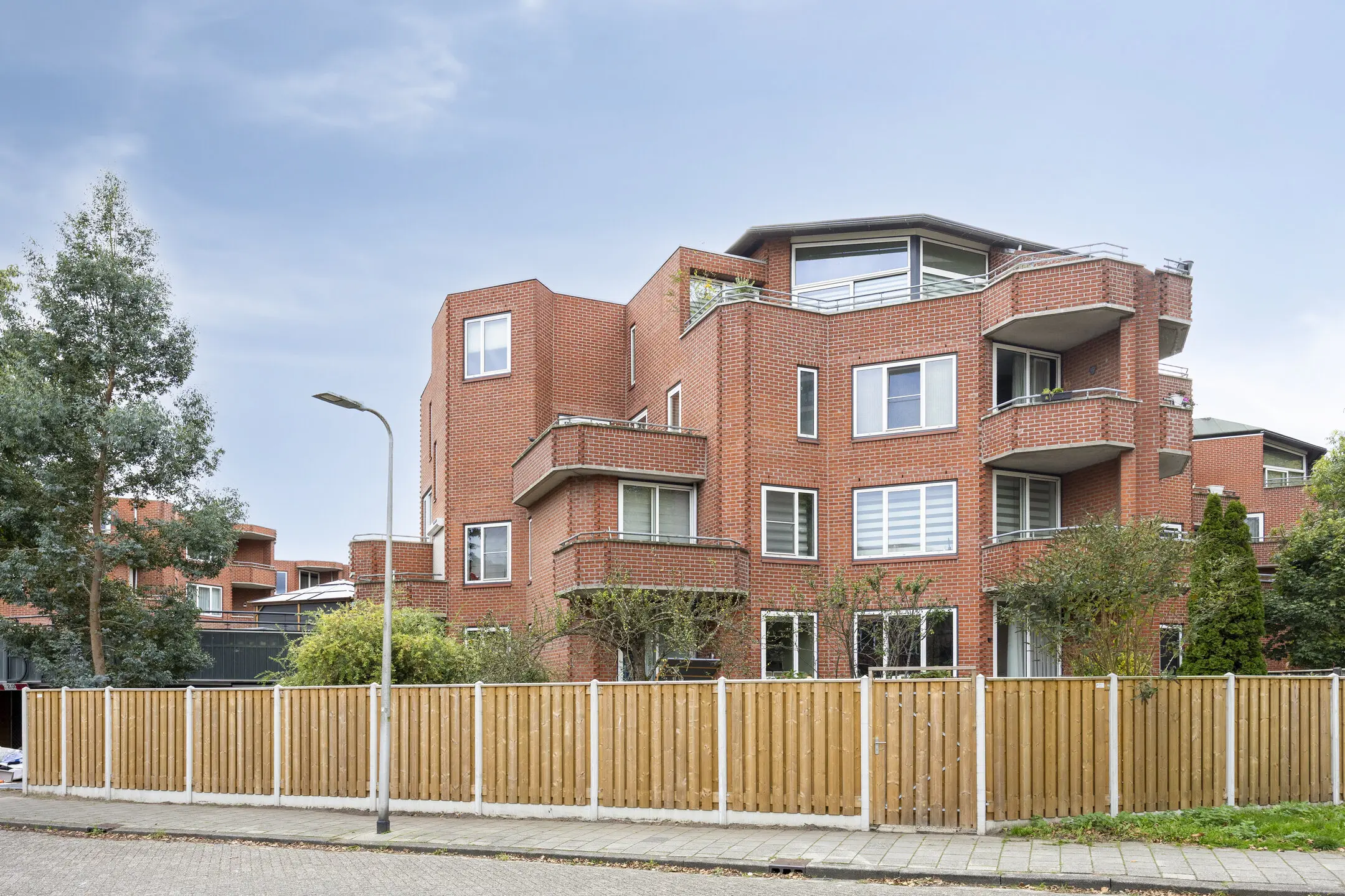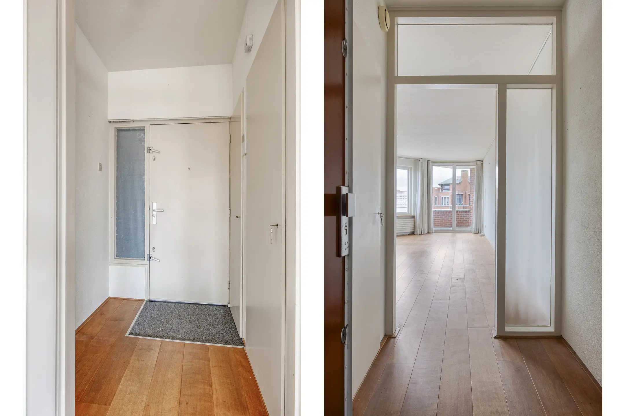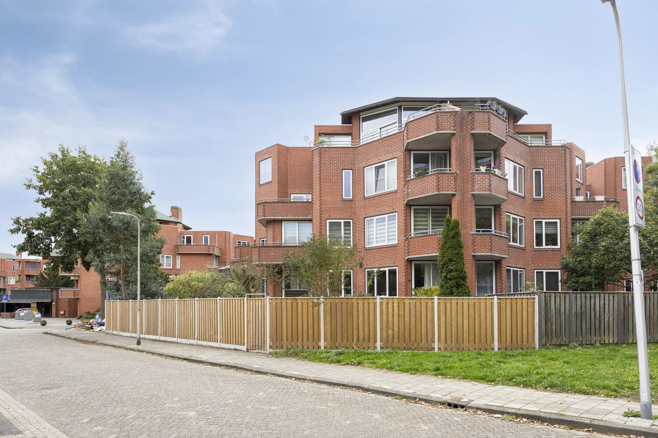 Entree, hal met videofoon en meterkast. Vaste kast met de C.V.-combi-ketel en warmte-terugwininstallatie. Deur met glas inzet maar de ruime en lichte woonkamer speelse indeling en schuifpui naar het aan de woonkamer grenzende balkon. De witte keuken met donker aanrechtblad is geplaatst in L-opstelling en is uitgerust met een keramische kookplaat, RVS afzuigkap (recirculatie), vriezer, vaatwasmachine, combi-oven en koelkast met vriesvak. Het plafond in de keuken is verlaagd en voorzien van inbouwspots. De slaapkamers zijn beiden kamers van een fijn formaat en ze hebben tevens allebei een deur naar het ruime terras en openslaande ramen. In de woonkamer, keuken, hal en de kleinere slaapkamer ligt een fraaie houten vloer, welke drempelloos is doorgelegd. In de grootste slaapkamer ligt een laminaatvloer. De geheel in wit/grijze kleurstelling betegelde badkamer is uitgerust met een douche met regen- en handdouche, wastafelmeubel, spiegel met verlichting, design radiator. In de badkamer zijn ook de aansluitingen aanwezig voor de wasmachine en droger. In dezelfde kleurstelling betegelde toiletruimte met een wandcloset en fonteintje.