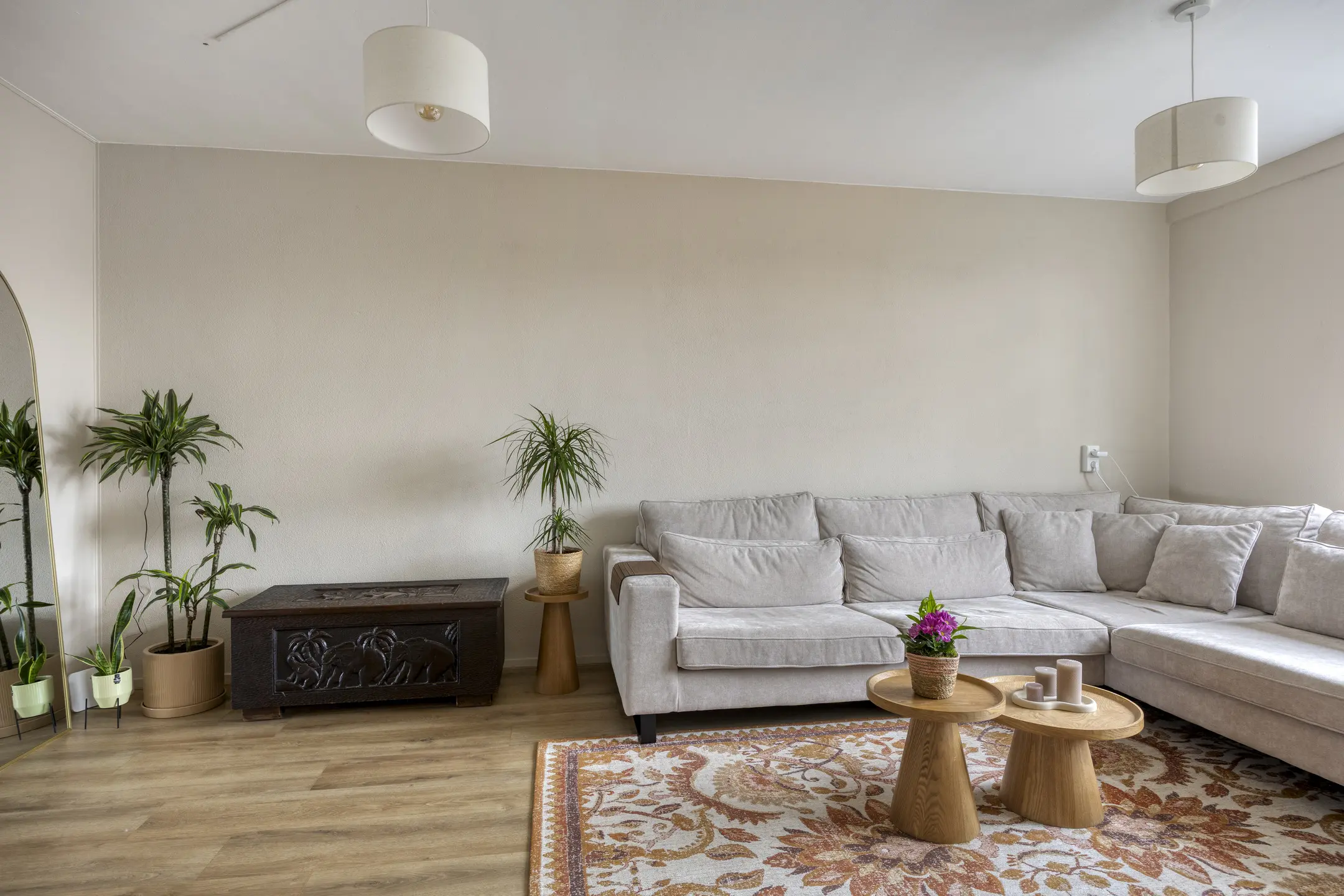 De woonkamer is ruim en aangenaam licht dankzij de grote raampartijen aan weerszijden. Hier is volop plek voor een comfortabele zithoek.
