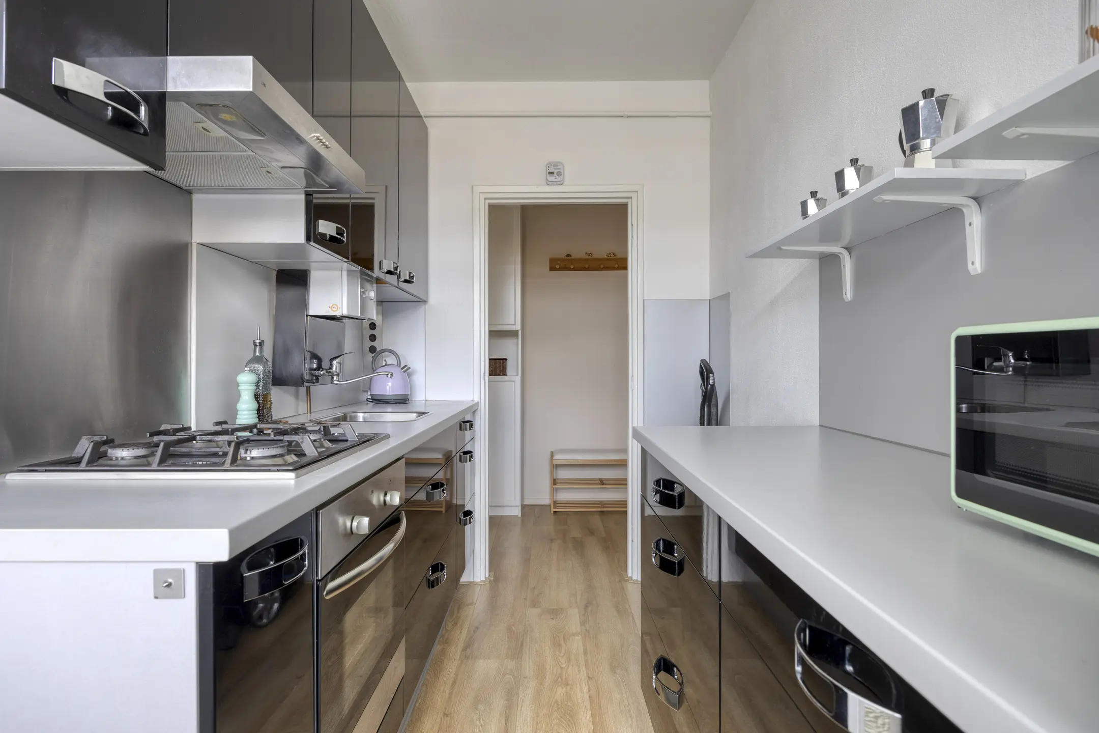De moderne keuken is voorzien van diverse inbouwapparatuur en geeft toegang tot de badkamer. De badkamer beschikt over een douche, wastafel en aansluitingen voor de wasapparatuur.