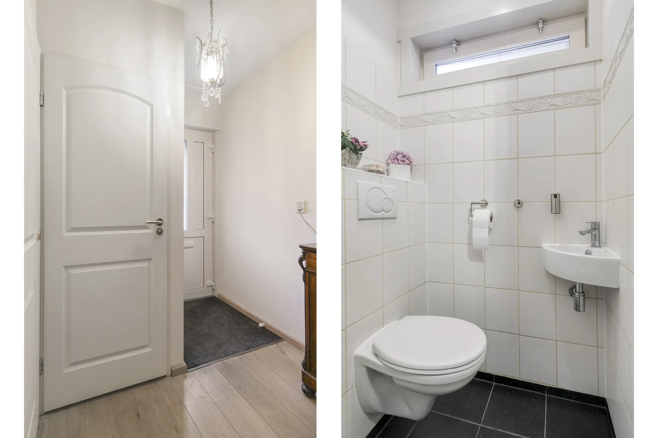 Entree/hal met meterkast, trapopgang naar de eerste verdieping en toilet met fontein.
