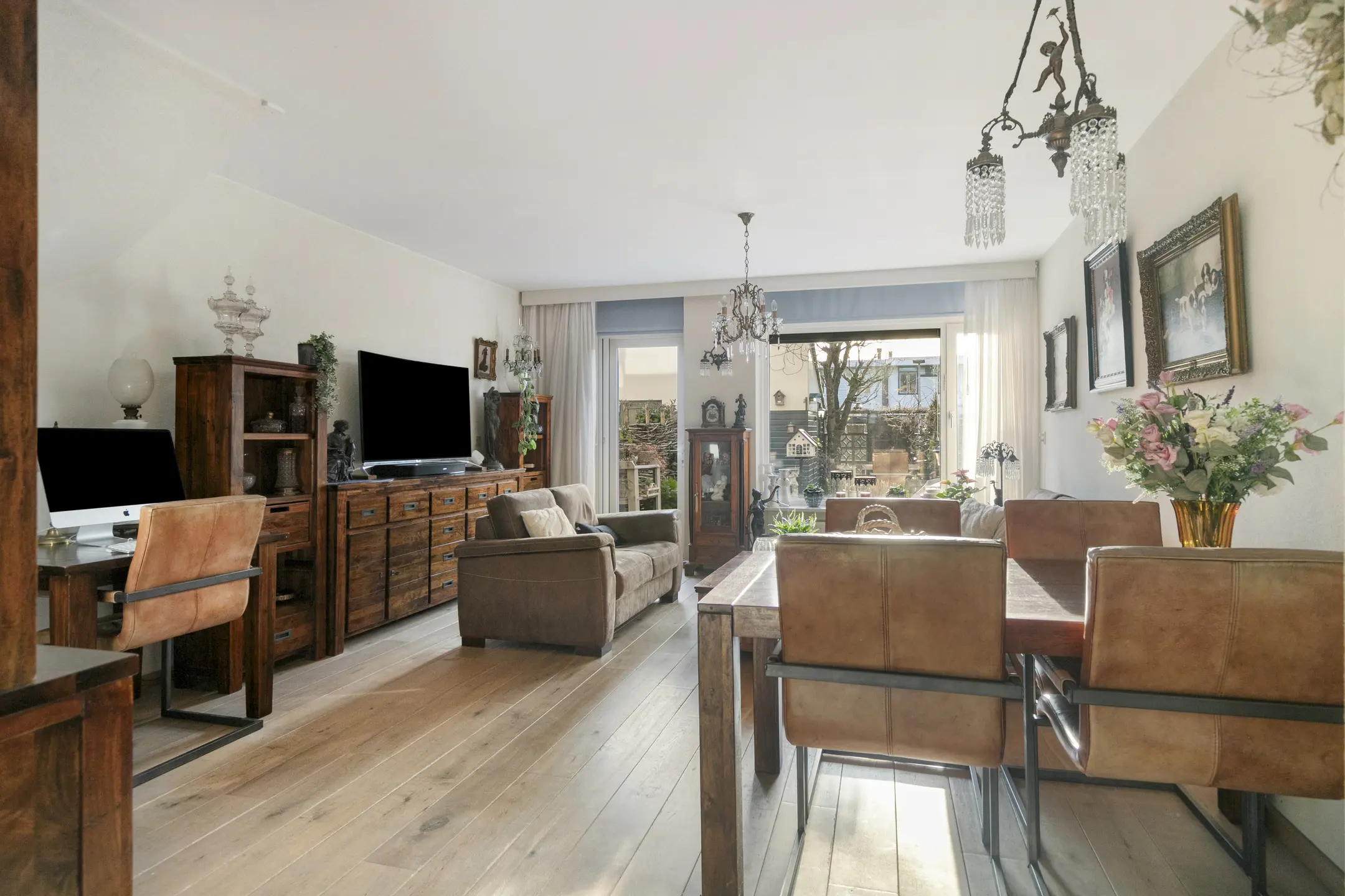 De ruime tuingerichte woonkamer heeft een goede lichtinval oogt heerlijk licht vanwege de grote raampartijen.