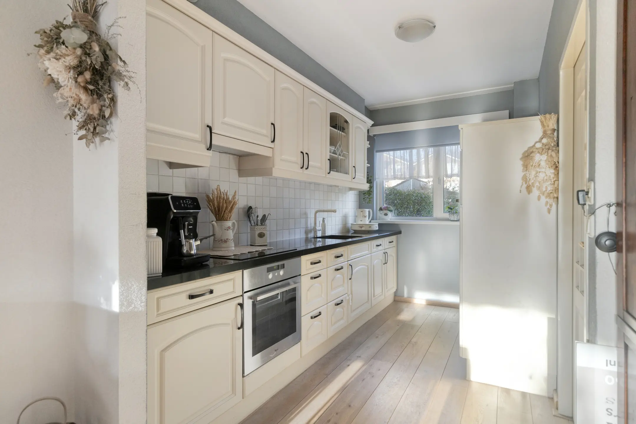 De open keuken aan de voorzijde van de woning is voorzien diverse inbouwapparatuur zoals een inductie kookplaat, een afzuigkap, een oven, een magnetron en een koel-vriescombinatie.