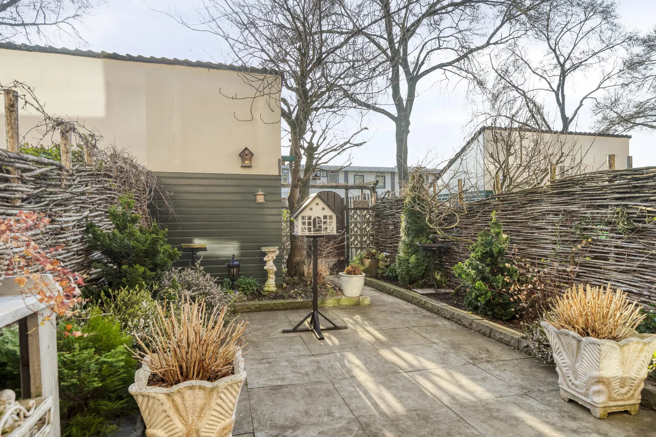 Via de woonkeuken bereik je de diepe op het zuidwesten gelegen achtertuin, deels volledig bestraat en deels groen aangelegd, met een praktische achterom die uitkomt bij een leuk speeltuintje.