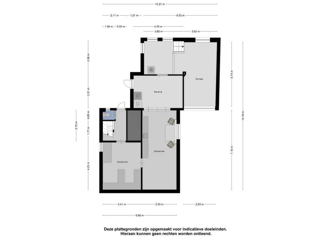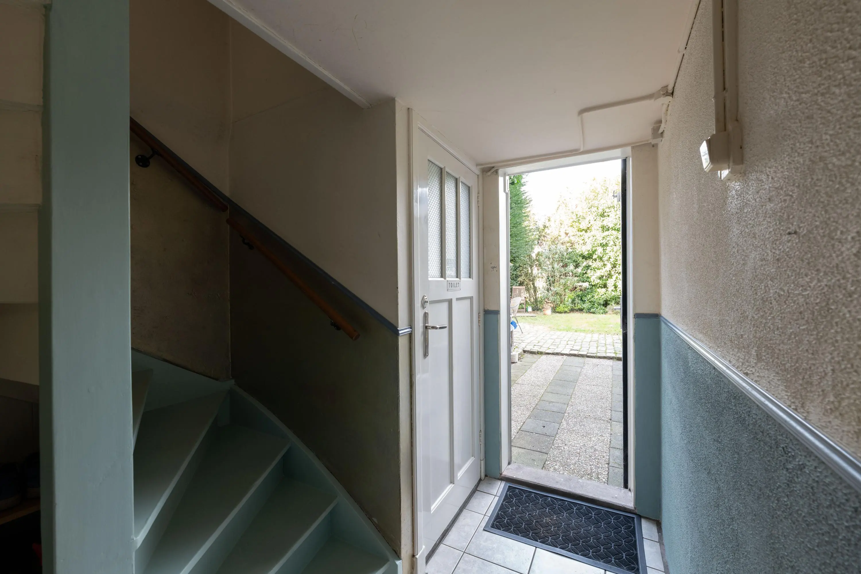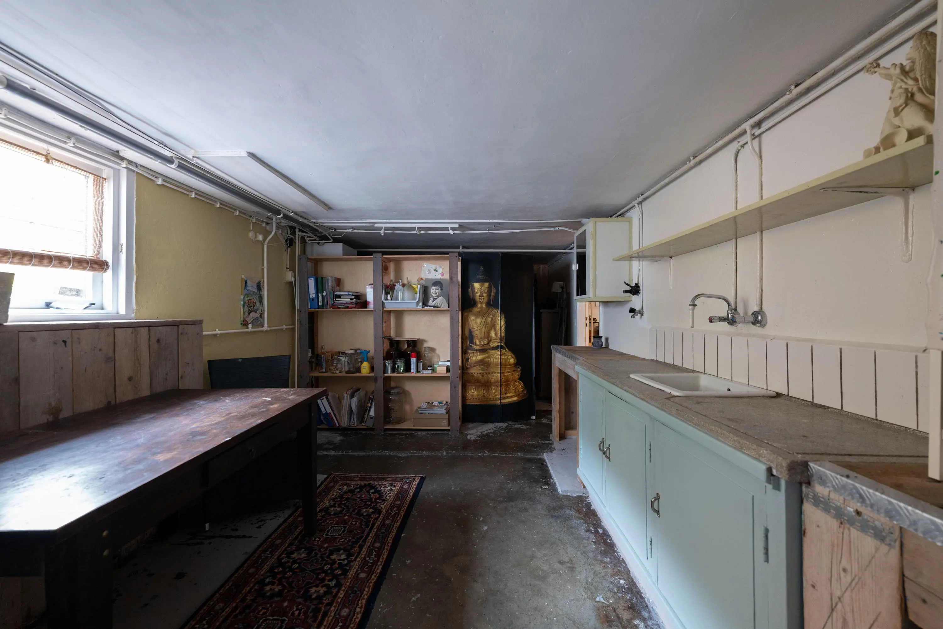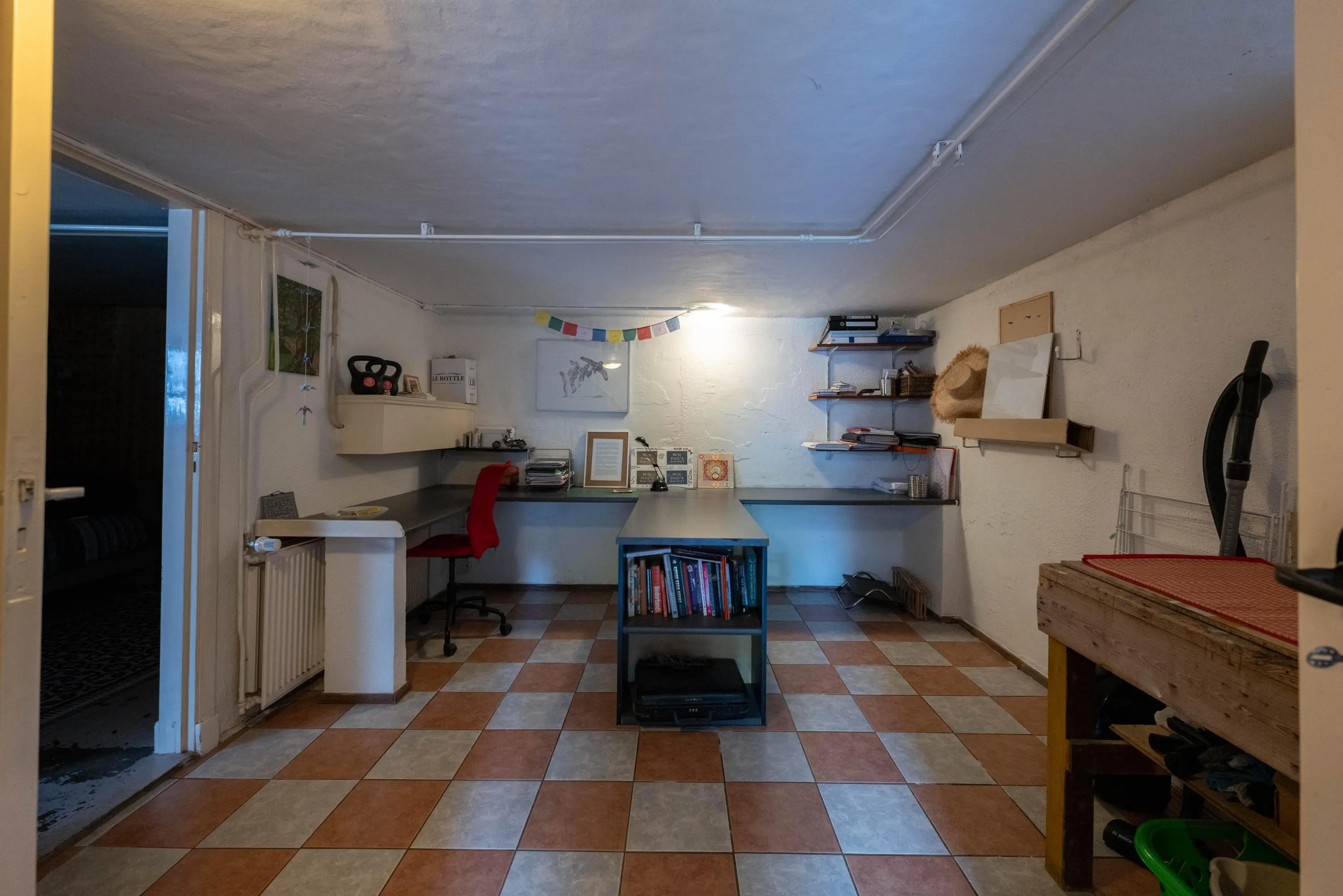 Vanuit de keuken ga je naar het ‘onderhuis’. Hier is een hal met toiletruimte en achterdeur naar de tuin. Het souterrain heeft 2 kamers welke ingericht zijn als een werkkamer en als tweede keuken. Deze ruimten worden verwarmd door middel van radiatoren. Aan de achterzijde is een berging/bijkeuken met wasmachine- en drogeropstelling en een achterdeur naar de tuin. Daarachter is een berging vanwaar je inpandig naar de garage gaat.