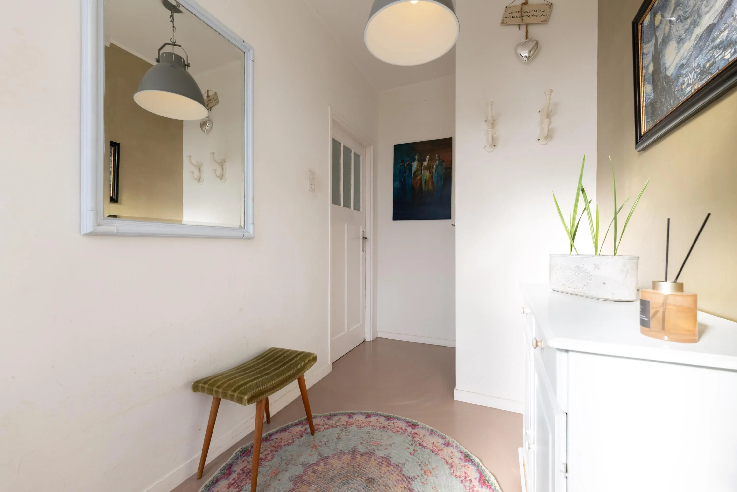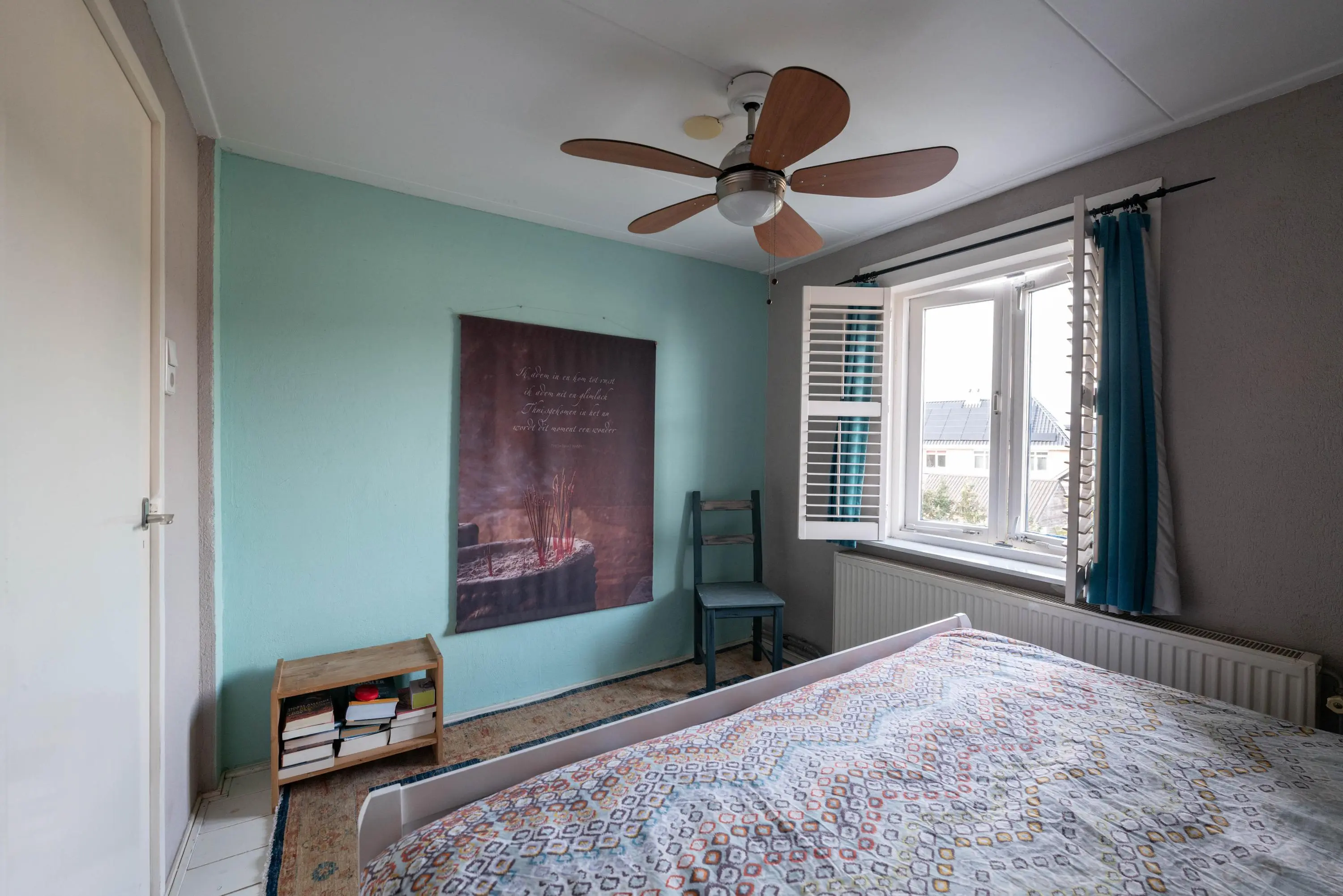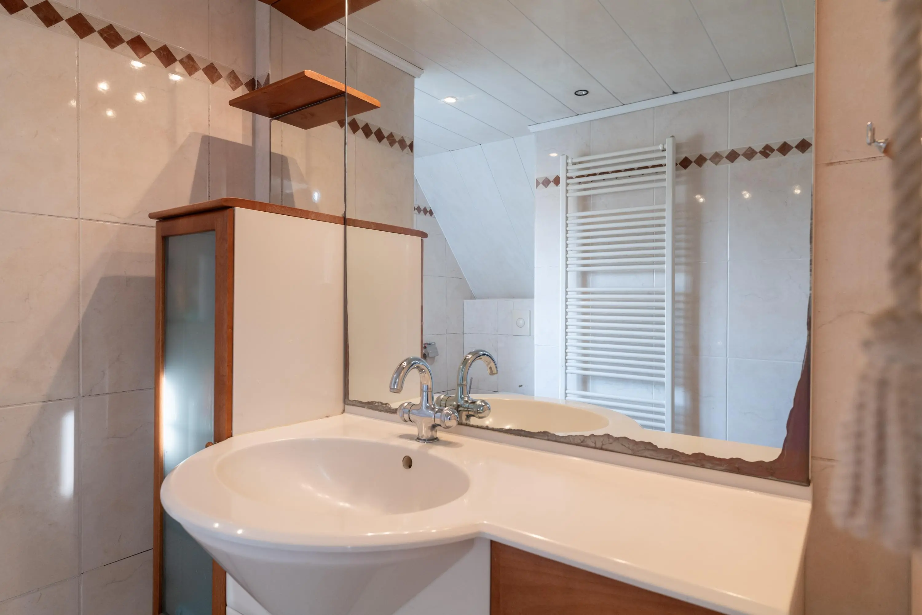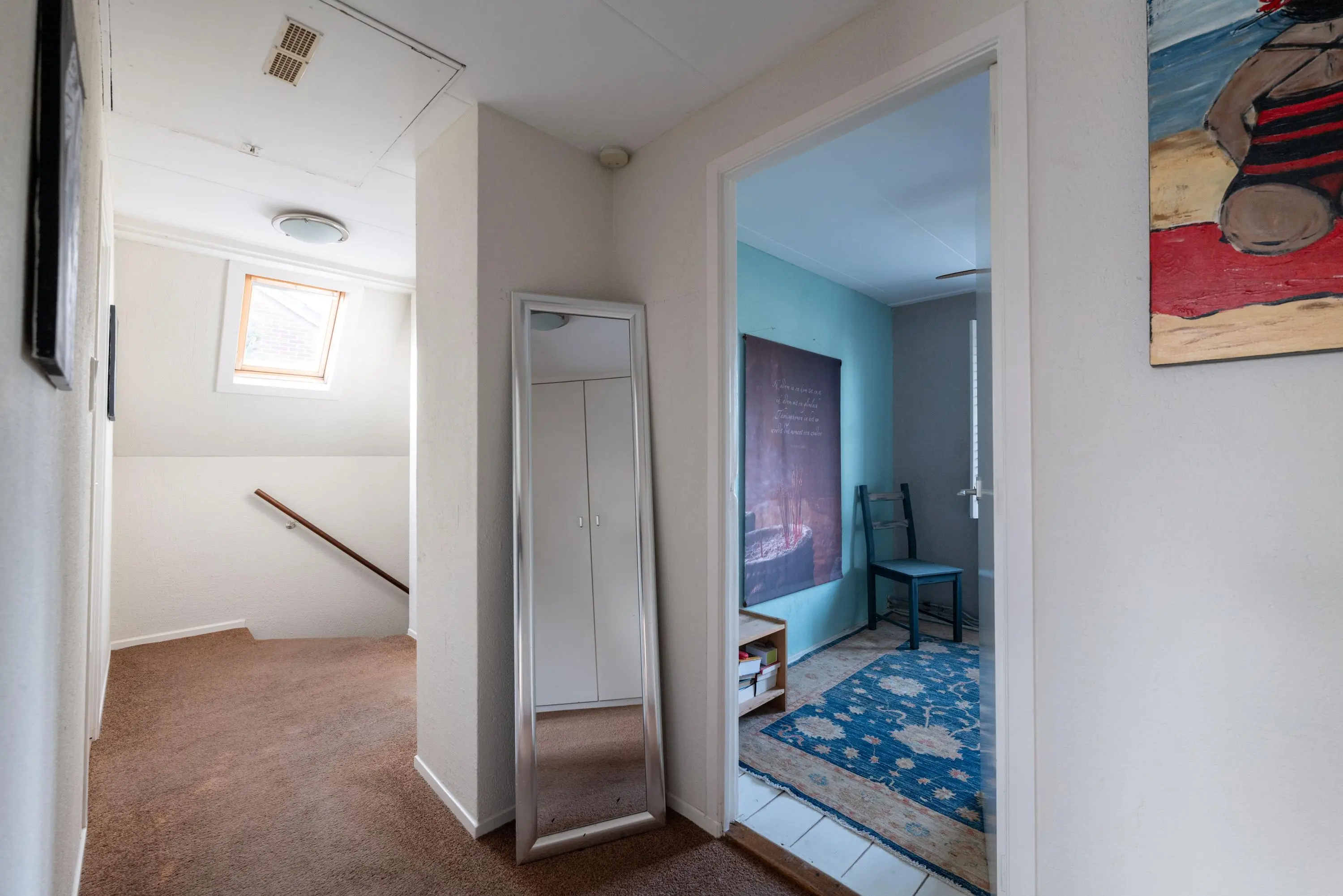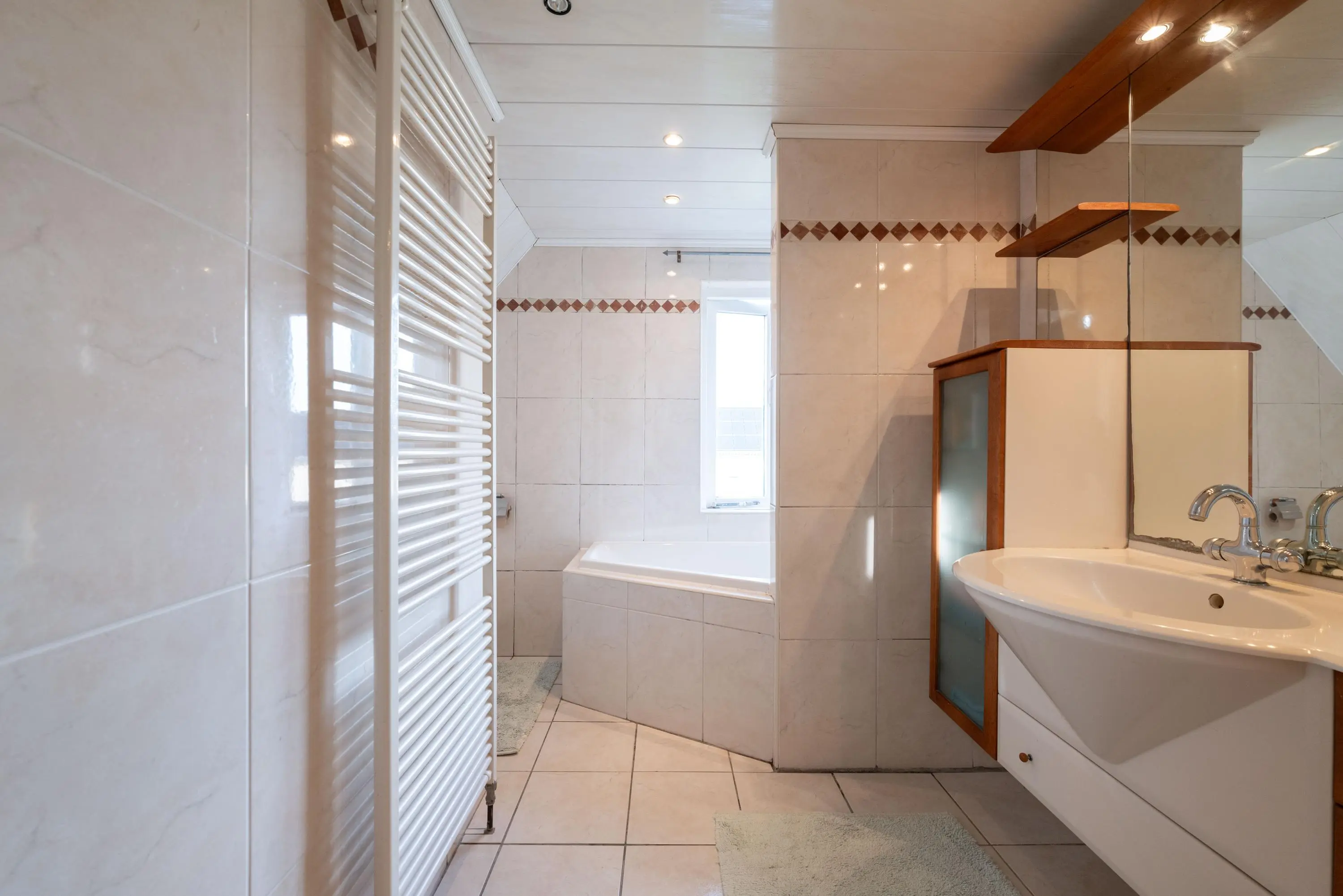 De overloop geeft toegang tot de 3 slaapkamers en de badkamer op deze woonlaag. Op de overloop is ook een kastruimte aanwezig. Aan de voorzijde 2 slaapkamers waarvan 1 is ingericht als kastenkamer. De geheel betegelde badkamer heeft een ligbad met douche, 2e toilet en een wastafelmeubel met designradiator. Het plafond is voorzien van inbouwverlichting.